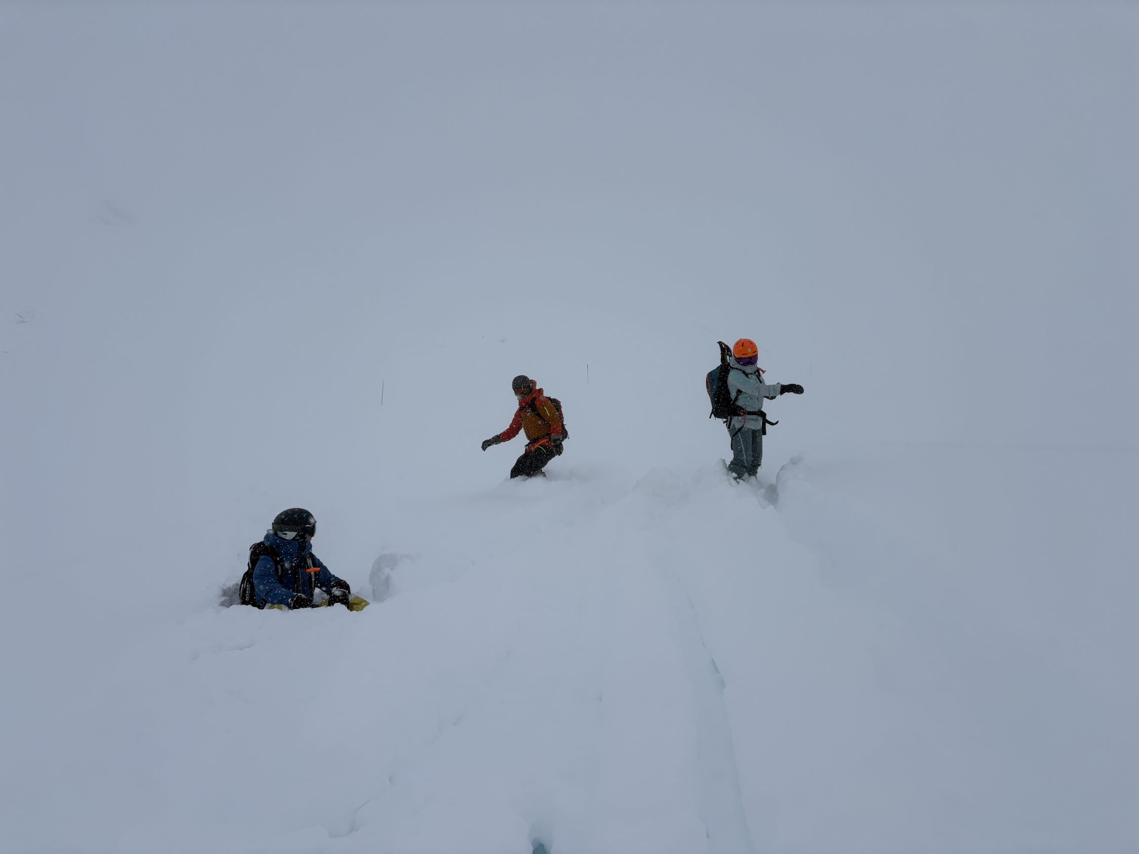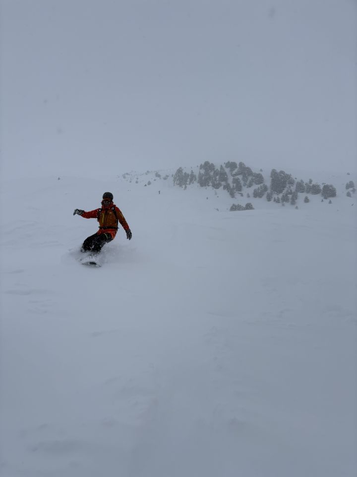 Die Beschreibung für gut, bezieht sich auf den nun vorhandenen Neuschnee. Entschieden zu viel Wind und kaum Sicht oberhalb 2500m. So blieben wir im Gebiet zum Freeriden. Schon bei der ersten Fahrt im Gebiet ein Wummergeräusch vernommen auf ca. 2400m. Die Sicht am Morgen halbwegs noch gut unterhalb 2500m, sodass man den Pulver von gut 30cm geniessen konnte. Aber unterhalb 2250m liegt der Neuschnee auf hartem bis keinem Untergrund. Unterhalb 1700m aktuell zu wenig Schnee, der auch wegen seiner Pulverform schon schnell mal abgefahren wird.