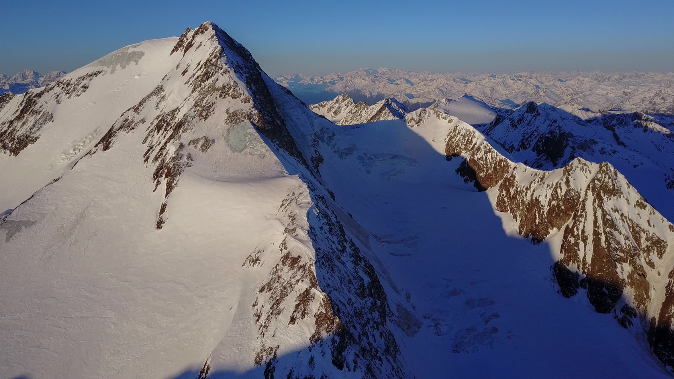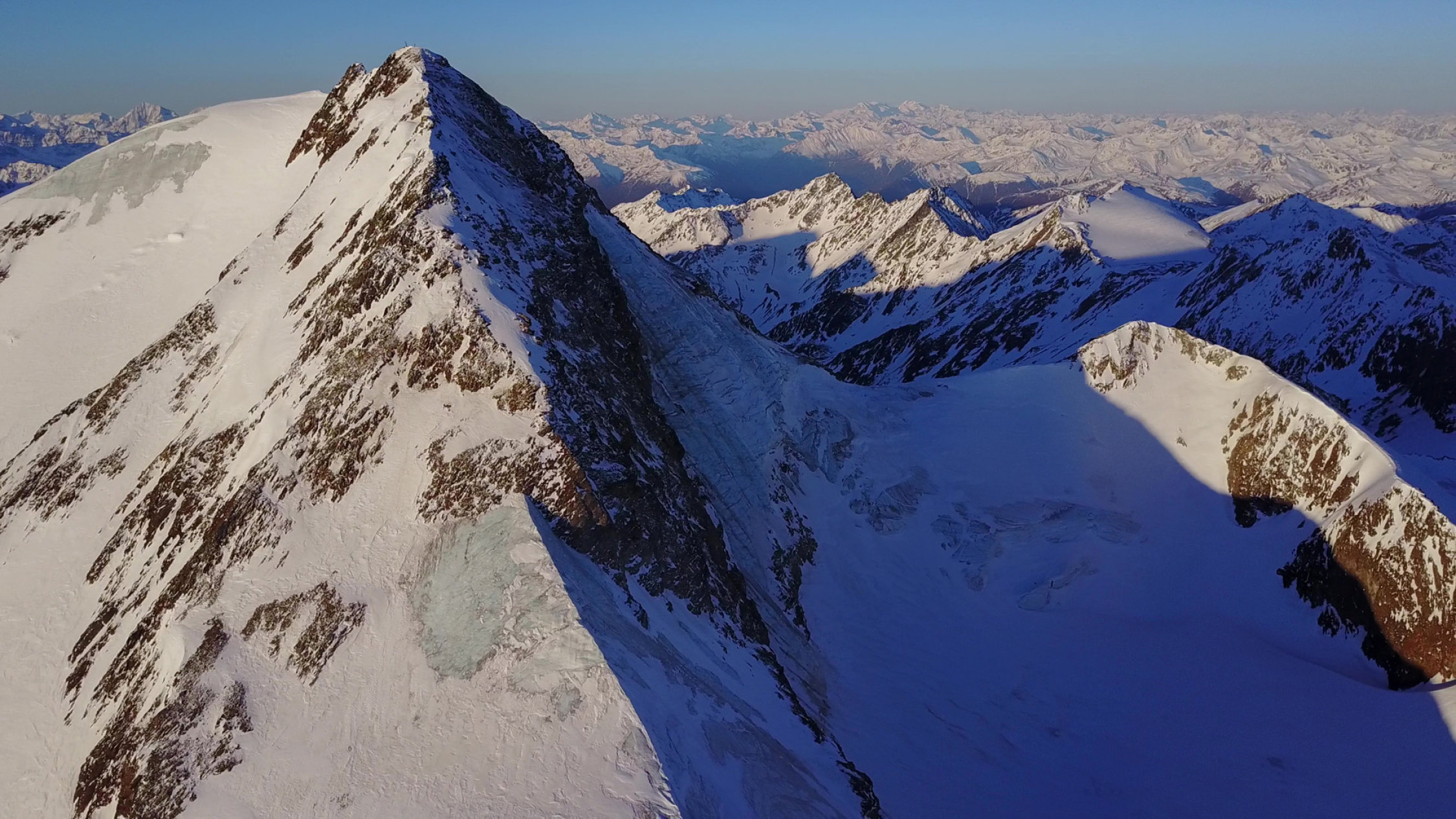 Leider jedoch im ganzen Gebiet sehr wenig Schnee, Flanken alles Blankeis auch N-seitig, siehe Bilder. Die Gletscher sind jedoch gut eingeschneit ! Eigentlich fast Sommerverhältnisse, auch alle Felsen trocken.