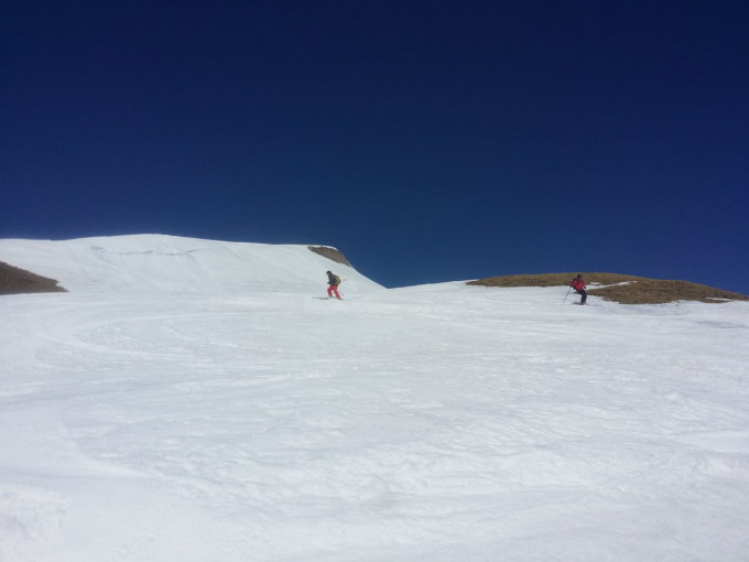 Abfahrt vom Gipfel nach S direkt ins Valrossa mit perfektem Sulz. Letzter Hang vor der Lücke bei P. 2626 ziemlich steil. Danach wieder genussvolle Schwünge bis ca. 2400.