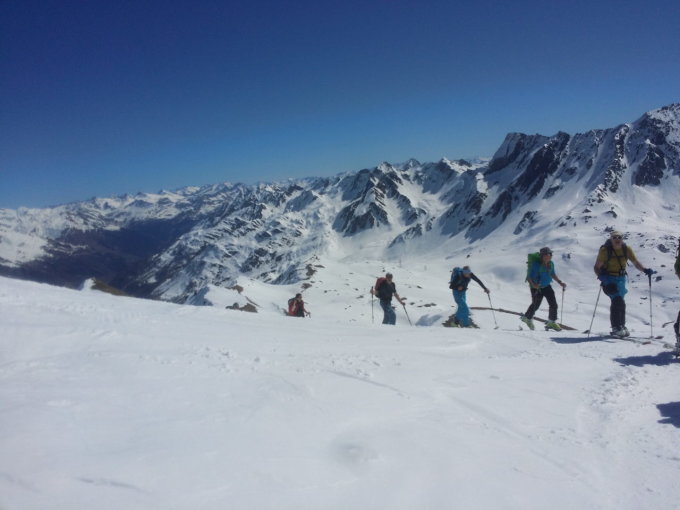 Zusätzlicher Aufstieg zur Lücke zwischen Corno Brunni und Griesshorn und Abfahrt zum Rifugio Maria Luisa. Schnee in den Osthängen noch nicht durchgefirnt aber doch sehr schön fahrbar.