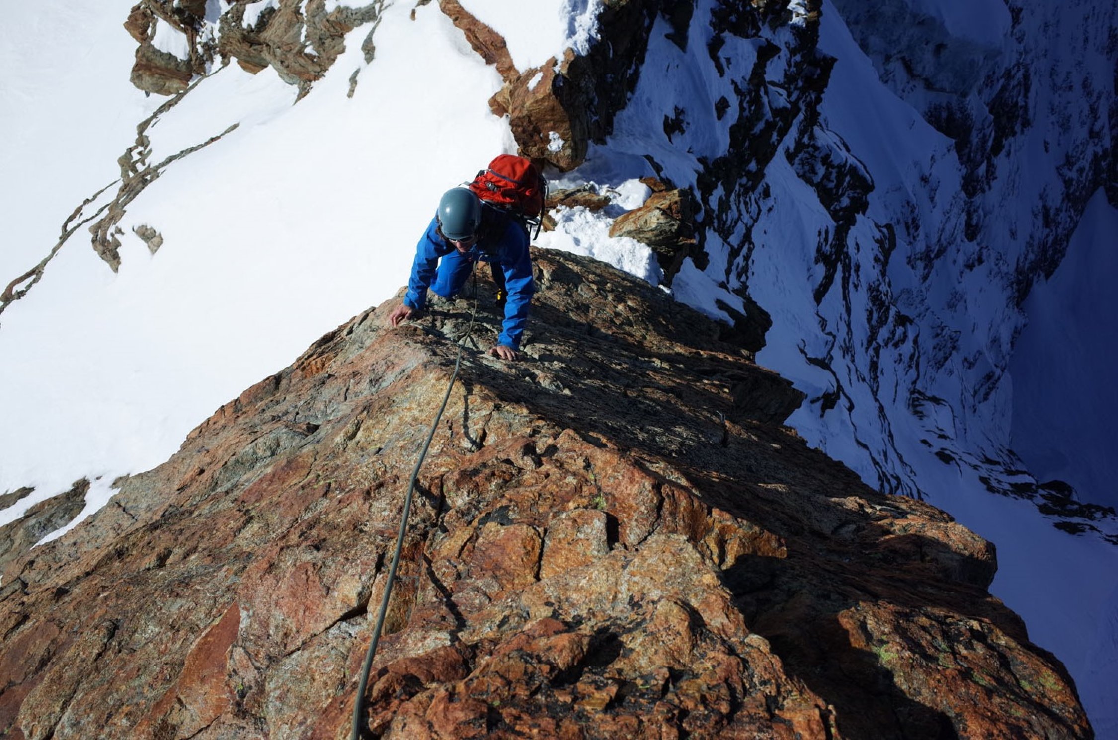 Sehr gute Verhältnisse. Die Felspartien waren allesamt trocken und angenehm zu klettern. In den steileren Passagen lag idealer Trittschnee. Die flacheren Passagen waren teilweise zwar etwas weich, aber dank der Spur problemlos zu gehen. Der Gipfelgrat von SO hatte eine sehr schöne Spur und sah gut machbar aus.