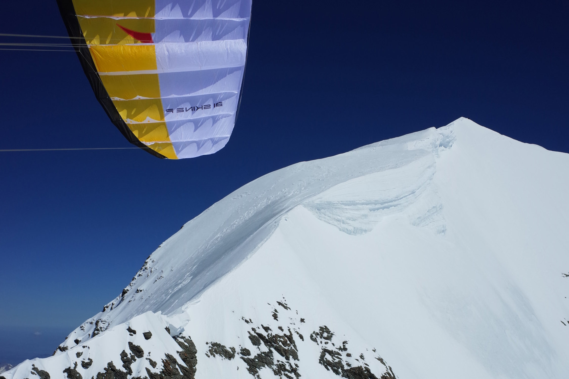 Wir sind mit dem Biplace-Gleitschirm runter nach Grindelwald geflogen. Die Verhältnisse SW unter dem Gipfel waren mit knöcheltiefem Presspulver ideal und recht sicher zum Starten (Möglichkeit zu Startabbruch).
