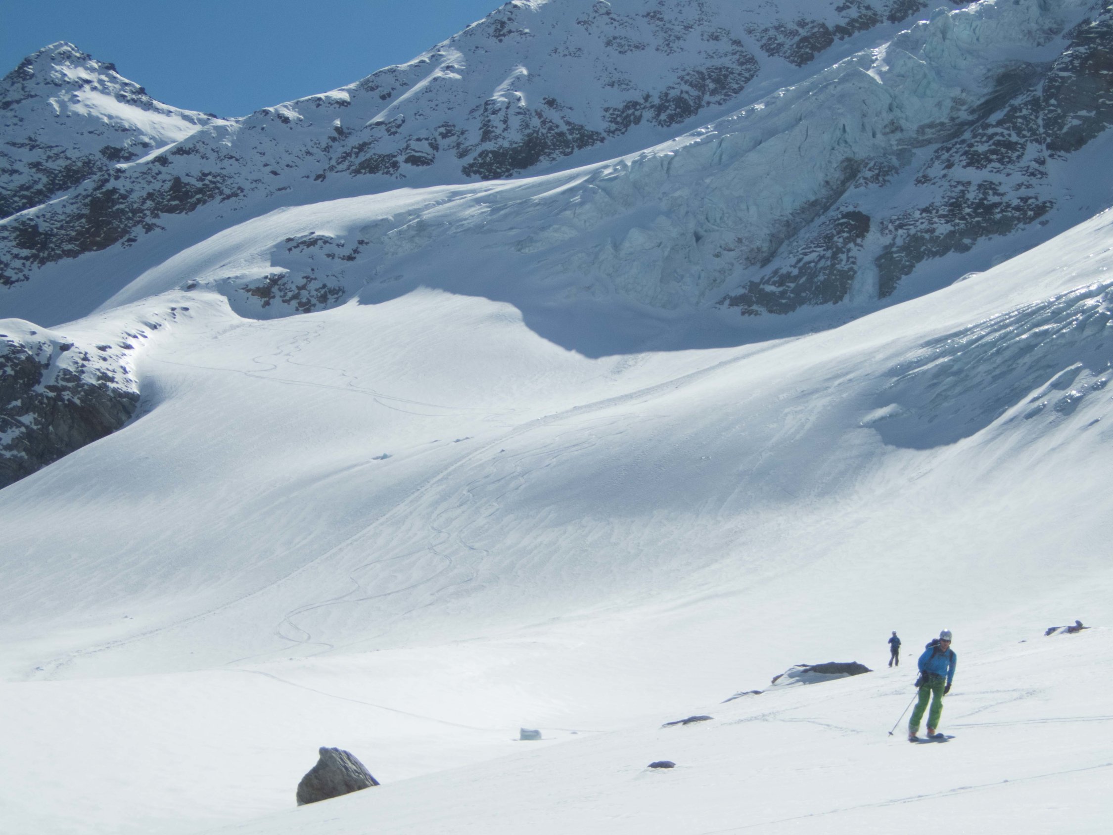 Wir sind den Balfringletscher von 3400 - 3000m am Seil abgefahren, da die Spalten dieses Jahr nur mässig zugedeckt sind.