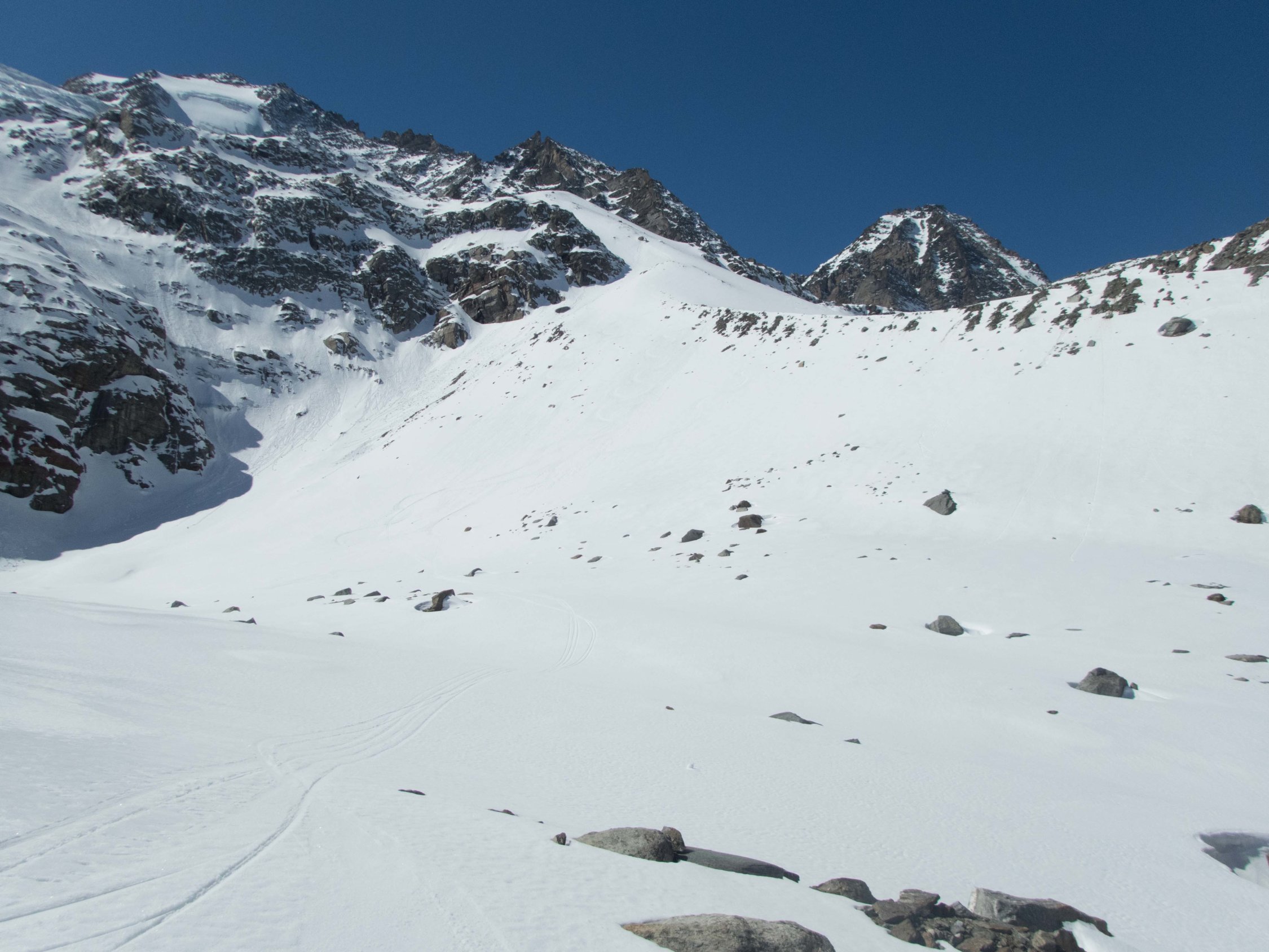 Die Abfahrt vom Balfrin ins Saastal ist eine Route von herausragender Schönheit. In wilder Umgebung und totaler Einsamkeit sind die Hänge auf 700 Höhenmetern durchgehend 35 - 40 Grad steil sind. Sehr empfehlenswert!