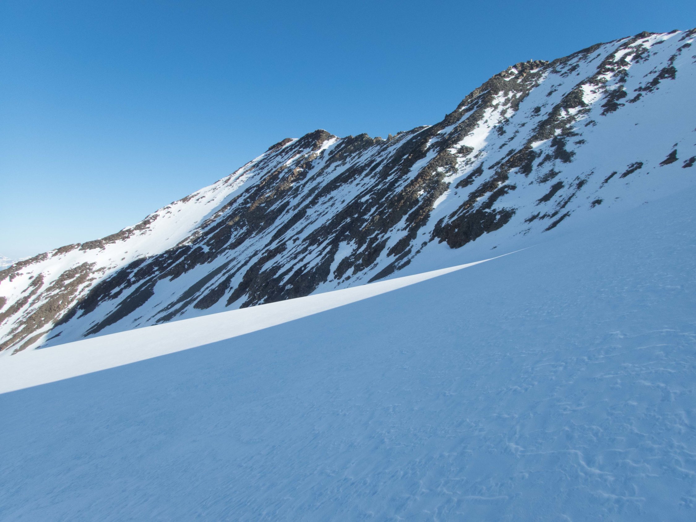 Die Skitourennormalroute auf den Balfrin ab Bordierhütte ist zur Zeit nicht begehbar. In der Balfrinflanke liegt zuwenig Schnee für eine sinnvolle Skibegehung. Der von uns gewählte Weg über den S-Grat geht aber bestens.