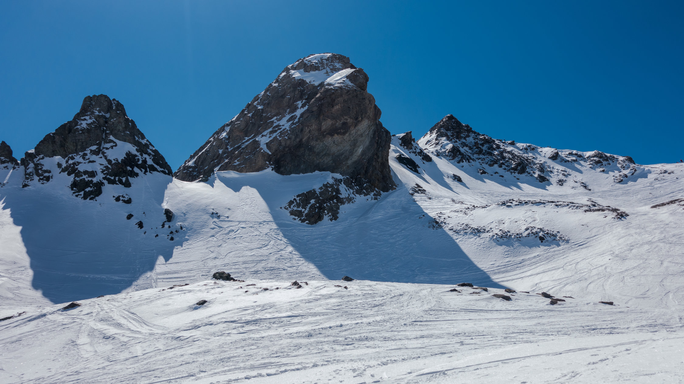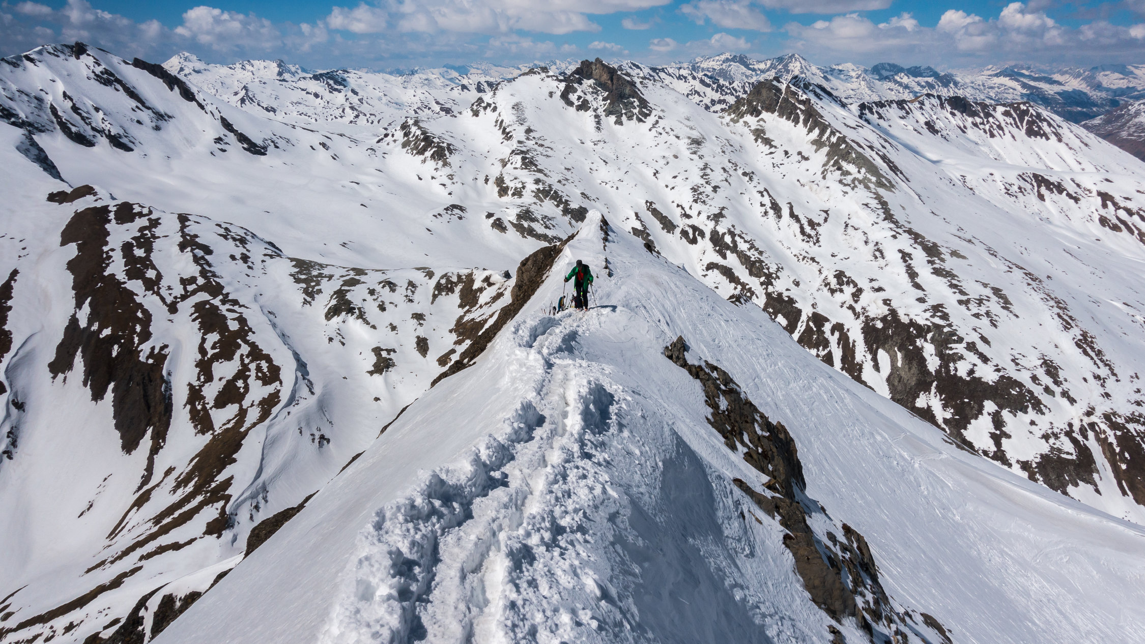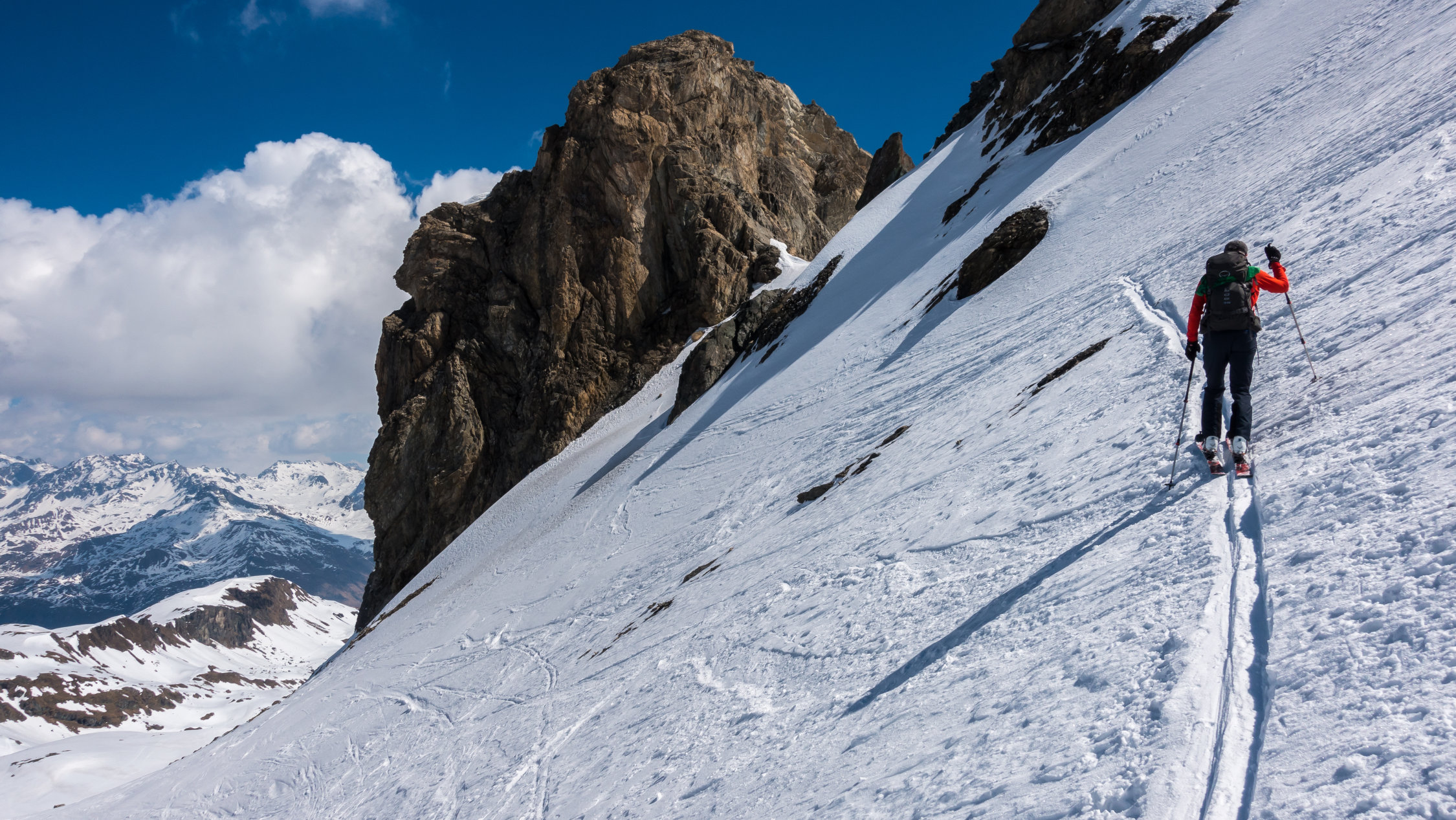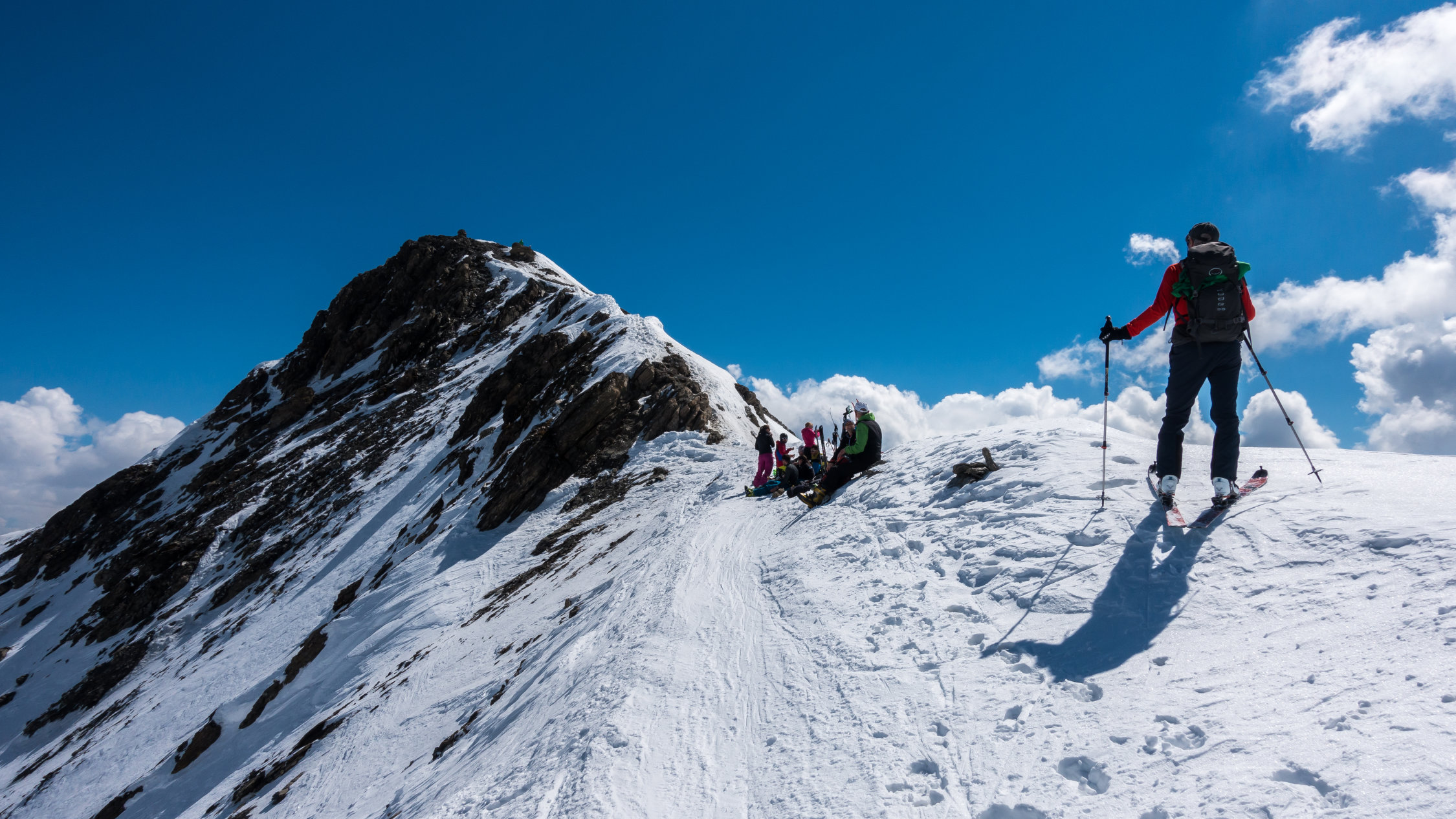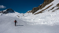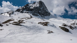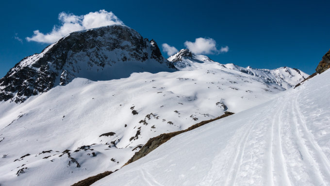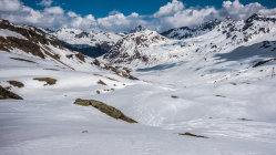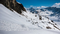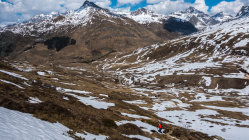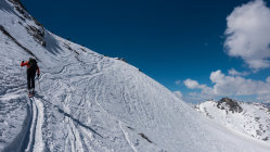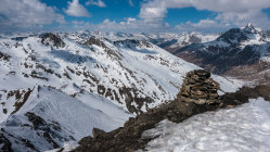 Sehr warmes, sonniges Wetter, windstill. Start um 9.30 Uhr, bei der Bergstation der Bivio Skilifte. Zuerst flacher, am Schlusshang steiler Aufstieg, zuletzt zu Fuss einfach auf weichem Schnee über den kurzen Gipfelgrat zum Gipfel. Im oberen steilen Teil der Abfahrt fest gepresster Pulver, dann schöner Sulzschnee, weiter unten teilweise klebriger Schnee. Im unteren Teil wird das Gelände sehr flach und ab ca. 1900 m praktisch kein Schnee mehr. Wir sind ab dort nochmals ca. 100 m aufgestiegen und dann nach Westen zur Skipiste traversiert. Man könnte auch ab ca. P.2136 nochmals hochsteigen zur Bergstation des Skiliftes auf 2560 m und dann die Skipiste bis nach Bivio hinunter fahren.