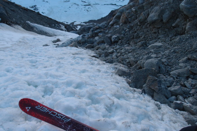 Oben geht die Saison noch; wir sind am SA von der Tierberglihütte zur Trifthütte: beim Triftsee wird es sehr bald keinen Schnee mehr in den steilen Couloirs geben. Dann wird es dort sehr unangenehm in dem losen Geröll. Wir konnten gerade noch auf einem schmalen Schneeband von Zwischen Tierbergen bis zum Triftsee abrutschen. Aufstieg zum Trifttelli im unteren Teil mit Steigeisen auf schmalem Schneeband (unter dem das Wasser rauschte).