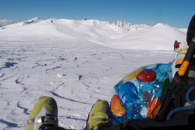 Schnee auf der Winterbergkette ist oben recht windbearbeitet. Unterhalb 3200 m bei der Abfahrt zum Rhonegletscher sehr schön sulzig bei Südexposition.