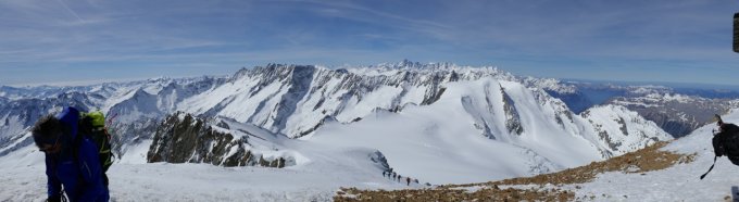 Viel Schnee auf der ganzen Route. Abfahrt 11 Uhr ideal, kalter Wind auf dem Gipfel
