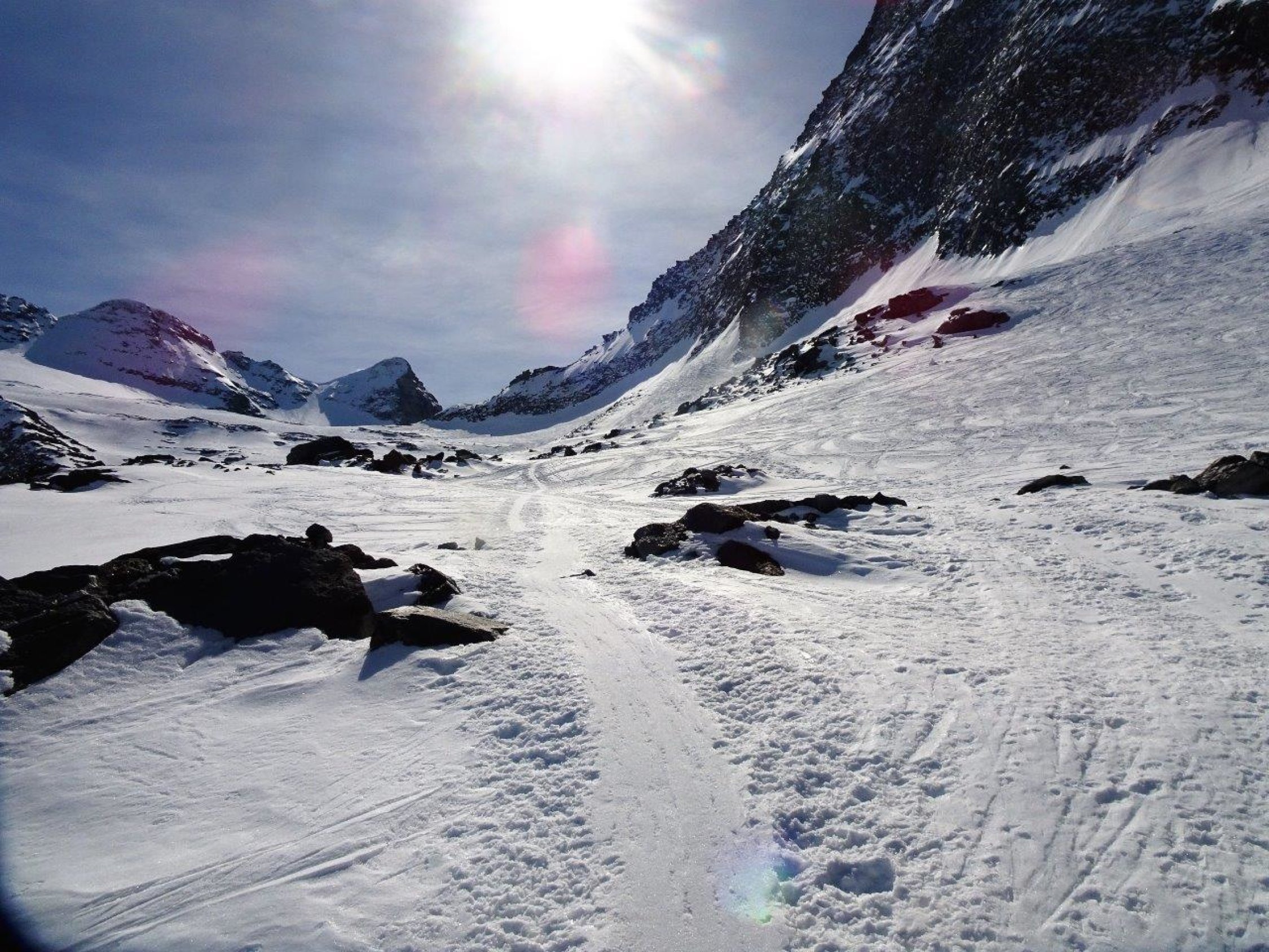 nach der klaren und kalten Nacht hart gefroren vom Pass bis zum Gipfel. Verschiedene Aufstiegsspuren - einige zum Teil glasig. Harscheisen eingesetzt.