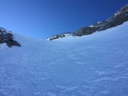 Top Verhältnisse in der Wand. Trotz konstanter Spindrift ist das Spuren nicht schwer gefallen, teils Styroporschnee, teils lockere Auflage auf fester Unterlage. Kein Blankeis. Gipfelfelsen bereits recht aper, könnten aber ost- wie westseitig leicht umgangen werden. Starker Wind auf dem grat zurück zum Vorgipfel.