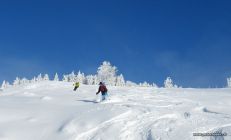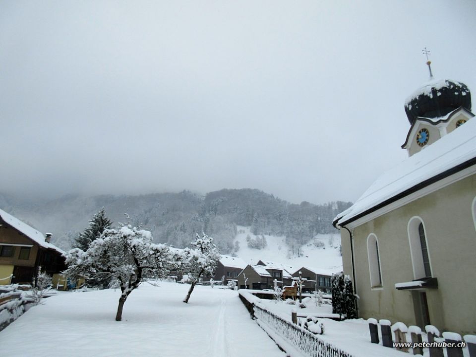 Zweite Abfahrt via Sommerig. Nur wenige bisherige Abfahrtsspuren und toller Pulverschnee. Selten war wenig Untergrund zu spüren. Weiter unten unterhalb 600 m wurde der Schnee schnell feucht. Immer noch gut zu fahren bis zur Kirche hinunter.