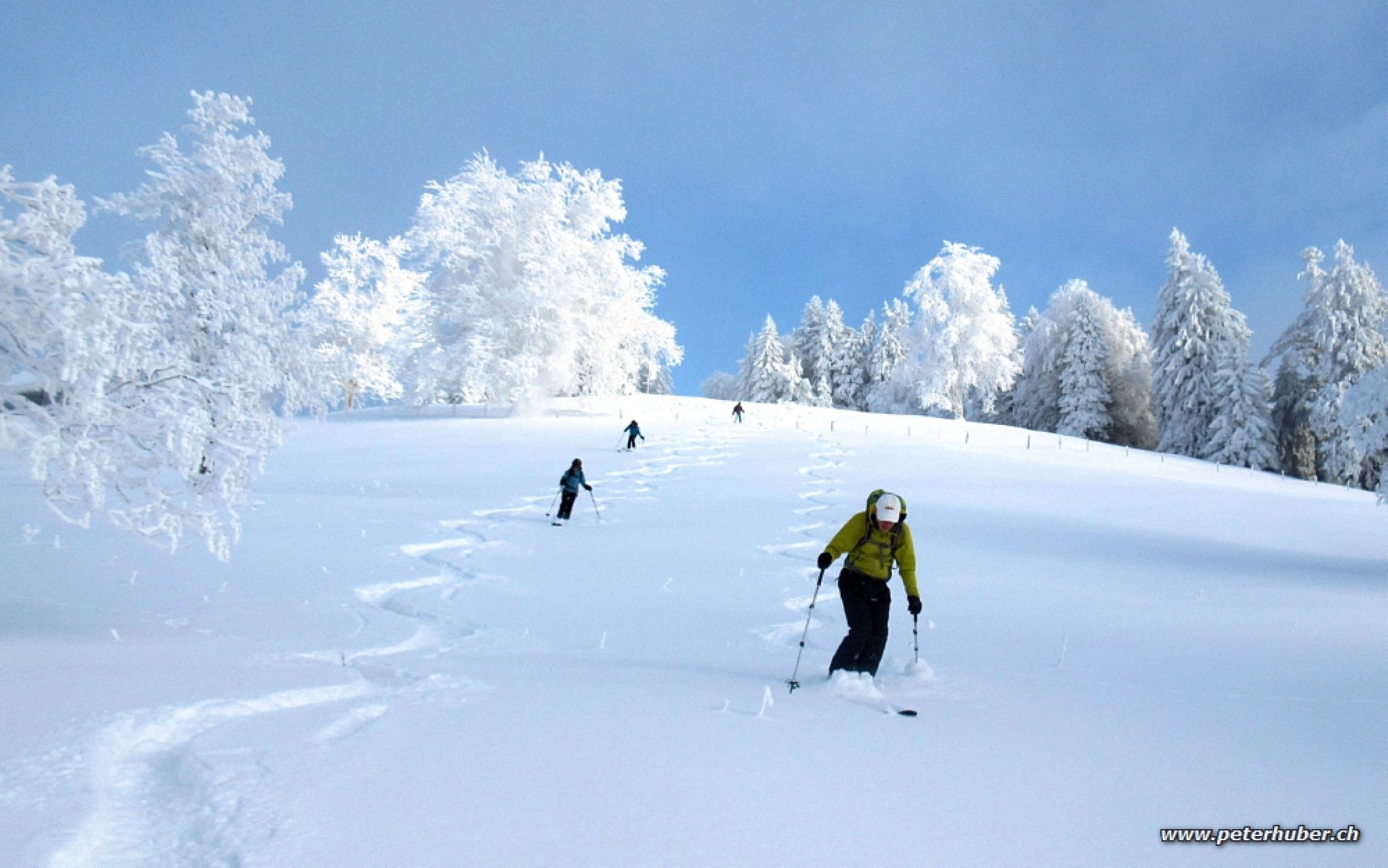 Erste Abfahrt bei tollem Pulverschnee über den breiten Rücken via Niedersteinegg zur Alp Fähberg 950 m. Dann erneuter Aufstieg zum Gipfel.