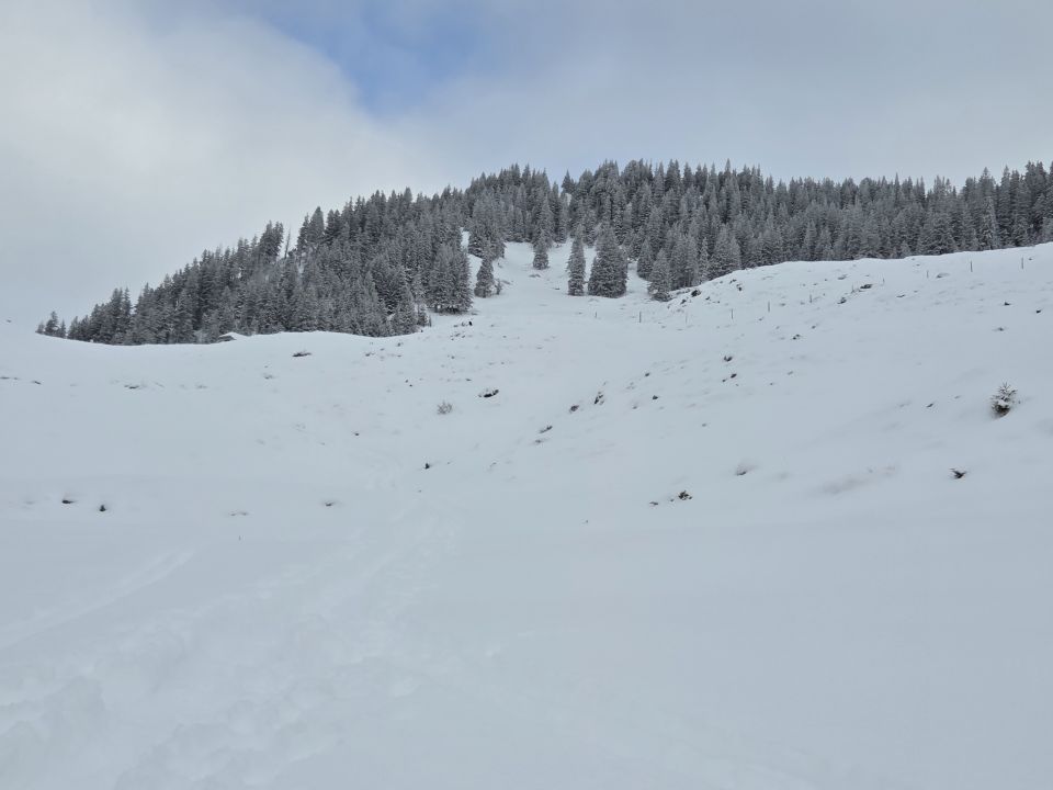 Der steile / enge Aufstieg unteralb P1805 im Wald dann etwas mühsam. Wenig Schnee und Steine.