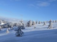 Aufstieg bei leichten Schneefall und -3 Grad um 9.15 Uhr sowie Nebel im oberen Bereich. Jedoch löste sich der Nebel langsam auf und der blaue Himmel zeigte sich immer etwas mehr.
