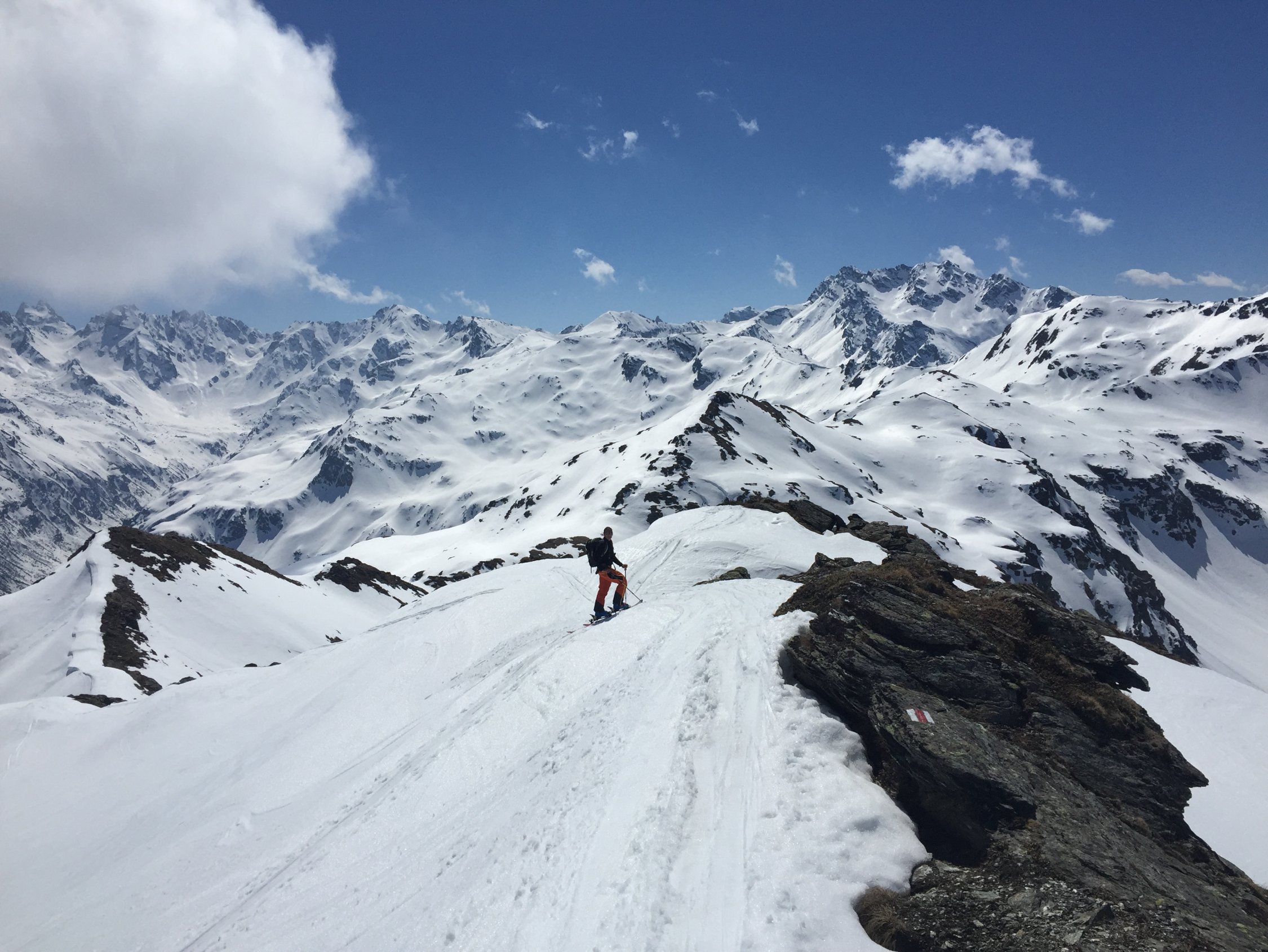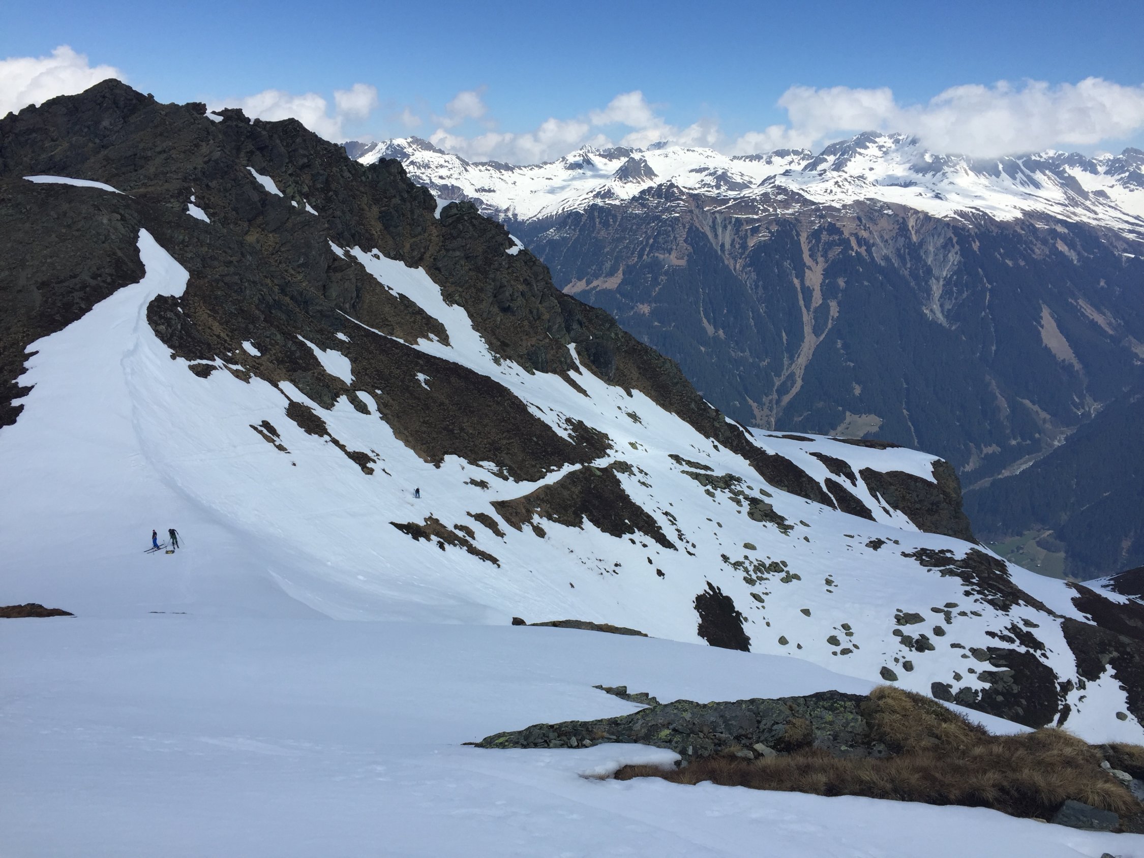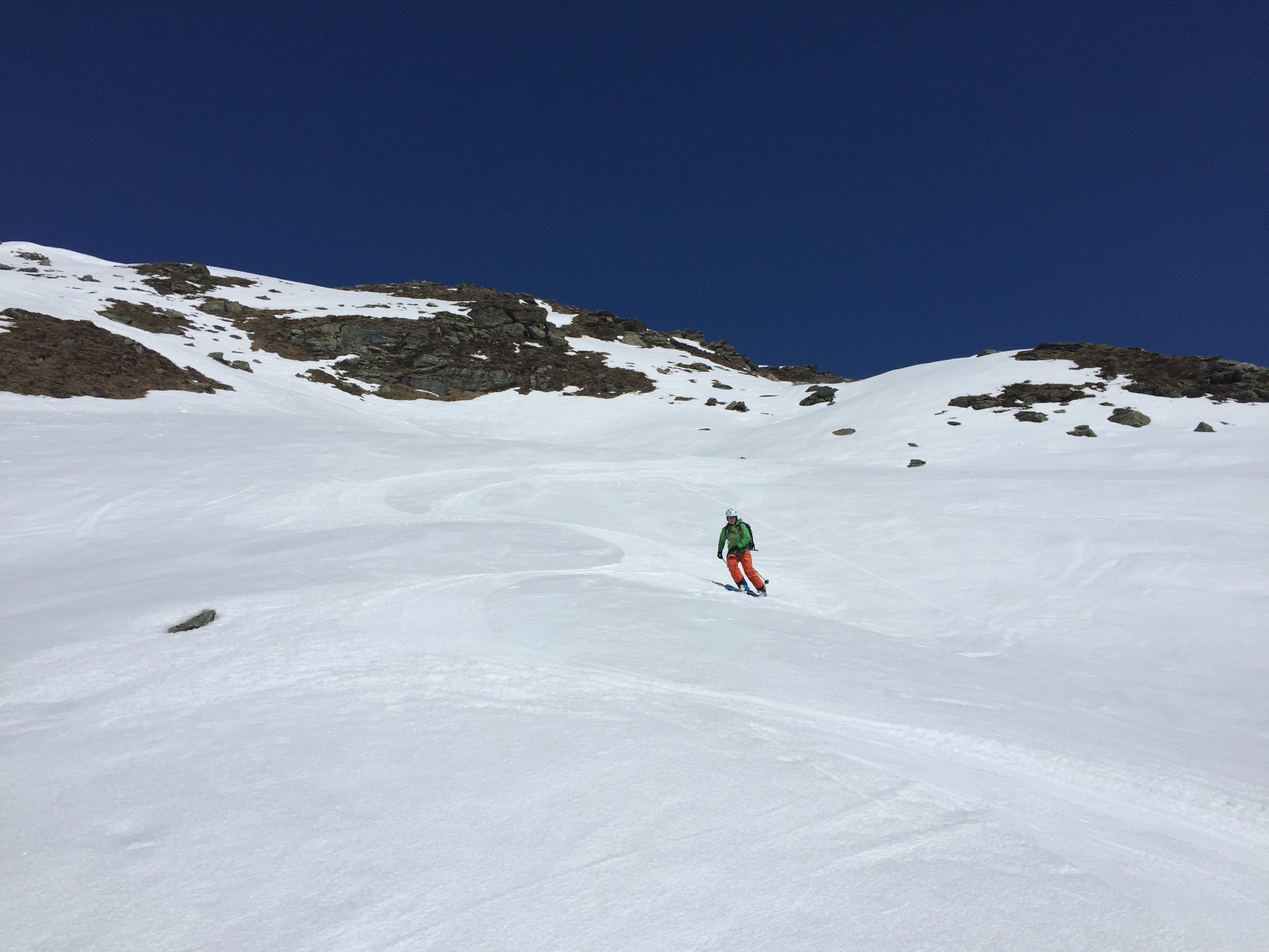 Generell ist die Tour noch gut eingedeckt. Lediglich auf der Südseite um die Burg herum gibt es zwei kurze Unterbrechungen von 2 m. Ansonsten war der Schnee infolge der klaren Nächte und der guten Abstrahlung oberflächlich gut tragfähig. Rein nordseitig ist er sogar mittags noch hart gewesen (auf 2400m), südseitig dann natürlich rasches Auffirnen und mittags dann in steileren Hängen Sumpf. Wir sind am frühen Nachmittag westseitig und durchs Novatal abgefahren und hatten wunderbare Firnverhältnisse.