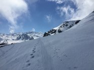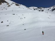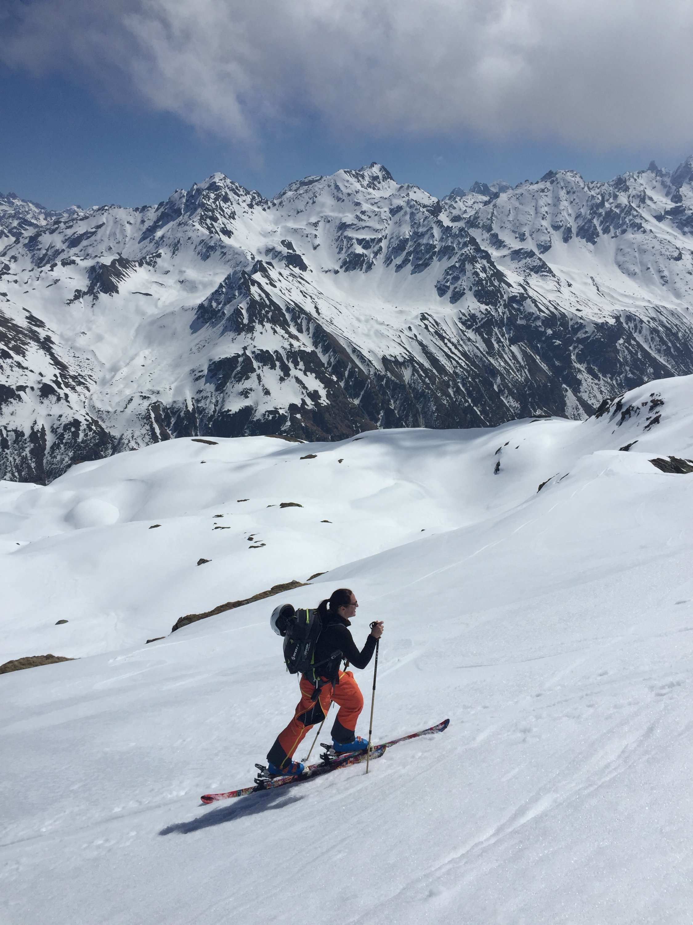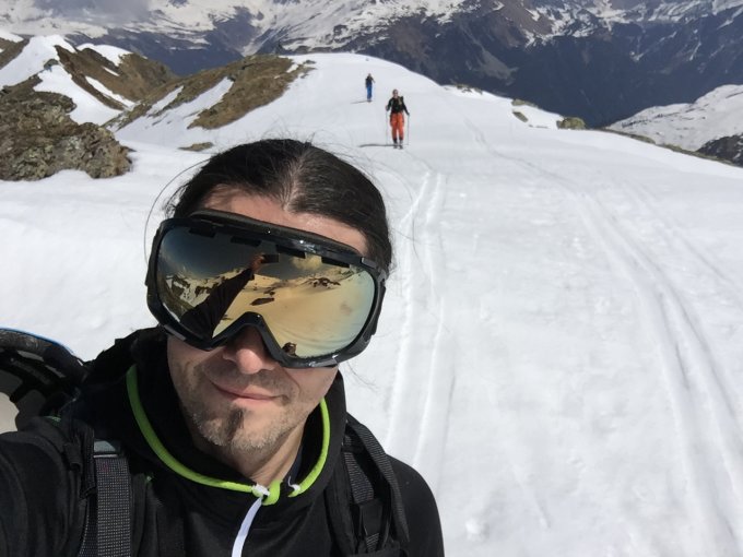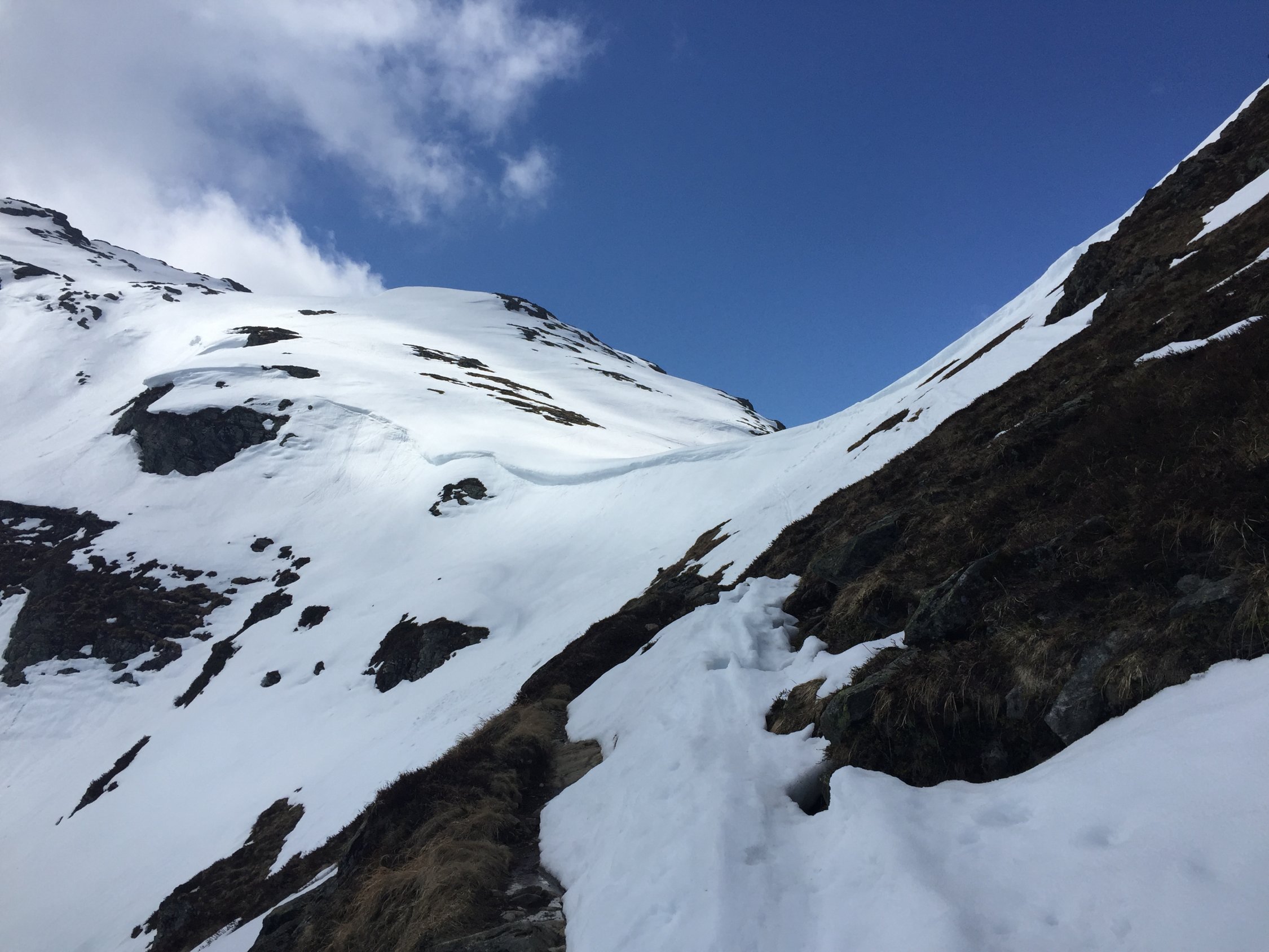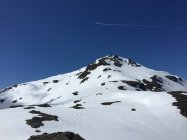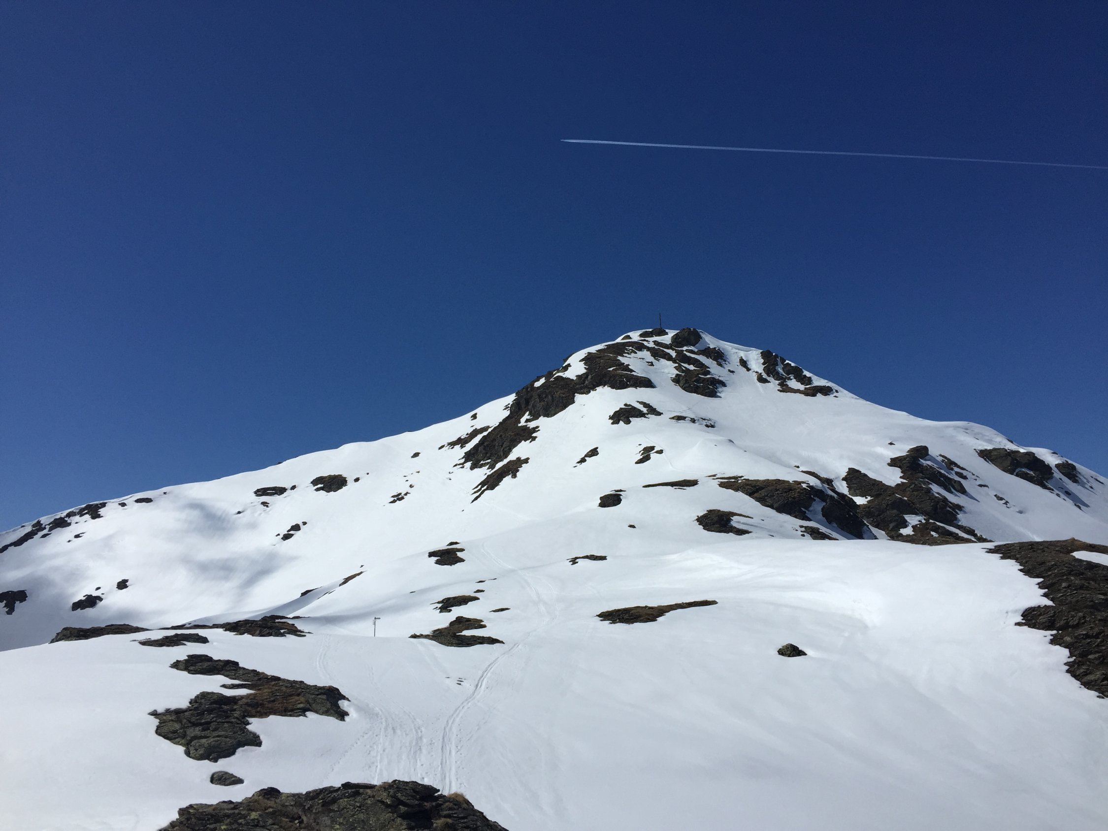 Generell ist die Tour noch gut eingedeckt. Lediglich auf der Südseite um die Burg herum gibt es zwei kurze Unterbrechungen von 2 m. Ansonsten war der Schnee infolge der klaren Nächte und der guten Abstrahlung oberflächlich gut tragfähig. Rein nordseitig ist er sogar mittags noch hart gewesen (auf 2400m), südseitig dann natürlich rasches Auffirnen und mittags dann in steileren Hängen Sumpf. Wir sind am frühen Nachmittag westseitig und durchs Novatal abgefahren und hatten wunderbare Firnverhältnisse.