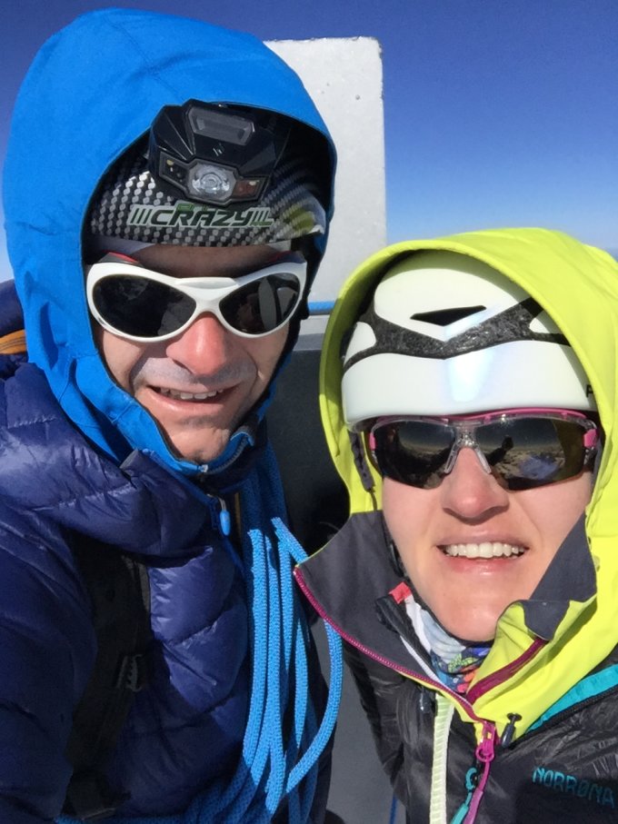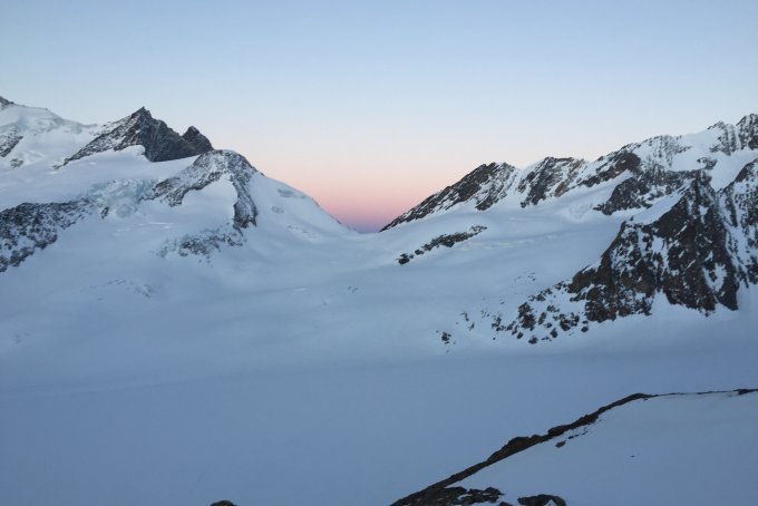 Bestens angelegte Aufstiegsspur, kurze Tragestelle beim Frühstücksplatz. Vom Hugisattel auf den Gipfel guter Trittschne und trockene Felsen, sehr gut zu gehen und absicherbar. Am Gipfel war es Windstill. Abfahrt von Hugisattel bis Frühstücksplarz Hartschnee anschliessend Sulz. Sind dann weiter via Grünhornlücke zur Konkordiahütte.