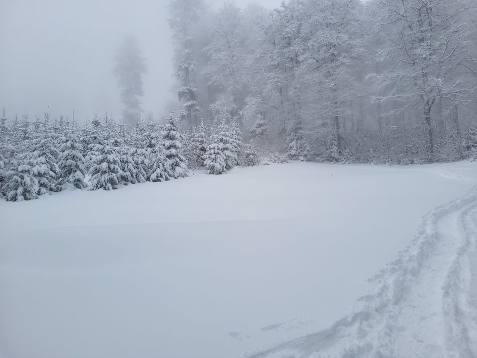 Alles mit leichtem Pulver. Auf der Aufstiegsroute einen Tourengänger angetroffen, oben war der Bär los. Eigentlich sollte man den Sonntag meiden aber wenn die Verhältnisse perfekt sind muss man los.