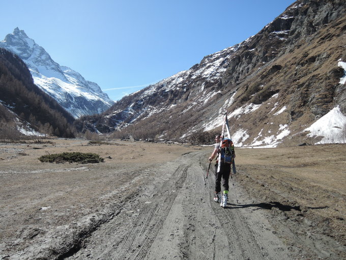 Hütte bis Gipfel harter verblasener Schnee, teilweise etwas Blankeis, kaum sichtbare Spalten. Unterhalb der Hütte über große Strecken Firn, unterhal bRoc de la Vache Nassschnee. Abfahrt bis auf ca. 2370m noch möglich, dafür unterhalb Roc de la Vache rechts halten.
