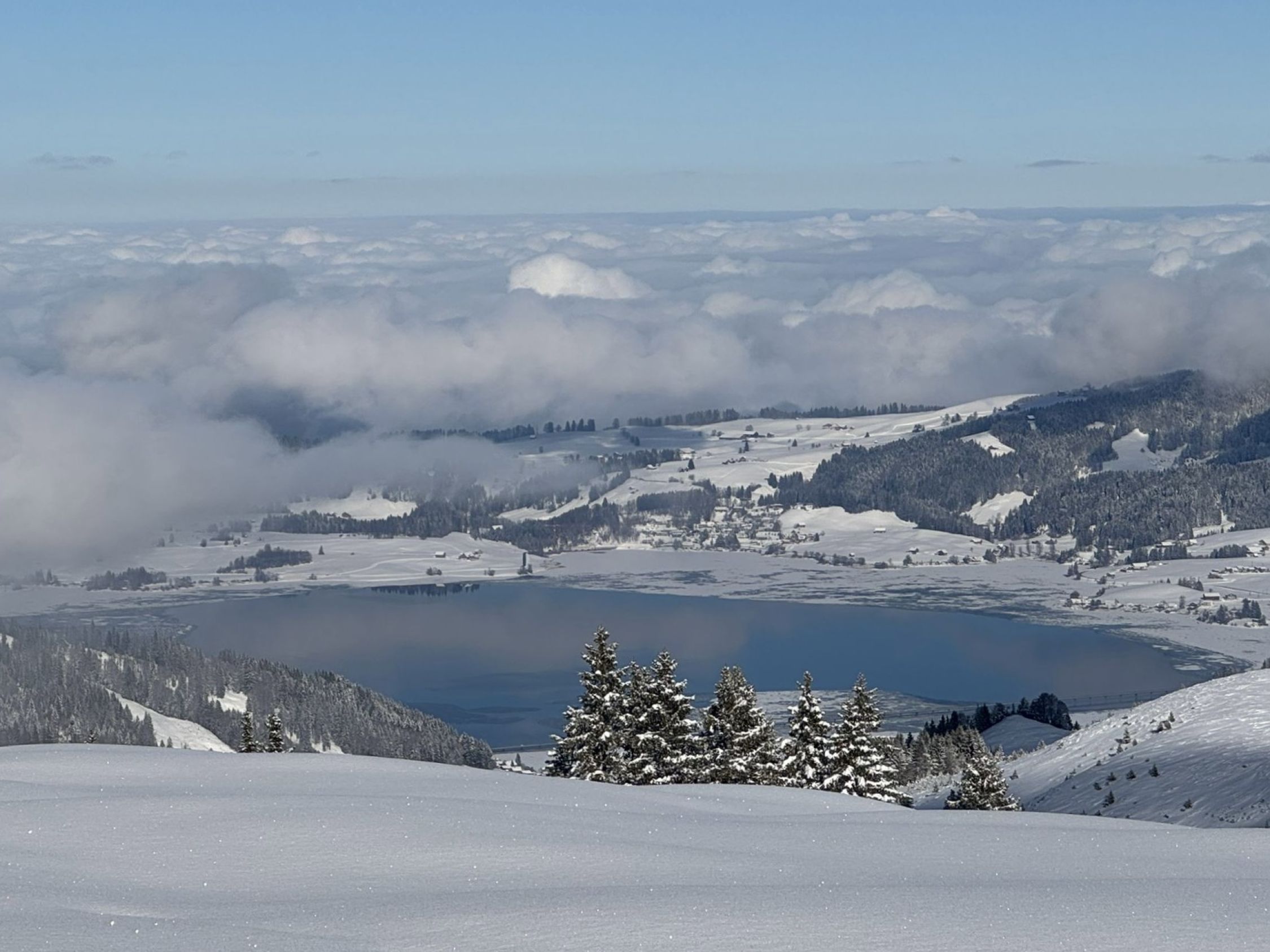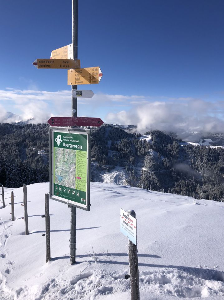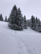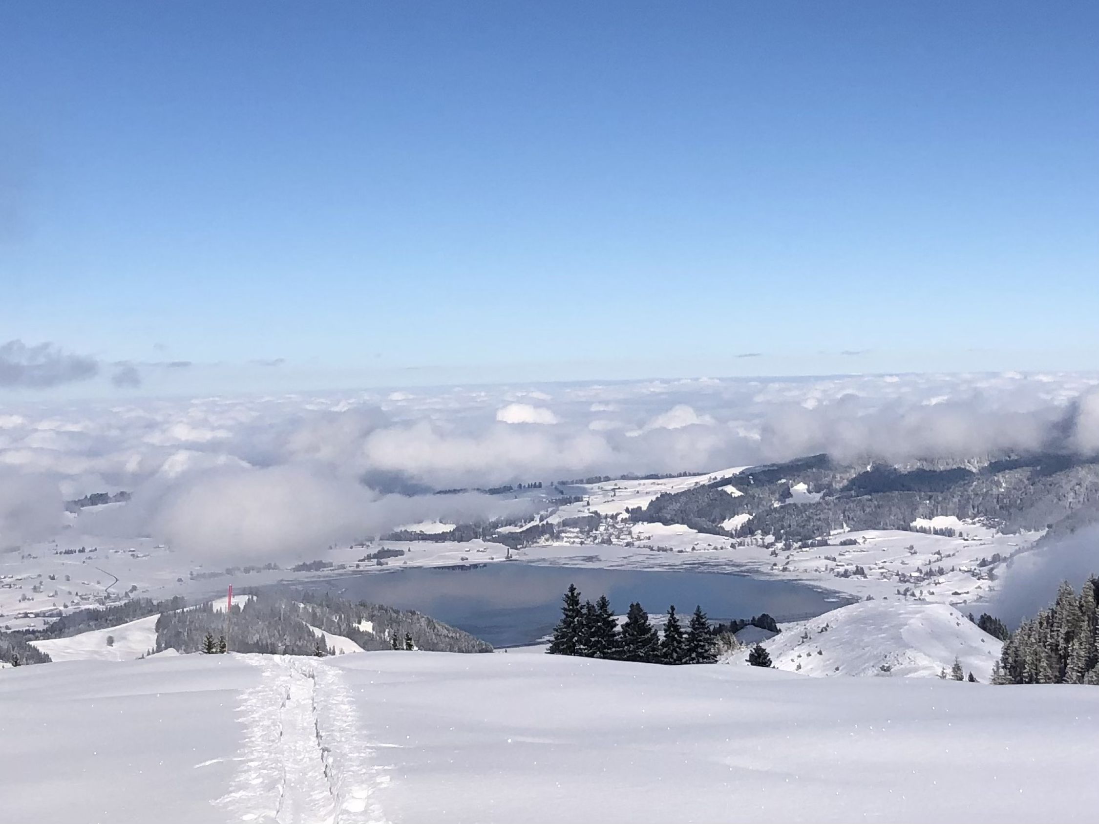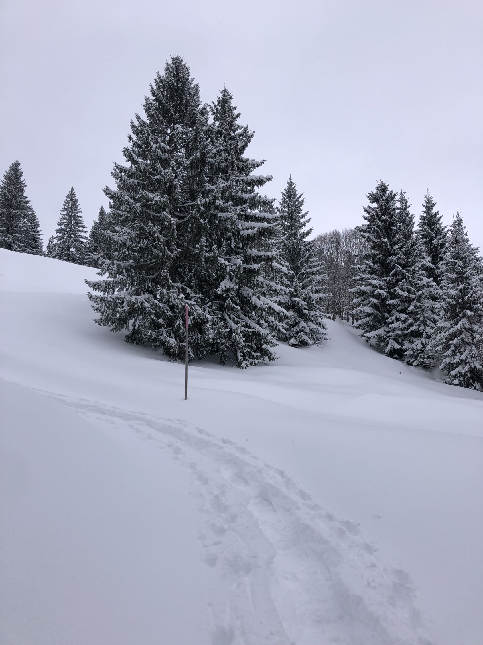 Perfekter Pulverschnee. Aufstieg von Unteriberg den Markierungsstangen entlang.
