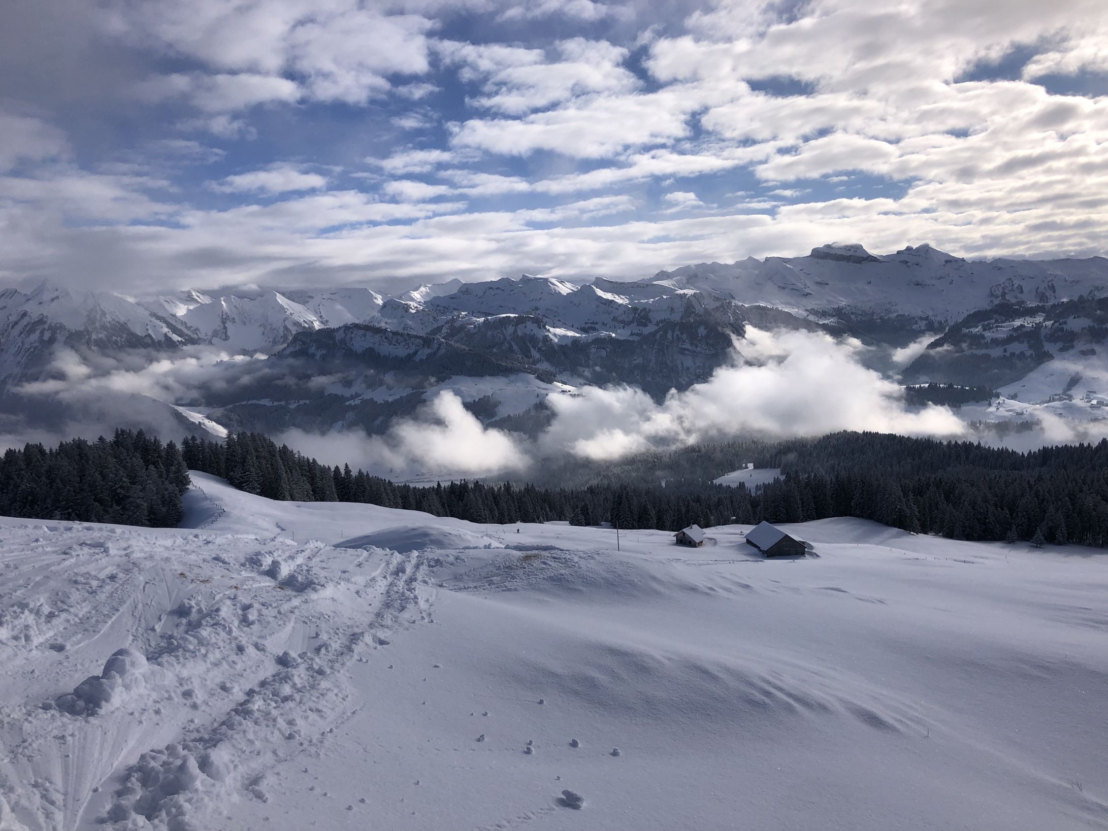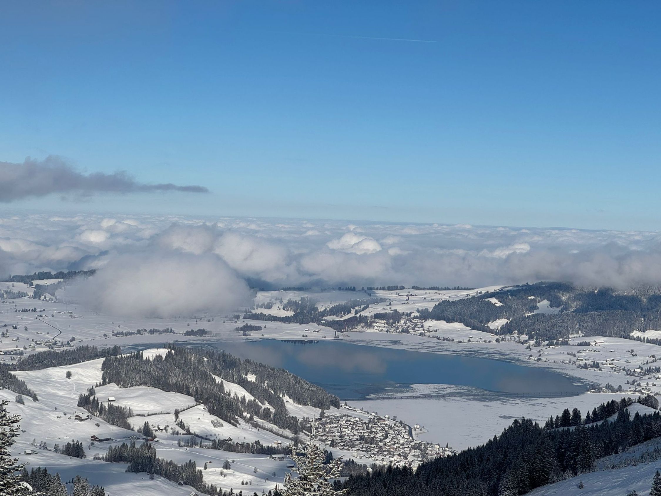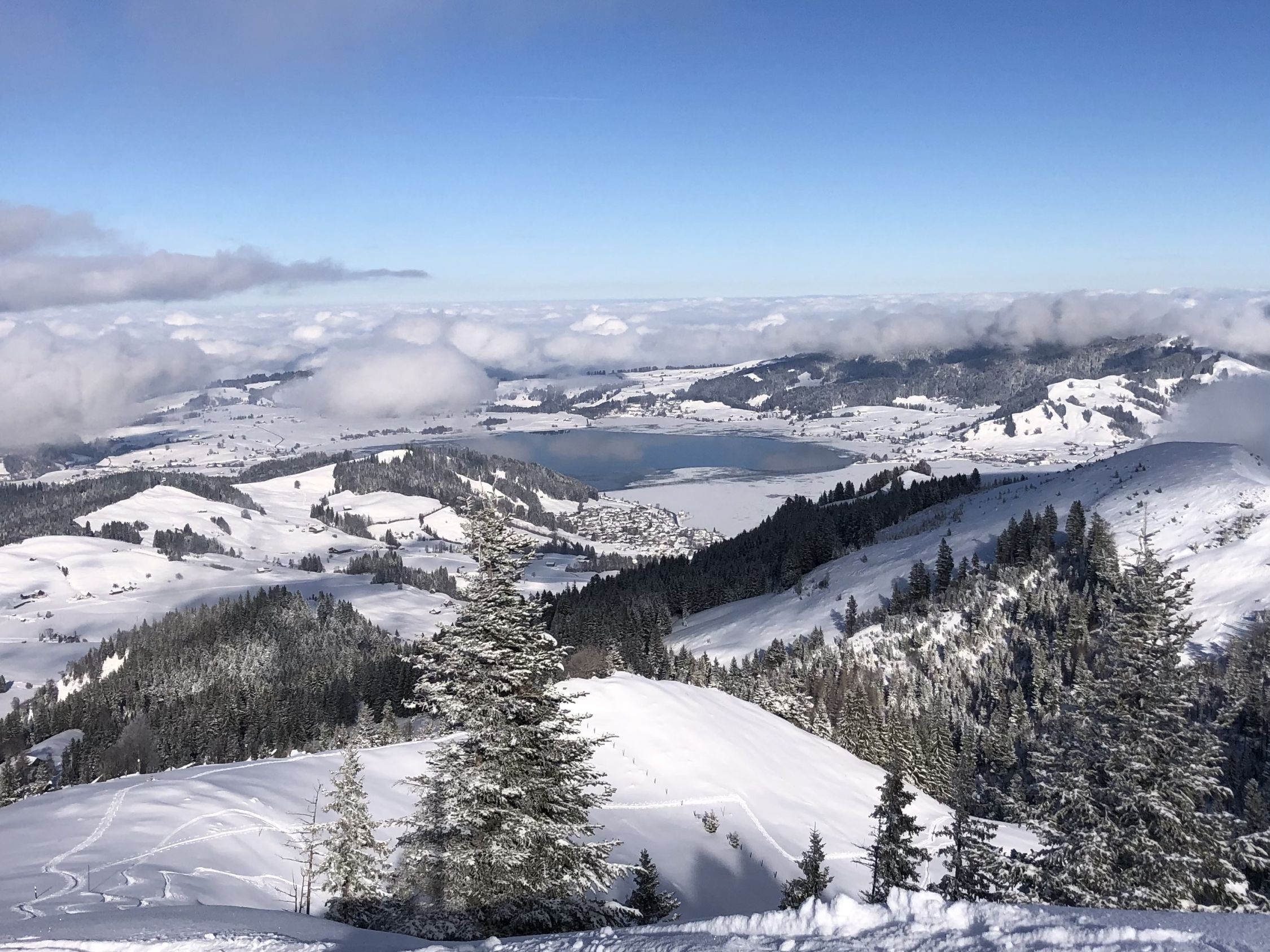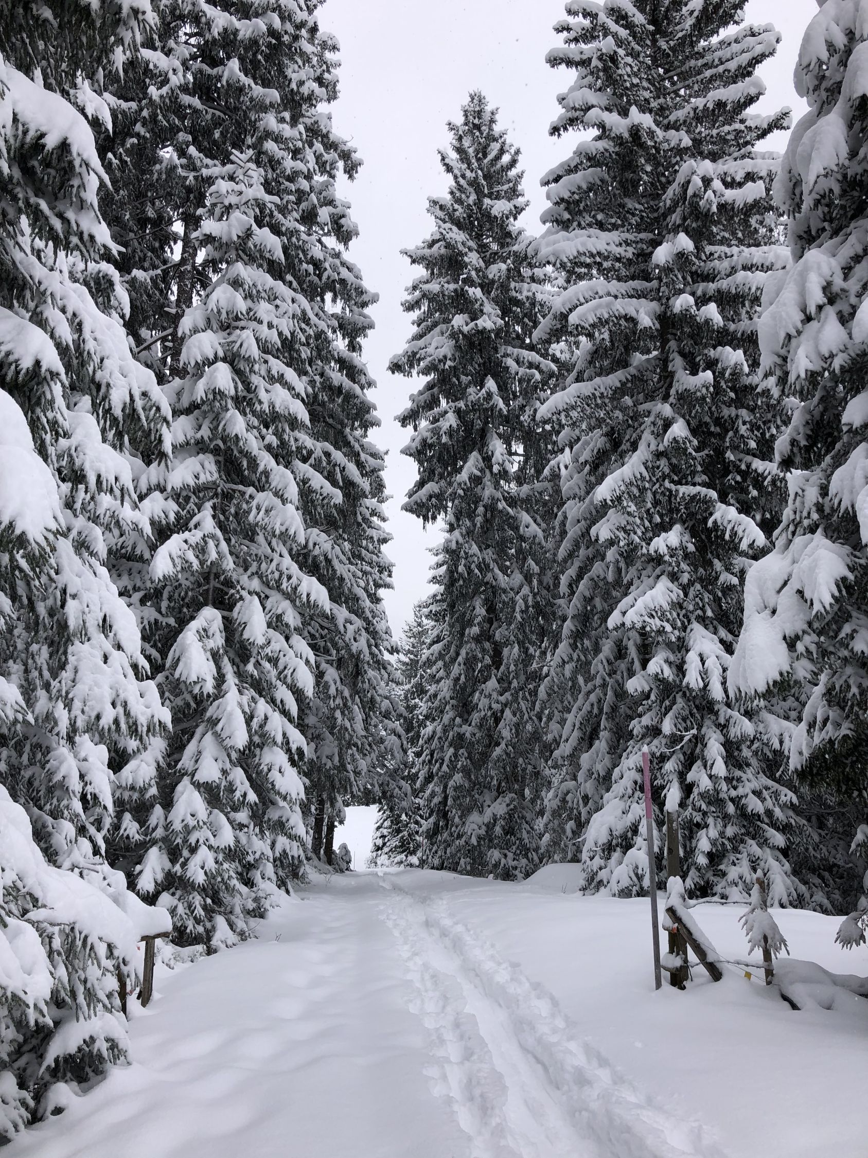 Perfekter Pulverschnee. Aufstieg von Unteriberg den Markierungsstangen entlang.