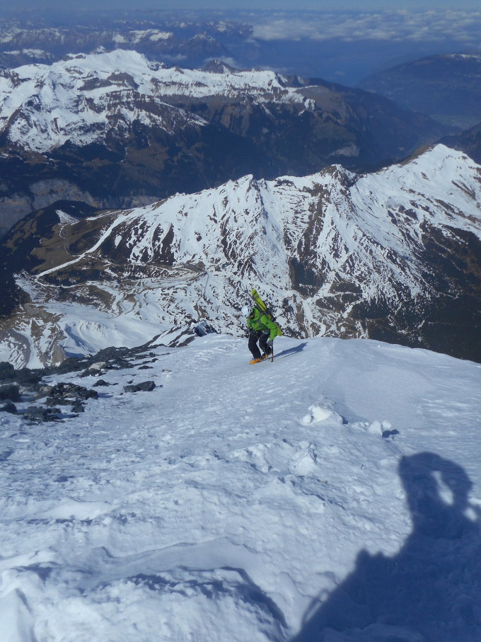 Da wir zum voraus wussten, das der oberste Teil pickelharten Firn aufweist, war für mich klar, das ich die Skiabfahrt nicht mache. Ich bin kein guter Skifahrer, und kenne meine Grenzen. Ich habe die Tour mit der Sommer-Ausrüstung gemacht.