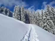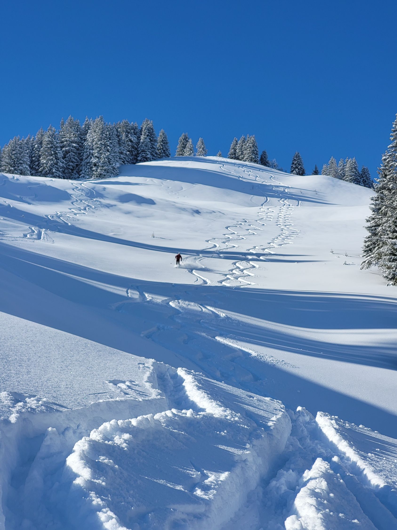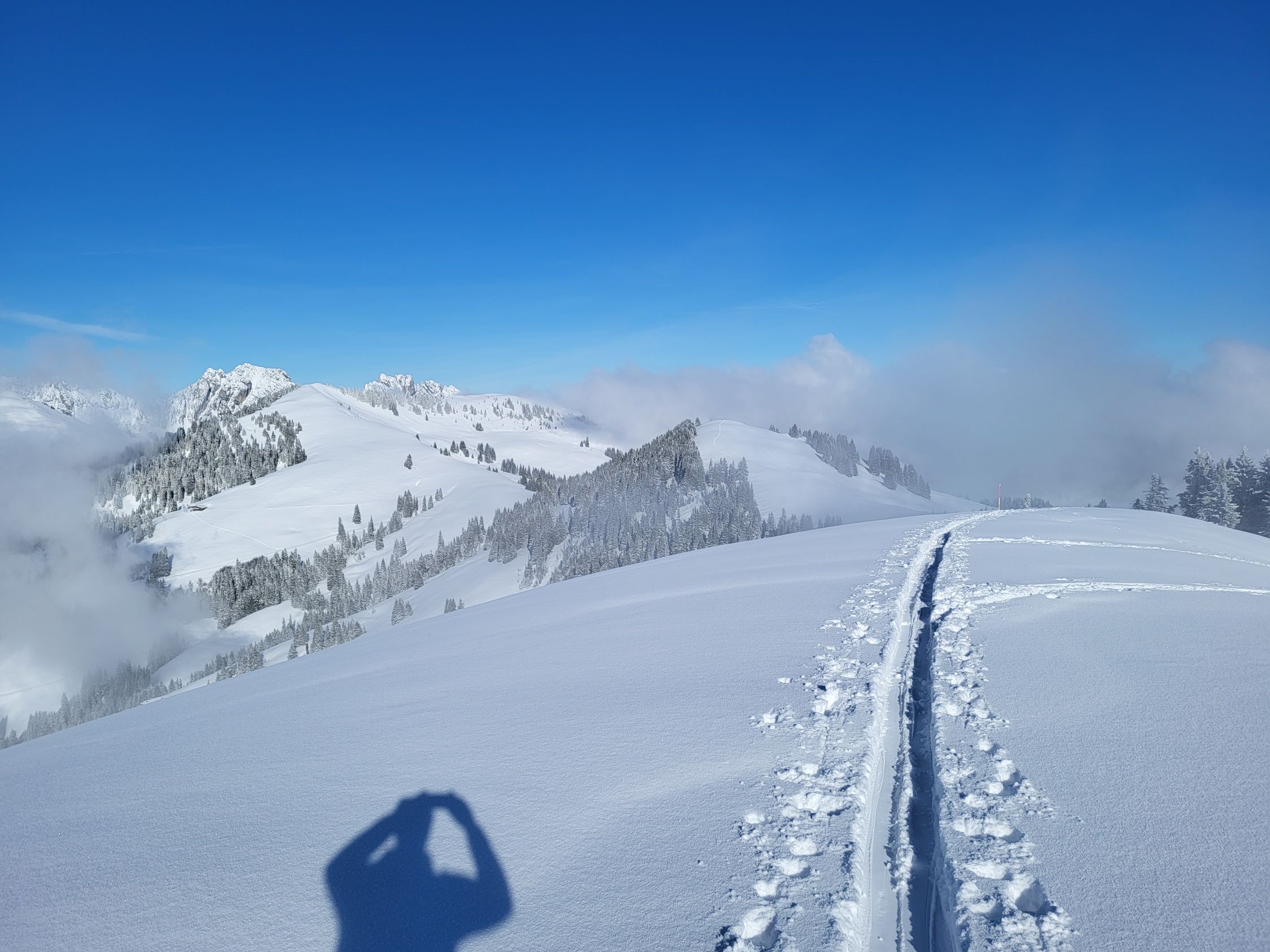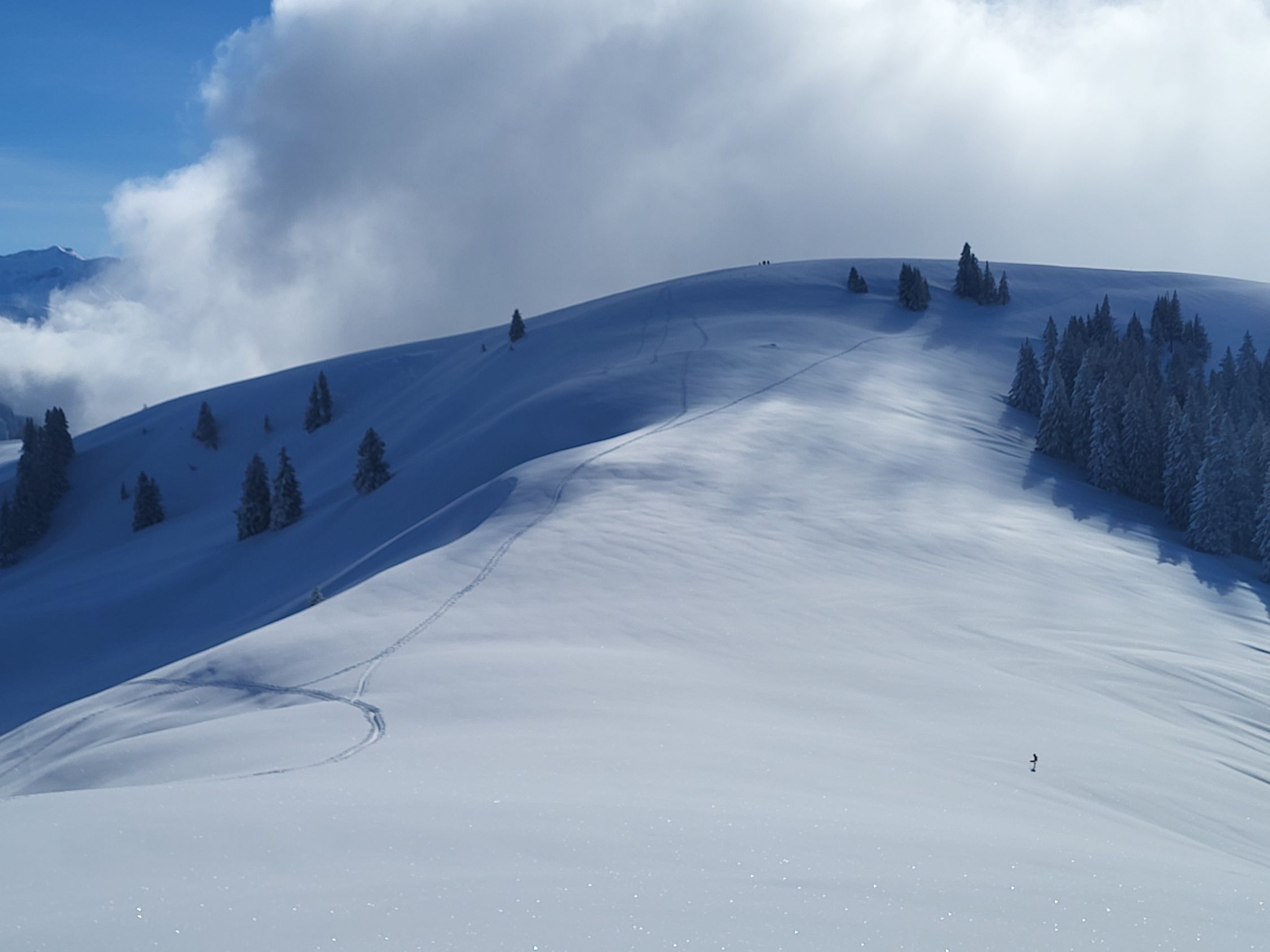 Pulver gut in der Region Schönried. Gute Spur auf dem Bodmerweg (Winterwanderweg) bis zum Rellerli und dann über den Hugeligrat zum Planihubel. Wunderschöne Pulverschneeabfahrt (es hat noch viel Platz für Spuren) über Vorderi Bergsimne ins Simne-Tal. Aufstieg in guter Spur ab Pt. 1442 über Lägerli - Bumeisteri - Hübschi auf das Wannerhörli. Im Aufstieg teilweise wenig Schnee (besonders ganz oben) und schon leicht feucht. Abfahrt in Richtung Pt. 1516 in schönem Pulverschnee, aber nicht mehr so fluffig wie vom Planihubel. Diese Abfahrt war schon ziemlich verspurt.