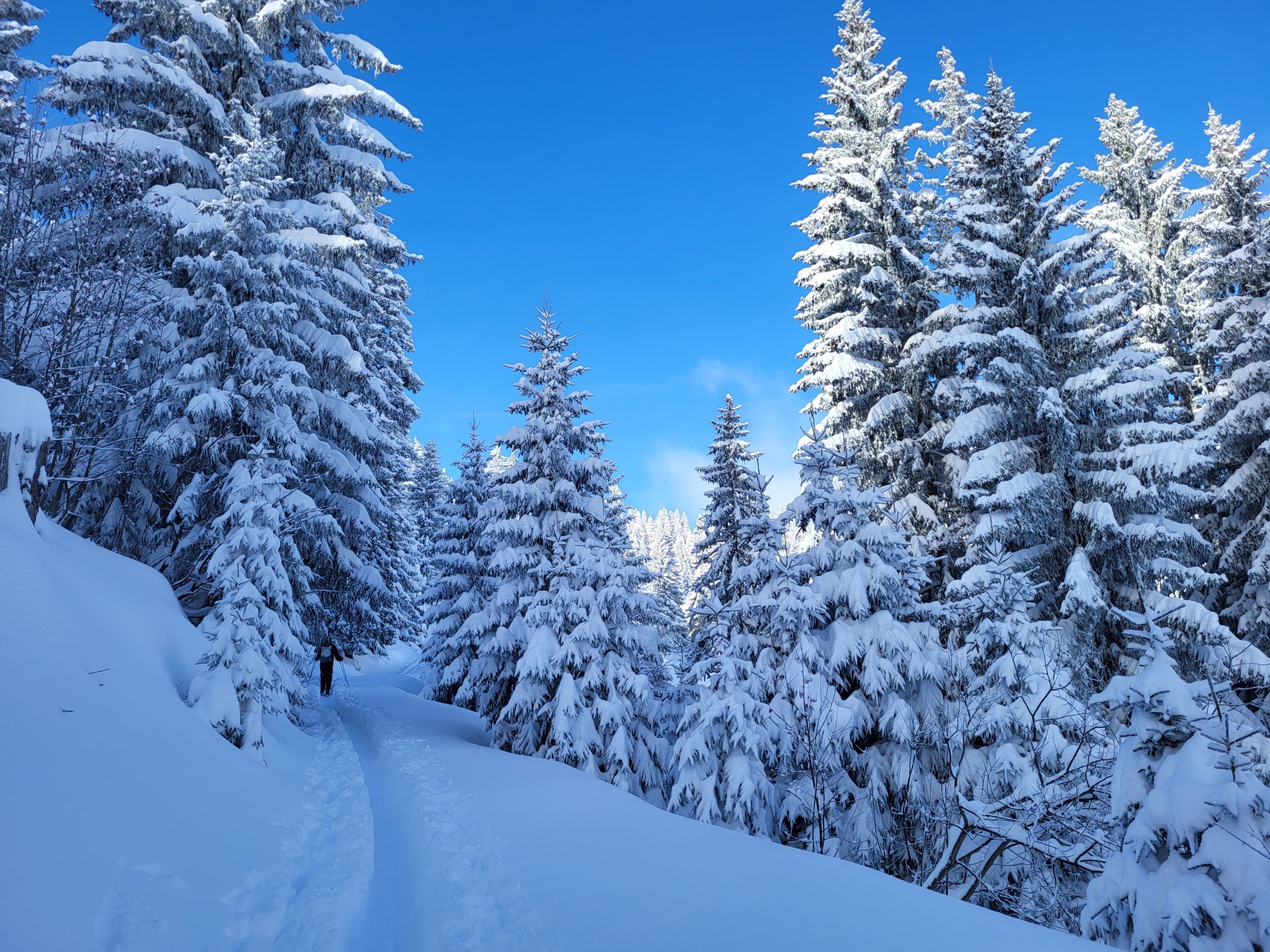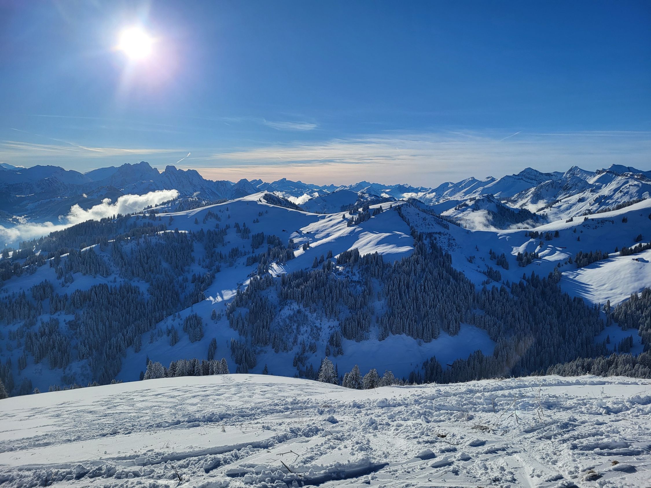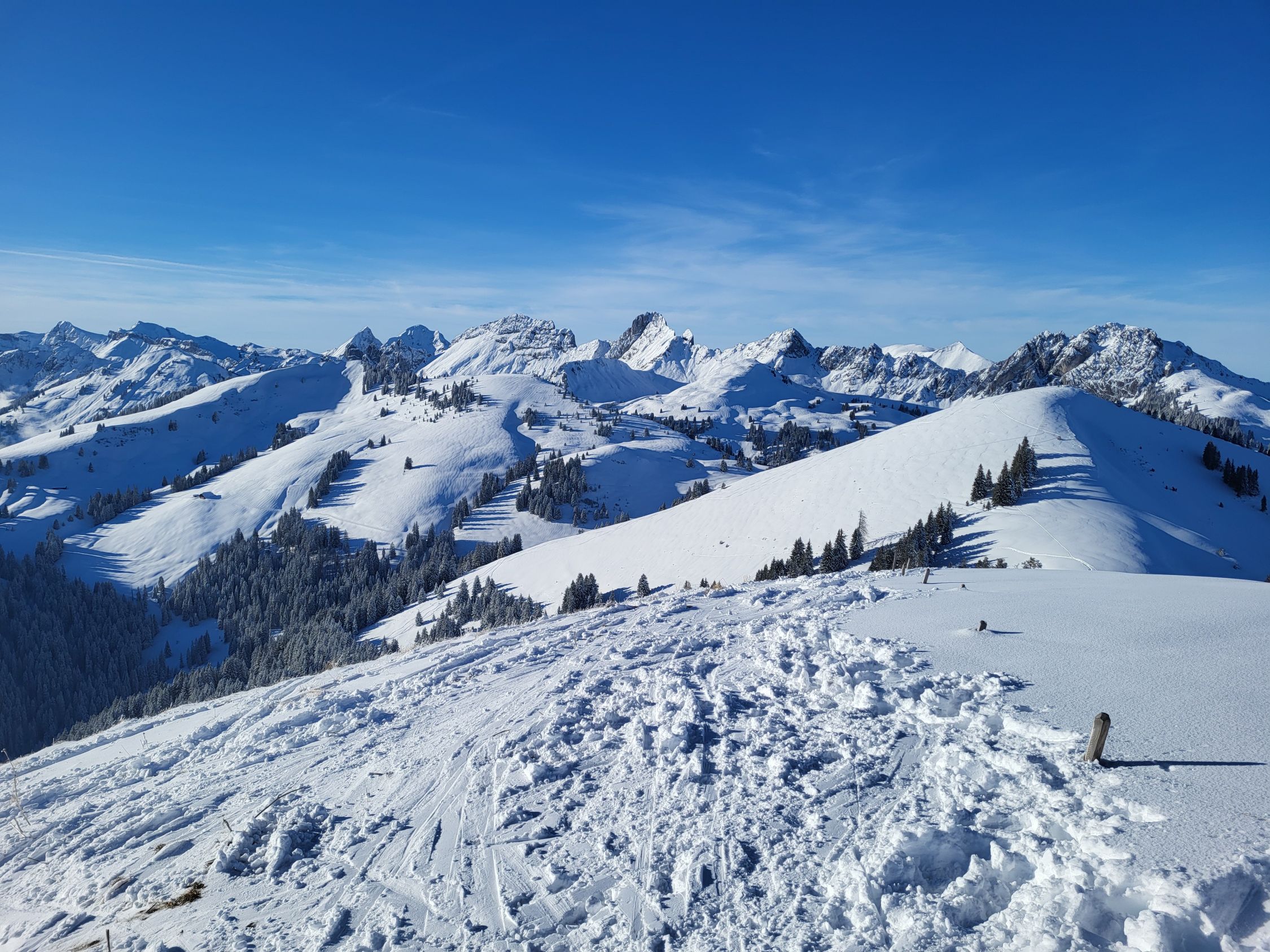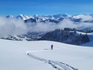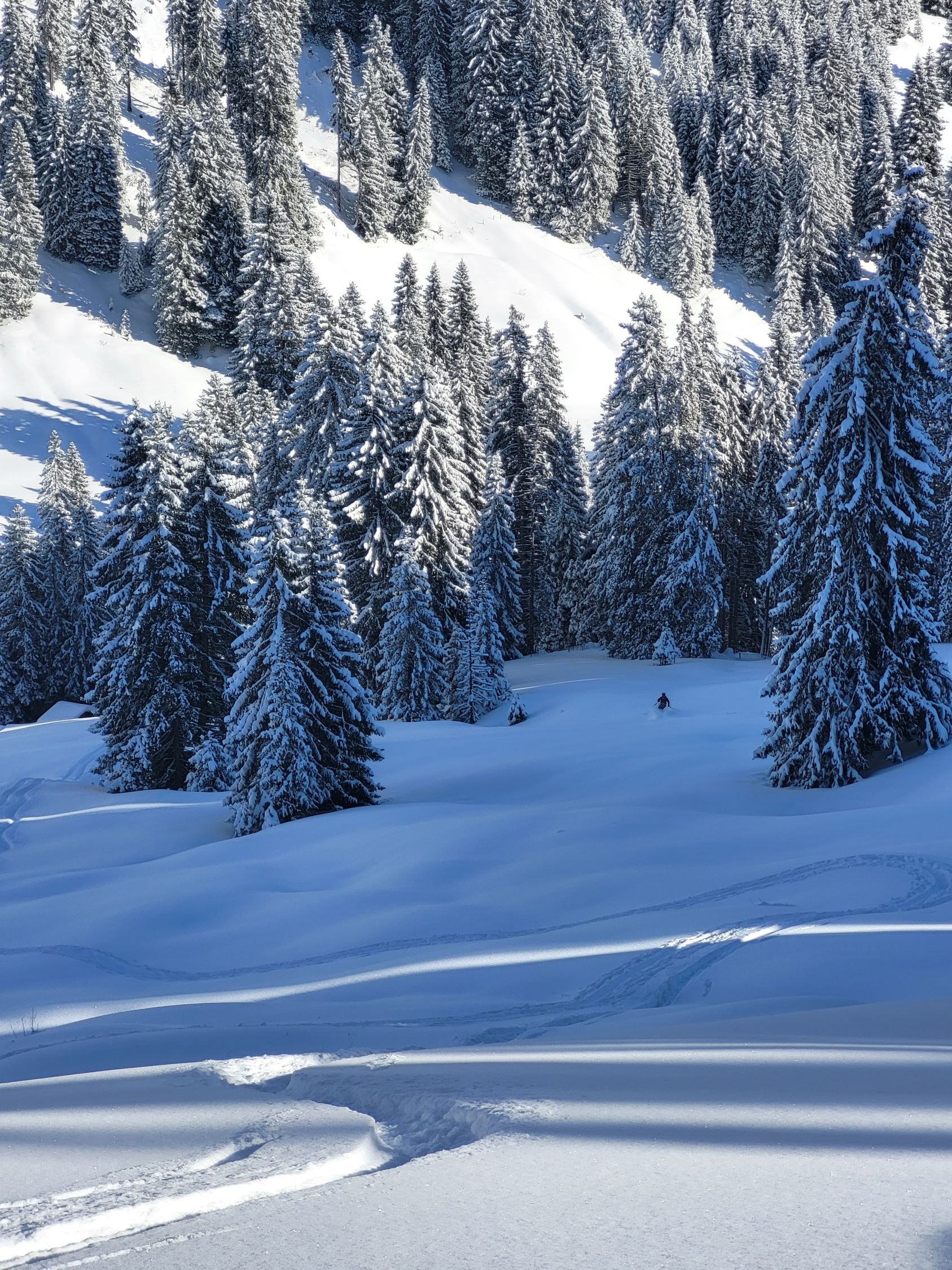 Pulver gut in der Region Schönried. Gute Spur auf dem Bodmerweg (Winterwanderweg) bis zum Rellerli und dann über den Hugeligrat zum Planihubel. Wunderschöne Pulverschneeabfahrt (es hat noch viel Platz für Spuren) über Vorderi Bergsimne ins Simne-Tal. Aufstieg in guter Spur ab Pt. 1442 über Lägerli - Bumeisteri - Hübschi auf das Wannerhörli. Im Aufstieg teilweise wenig Schnee (besonders ganz oben) und schon leicht feucht. Abfahrt in Richtung Pt. 1516 in schönem Pulverschnee, aber nicht mehr so fluffig wie vom Planihubel. Diese Abfahrt war schon ziemlich verspurt.