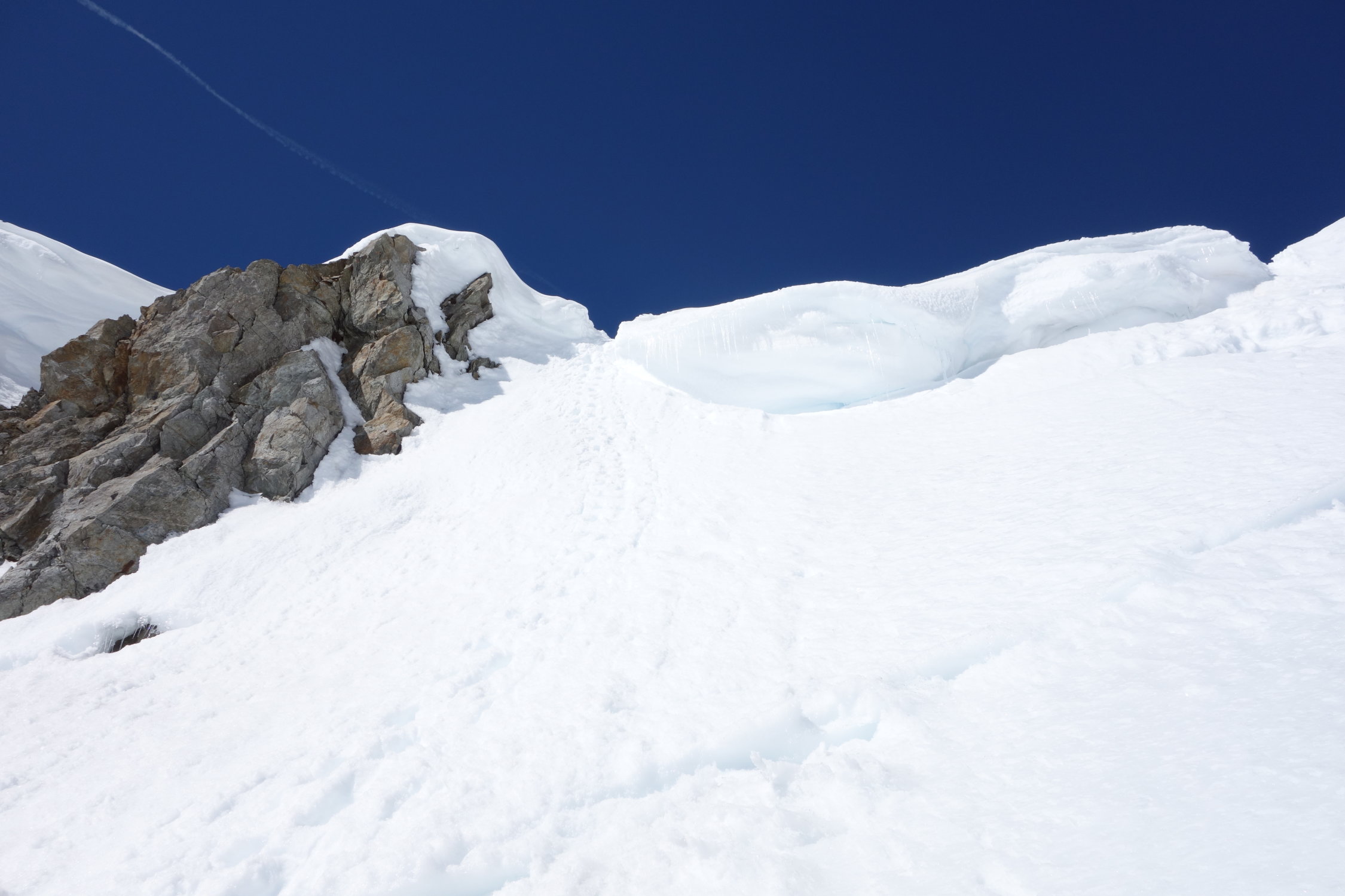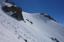 Vom Grat dann kurze Abfahrt nach O auf den Bächenfirn und steiler Gegenaufstieg zu Fuss im aufgeweichten Schnee hoch zu Pt. 2913m. Hier sind wir z.T. bis zum Bauch eingesunken und der nahezu senkrechte Ausstieg über die Wächte war das Pièce de Résistance des Tages.