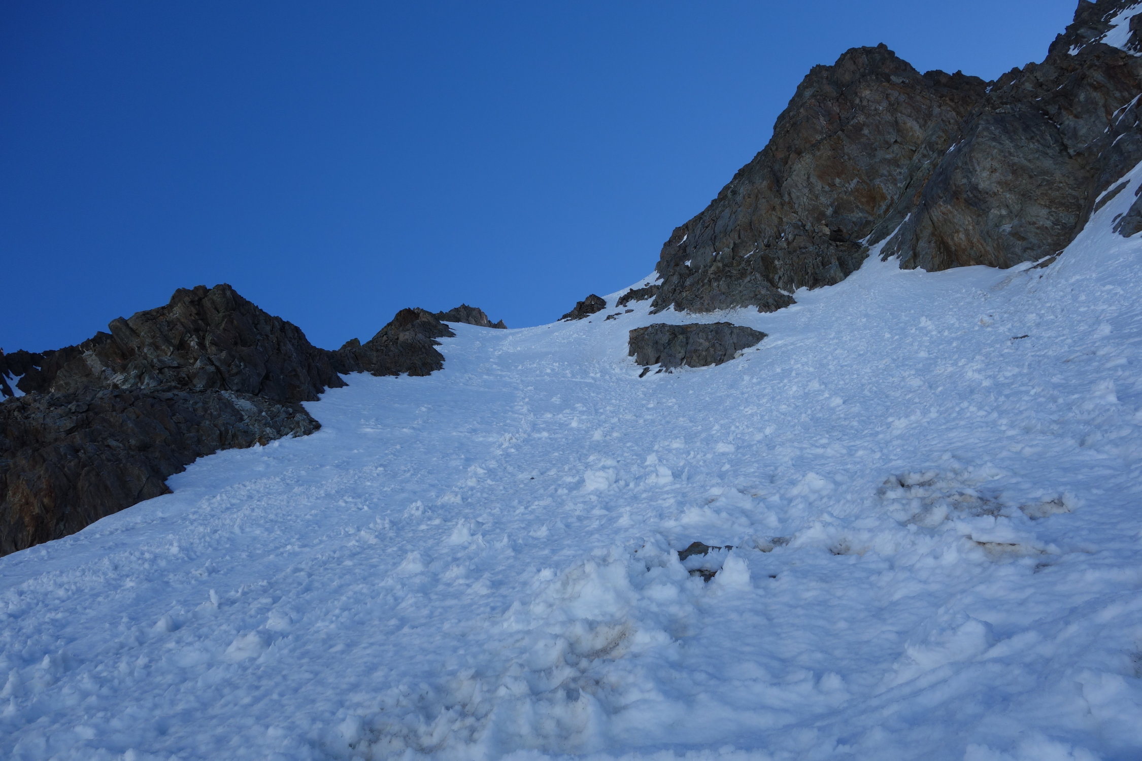 Folglich also von Pt. 2913m ca. 200m/50Hm nach W abgefahren, dann orographisch rechts/nördlich eine ziemlich steile Flanke (40-45°) runter und weiter nach rechts querend bis auf den Rossfirn, welchen man über eine scharfe Wechte erreicht. Alles in allem steil und no-fall-terrain, hart aber gerade schön griffig und genüsslich. Die Variante würde bei den aktuellen Verhältnissen (Pickel und Steigeisen vorausgesetzt) auch im Aufstieg gehen.