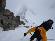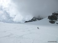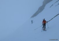 Die erste Stunde dichter Nebel und GPS Navigation. Dann Aufhellungen. Hart gefrorener Sulz von der Hütte bis zum Skideport. Keine Spalten auf der Route sichtbar. Guter Trittschnee im Fussaufstieg.
