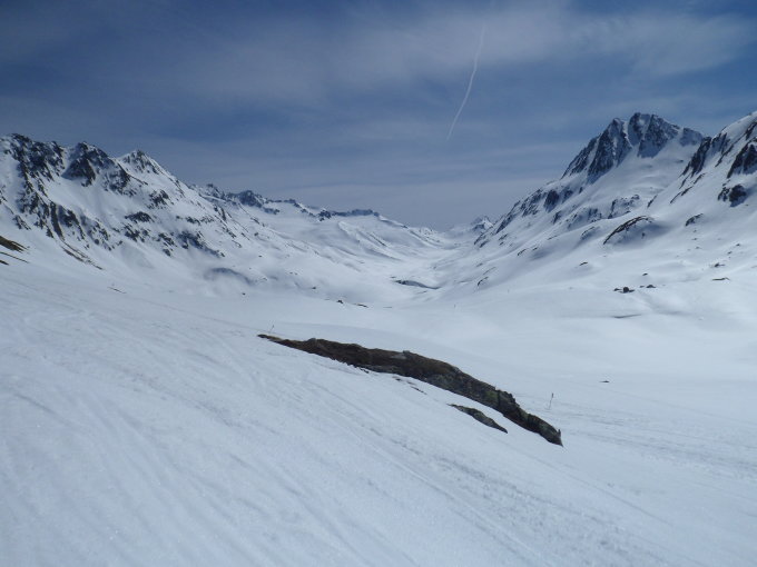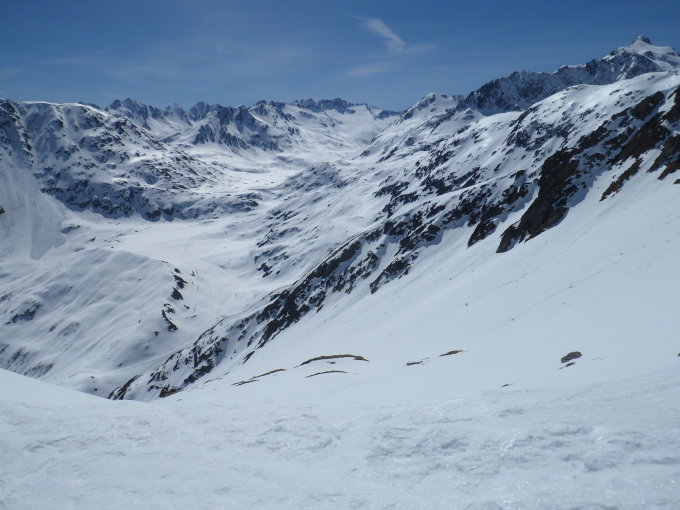 Als Zustieg zur Maighelshütte. Im Bereich der Nurschalas Grondas (Abfahrt Richtung Maighelshütte) hat es eine beachtliche Lawine, die wohl schon einige Tage alt ist).