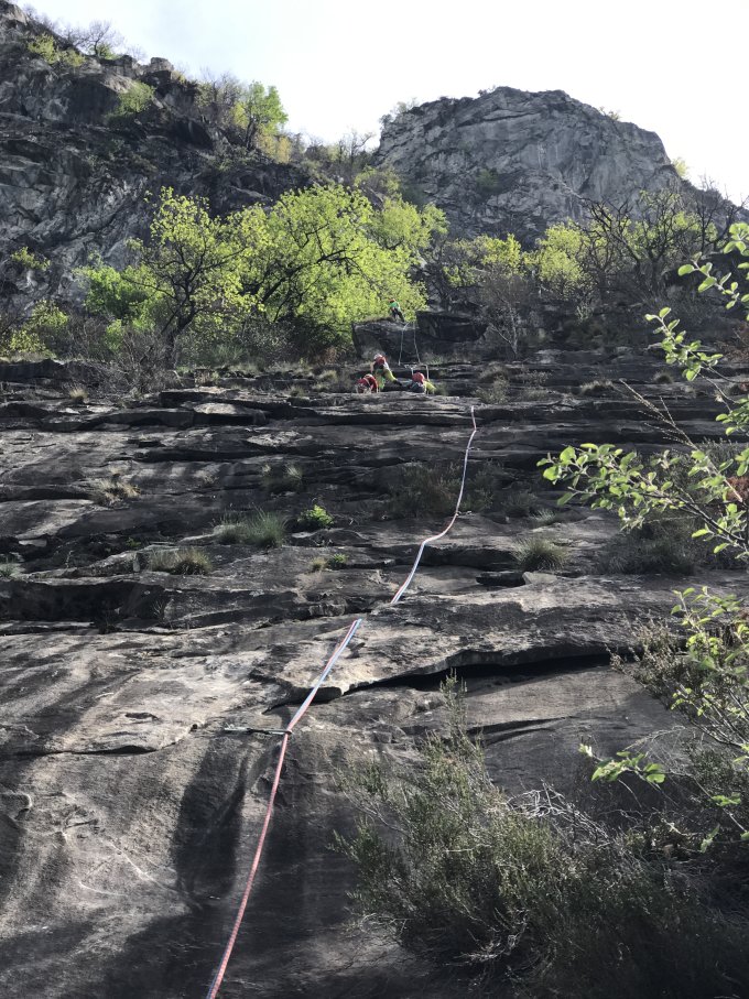 Spuren eines Waldbrandes der letzten Monaten waren eindrücklich zu sehen. Dort wo früher Gras war liegt jetzt Erde: es ist möglich, dass mit dem Seil ab und zu, trotz aller Sorgfalt, ein kleiner Stein wegfliegt. Dies ist unangenehm für die unten kletternde Seilschaften, deshalb muss man aufpassen und unten liefert ein Helm gute Dienste.