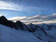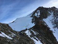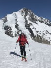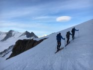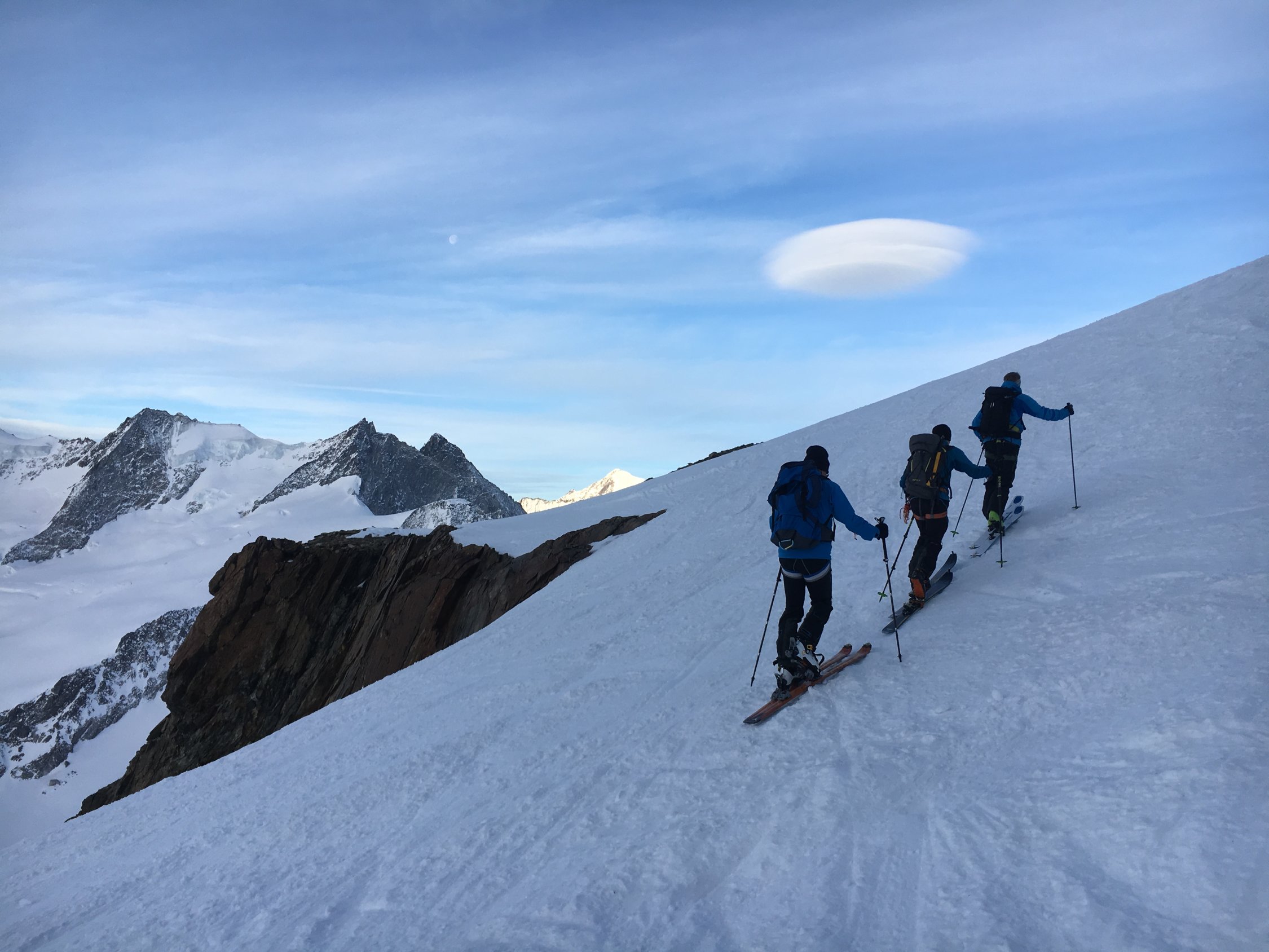 Wir durchquerten zuerst das Geröllfeld rechts von der Hütte und stiegen auf dem Gletscher bis zum Frühstücksplatz auf, den wir nach 2 Stunden erreichten. Die Ski mussten wir hier ein paar Minuten schultern. Danach gings zwei weitere Stunden über den Gletscher in schier endlos scheinenden Serpentinen bis zum Hugistattel auf 4'087 m. Hier deponierten wir die Skier und montierten die Steigeisen.