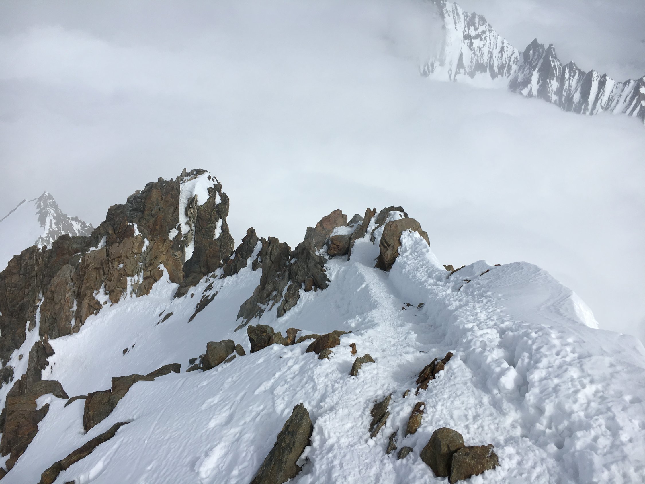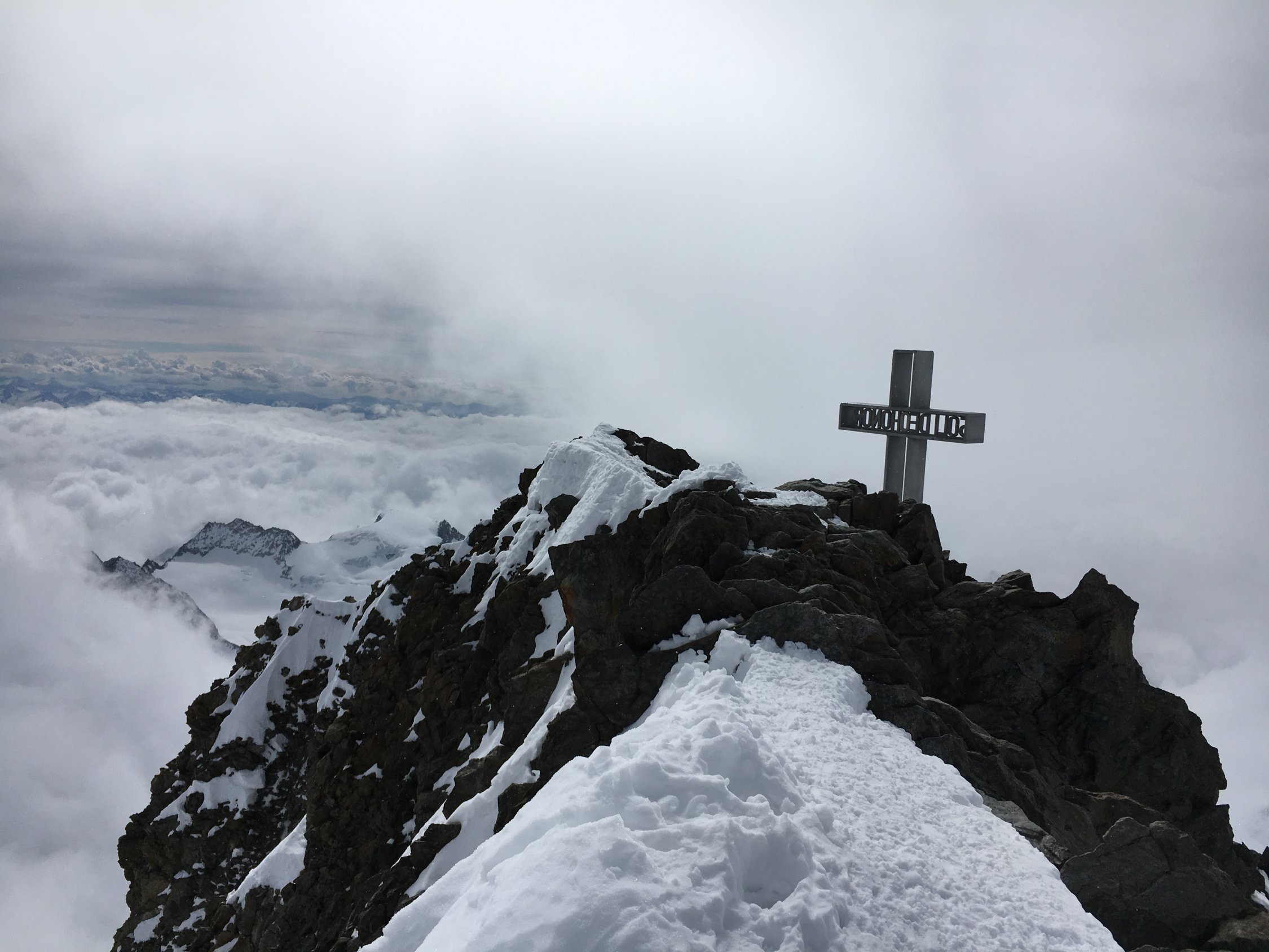 Schon auf dem Gipfelgrat konnten wir beobachten, wie die Wolken immer höher stiegen. Kaum hatten wir die ersten Gipfelfotos gemacht, holte uns der Nebel ein. Da es auch sehr kalt und windig war, machten wir uns schnell auf den Abstieg zum Hugisattel. Auch der Rückweg über den Grat war leicht zu finden und mein Bergführer, der sonst keine Blumen verteilt meinte, ich wäre "sackstark" abgestiegen.