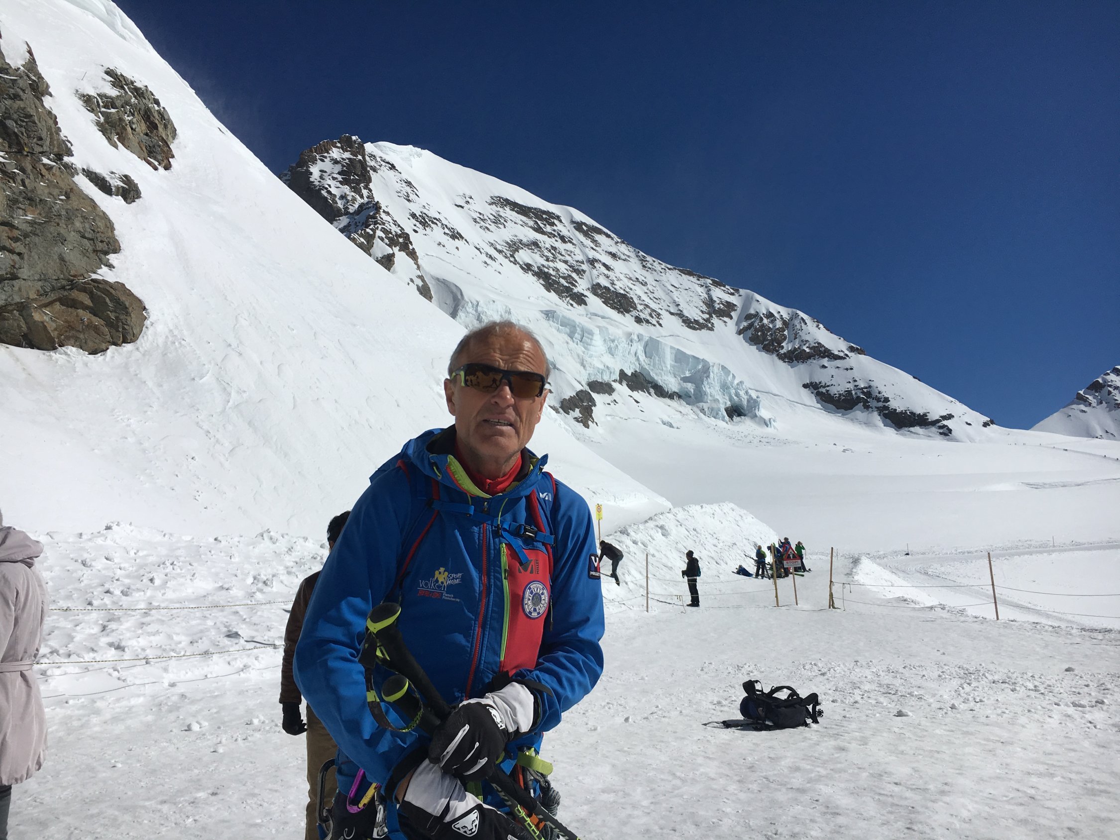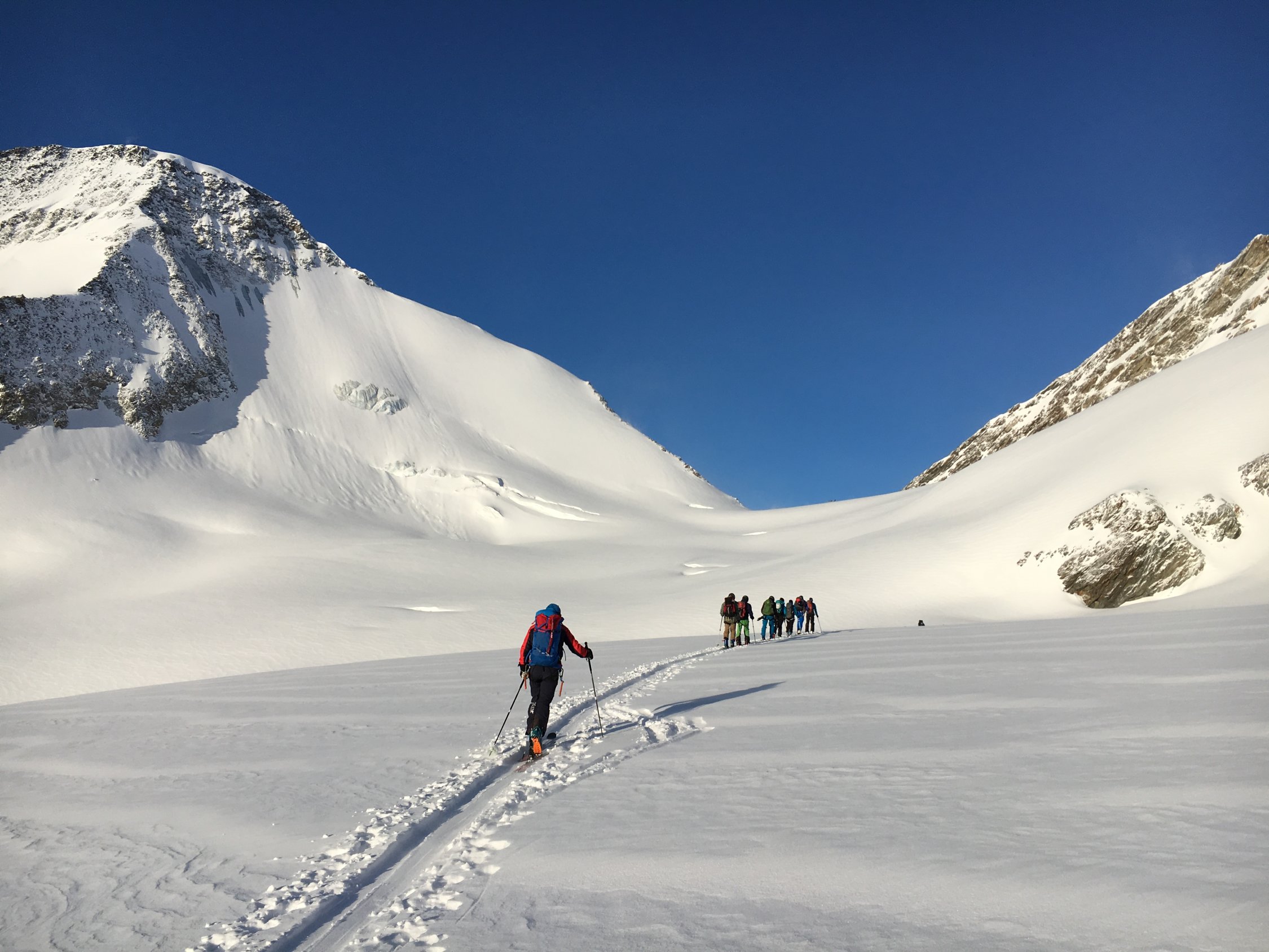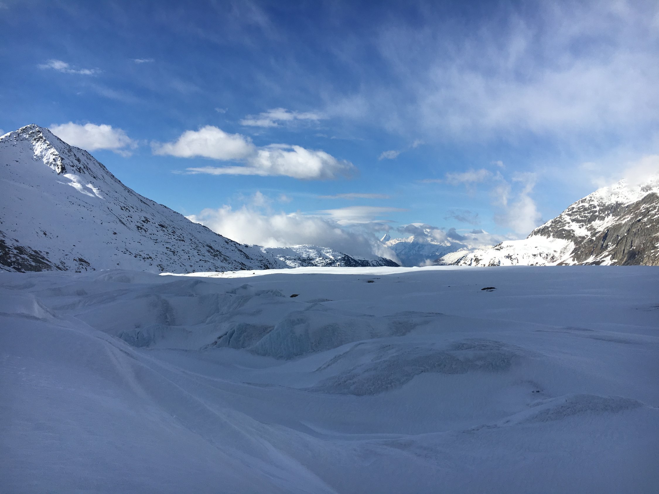 Am Fusse des Eggishorn führte uns Kilian über den Gletscherbruch und anschliessend stiegen wir nochmals 90 min. zum Tälligrat auf 2'600 m hinauf, von wo wir in wenigen Minuten das Skigebiet der Aletsch Arena erreichten.