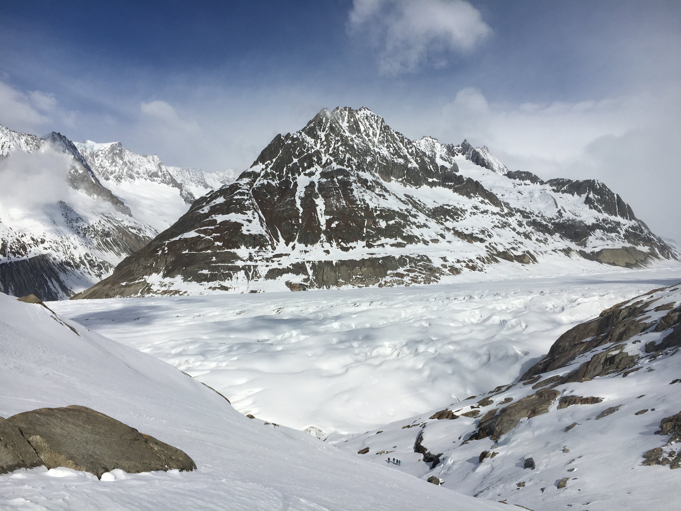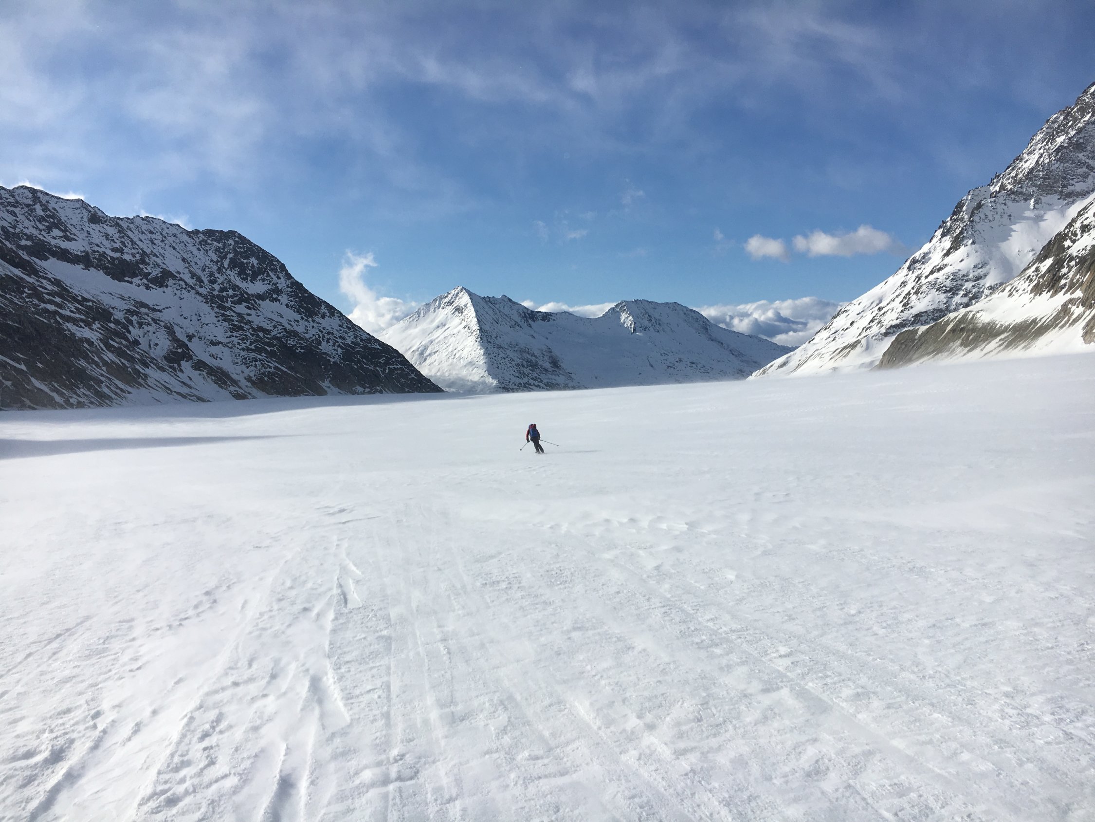 Um den Fussmarsch über die Moränen des Fieschergletschers zu vermeiden, stiegen wir nochmals zur Grünhonlücke auf, fuhren (im Pulverschnee) über den Grünegggletscher zur Konkordiaplatz und über den Aletschgletscher bis zum Eggishorn. Die Bedingungen waren ideal, der Neuschnee war bereits vom Winde verweht und wir konnten die Abfahrt über den Gletscher meistern, ohne mit den Stöcken nachhelfen zu müssen.