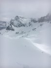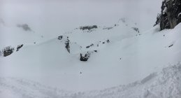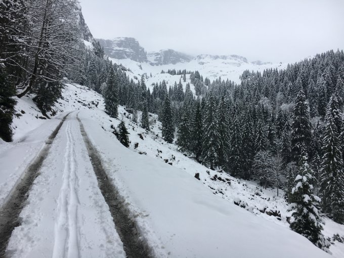 Im Sali liegen gut 10cm Nasschnee, gerade genug, um auf der Strasse loslaufen und auch wieder hinunter fahren zu können. Die Schneehöhe nimmt aber schnell zu, auf Ruosalp liegen bereits 30-40cm, auf dem Gipfel 50-60cm Neuschnee. Dieser ist nur im obersten Drittel pulvrig, im unteren Teil wird er schwerer, bleibt aber gut fahrbar. Kein Bodenkontakt von oben bis unten.