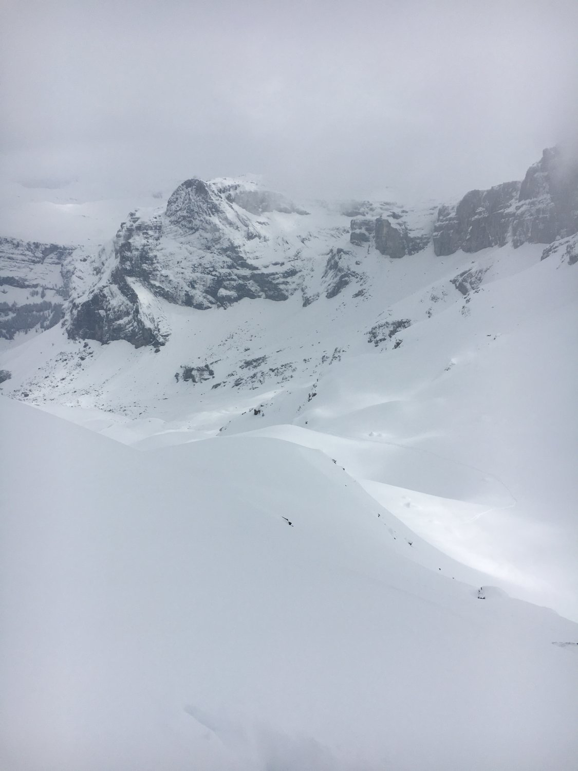 Eingespurt wurde heute durch einige Muotitaler Aboriginals eine Variante, welche weiter westlich als die übliche Route verläuft - vielen Dank, ein hartes Stück Arbeit. Sie folgt zunächst der Fahrstrasse Richtung Ruosalp und gewinnt dann via Rossplatten und Grüen Bodä den Punkt 1913 unterhalb des Munggenbands. Von dort dann der Normalroute folgend.