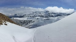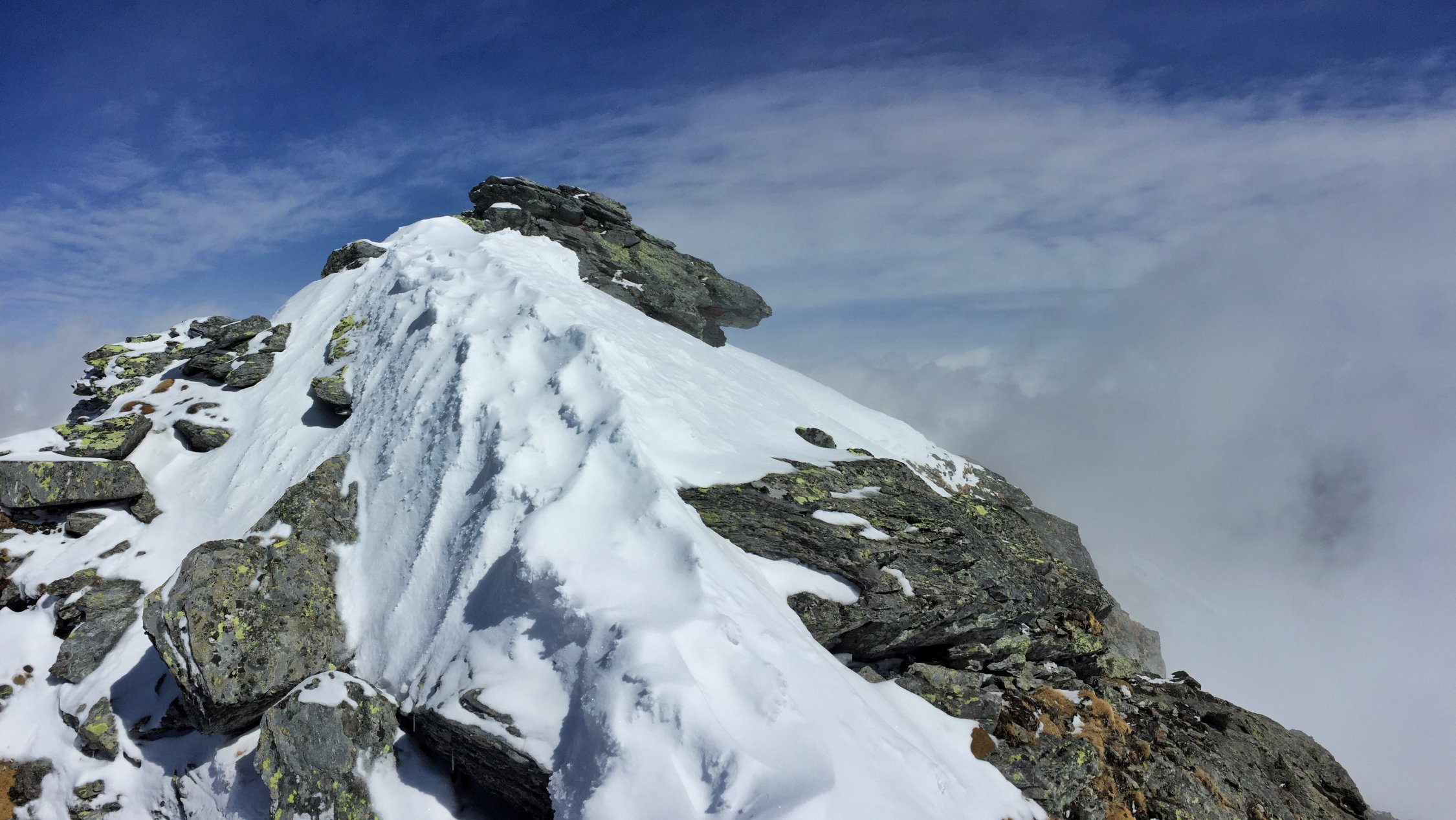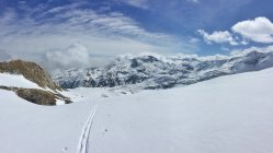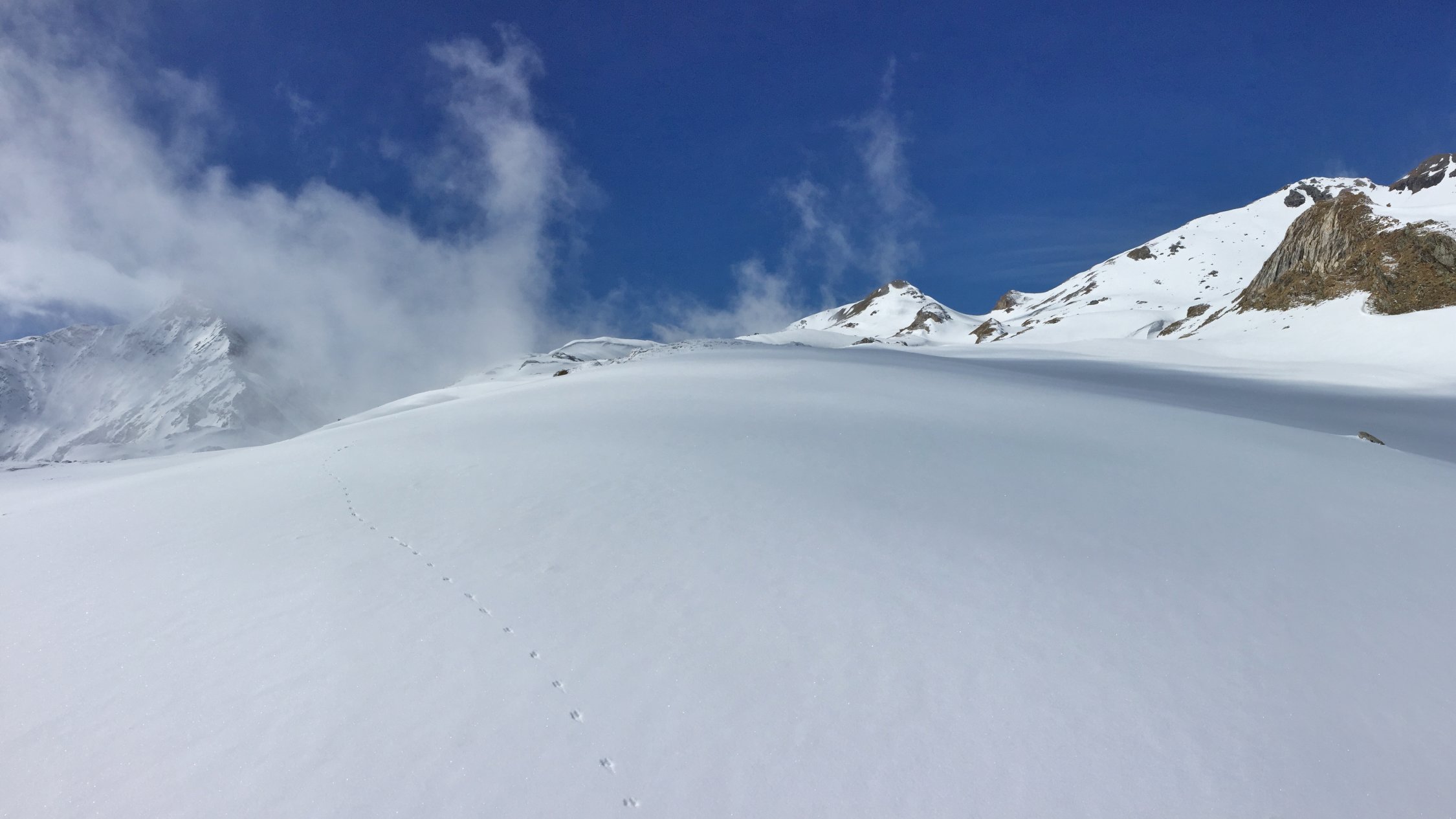 Im Aufstieg konnte ich dank der ausgezeichneten Sicht und den maximal 10 cm Neuschnee ganz schwach eine alte Aufstiegsspur entdecken, die mich als Guggernell-Greenhorn präzise auf dem Gipfel lotste.