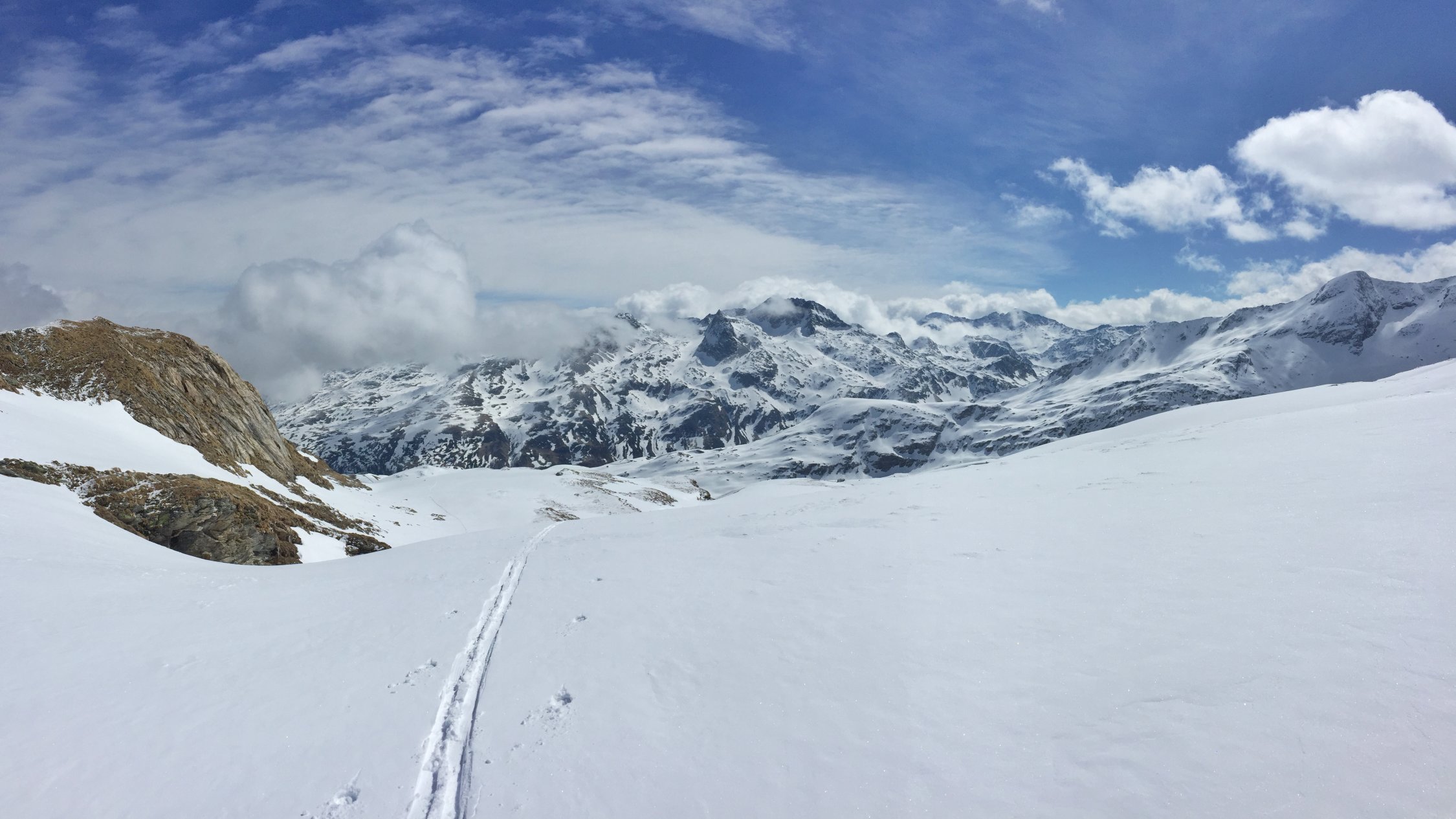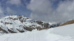 Die Abfahrt war den Verhältnissen entsprechend sehr gut. Bis zur ersten Sektion runter durchgehende sehr gut tragende Sulzverhältnisse, danach Schneeflecken-Springen, aber immer noch lohnend.