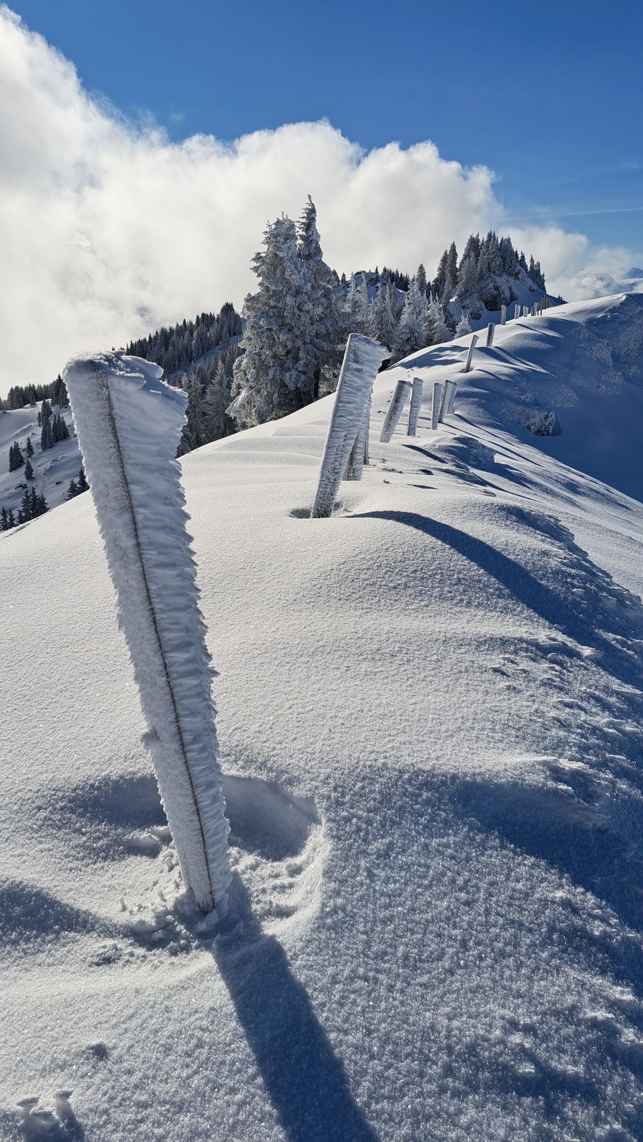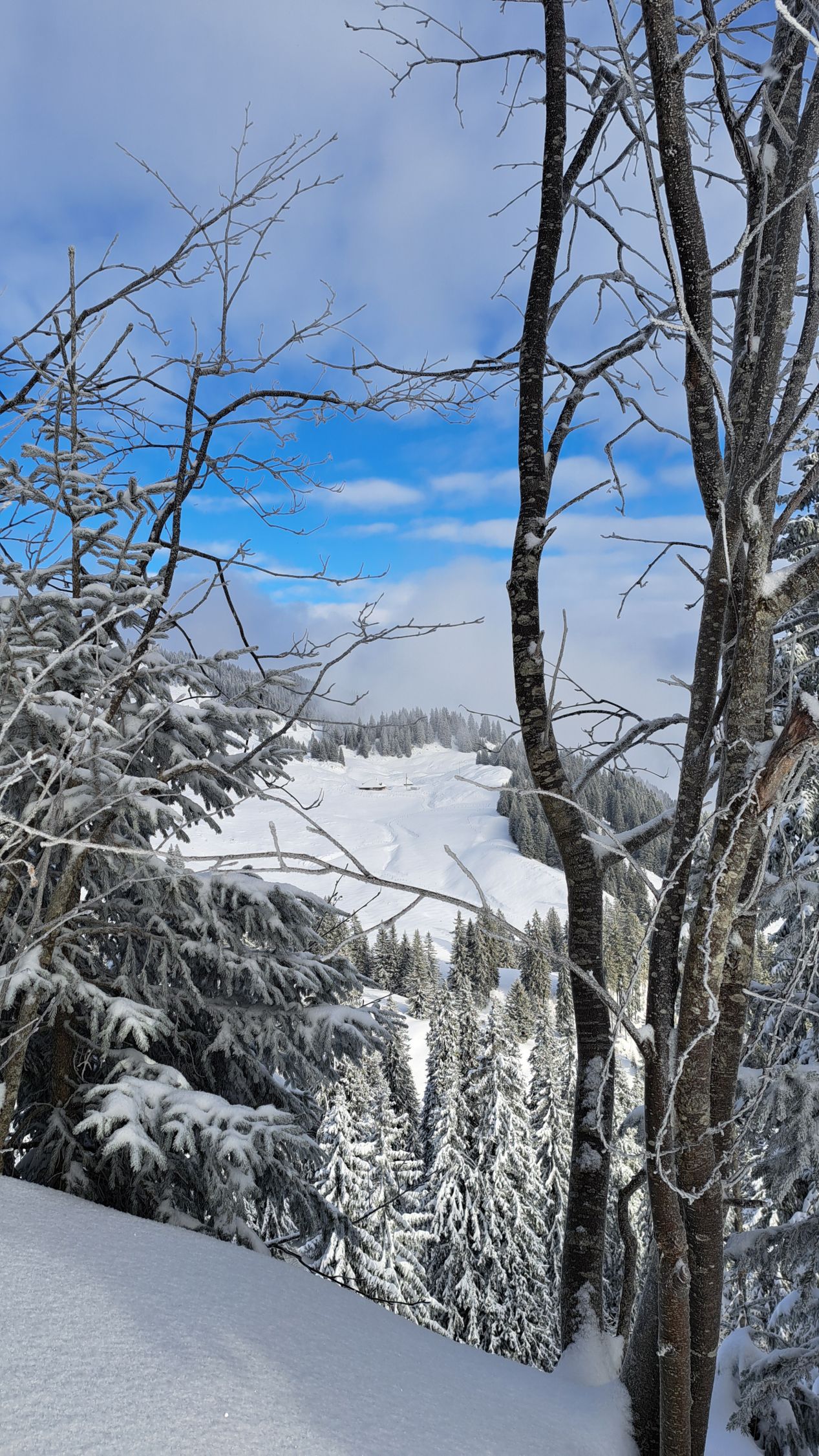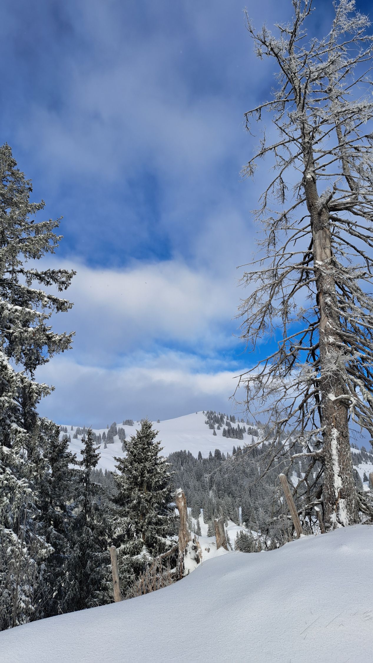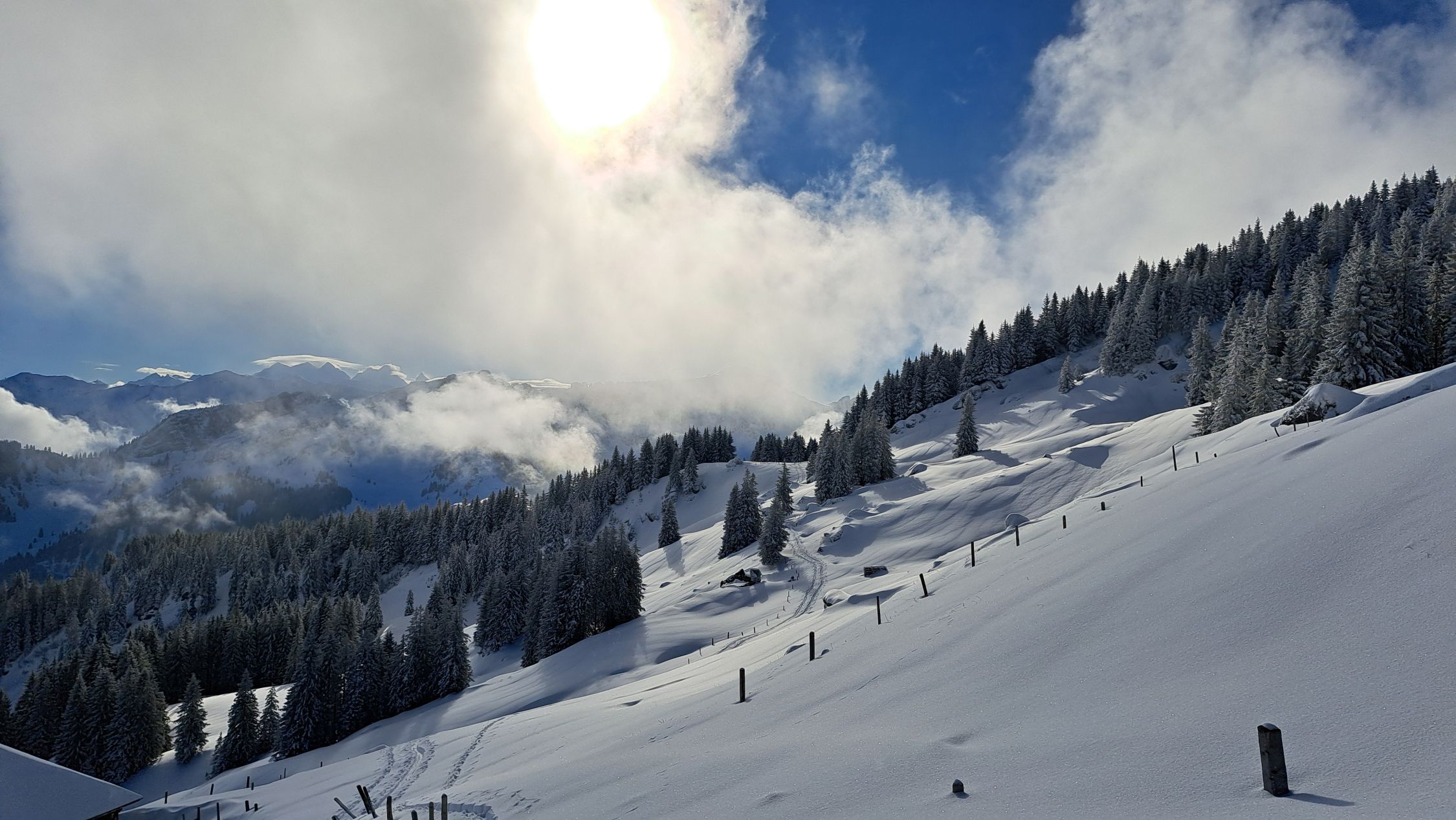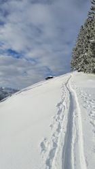 Anfänglich noch leichter Schneefall, dann noch leichter Nebel. Auf halbem Weg lichteten sich die Wolken und die Sonne kam teilweise zum Vorschein. Auf ganzer Strecke lag feinster Pulverschnee. Die Abfahrt war ein Traum! Sehr schön.