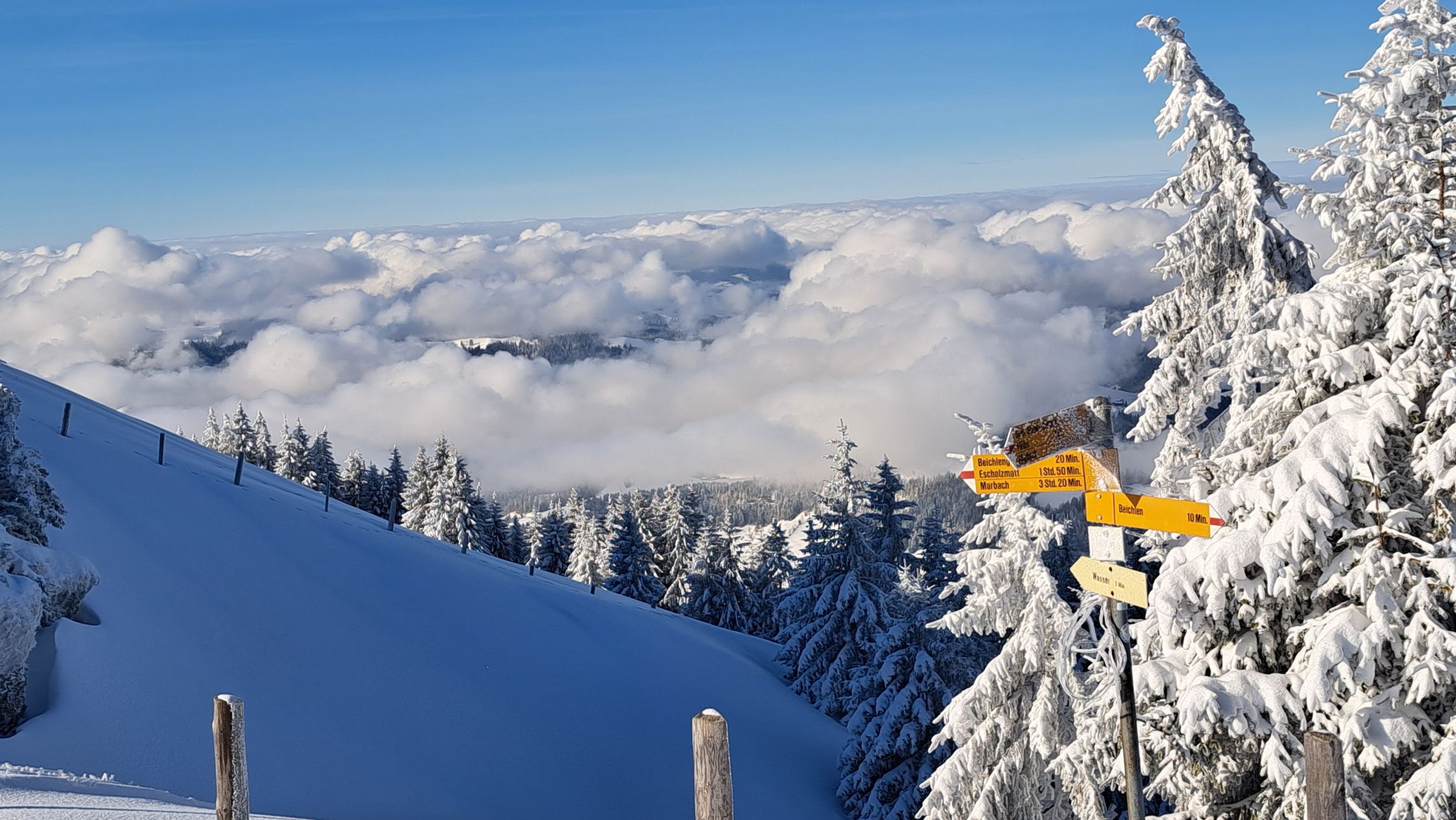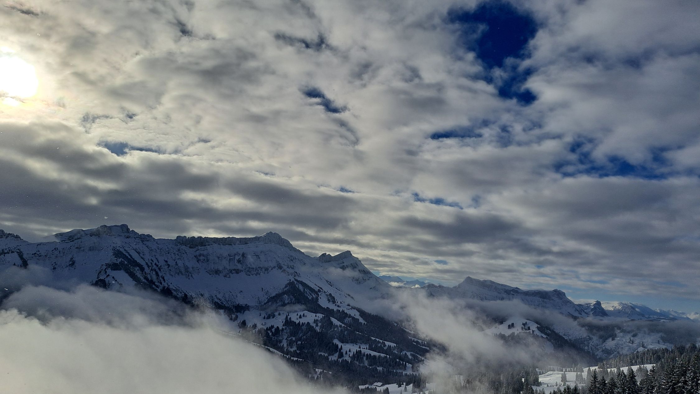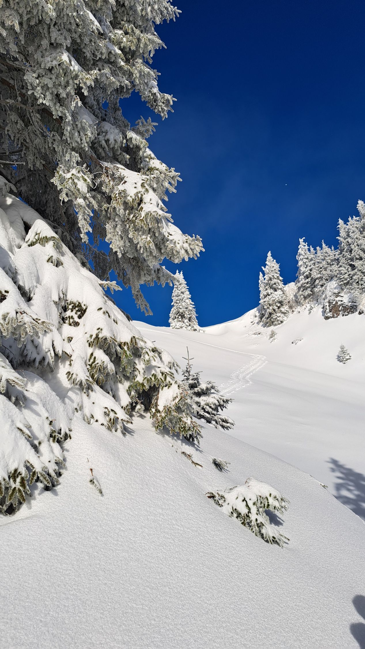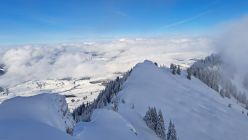 Anfänglich noch leichter Schneefall, dann noch leichter Nebel. Auf halbem Weg lichteten sich die Wolken und die Sonne kam teilweise zum Vorschein. Auf ganzer Strecke lag feinster Pulverschnee. Die Abfahrt war ein Traum! Sehr schön.