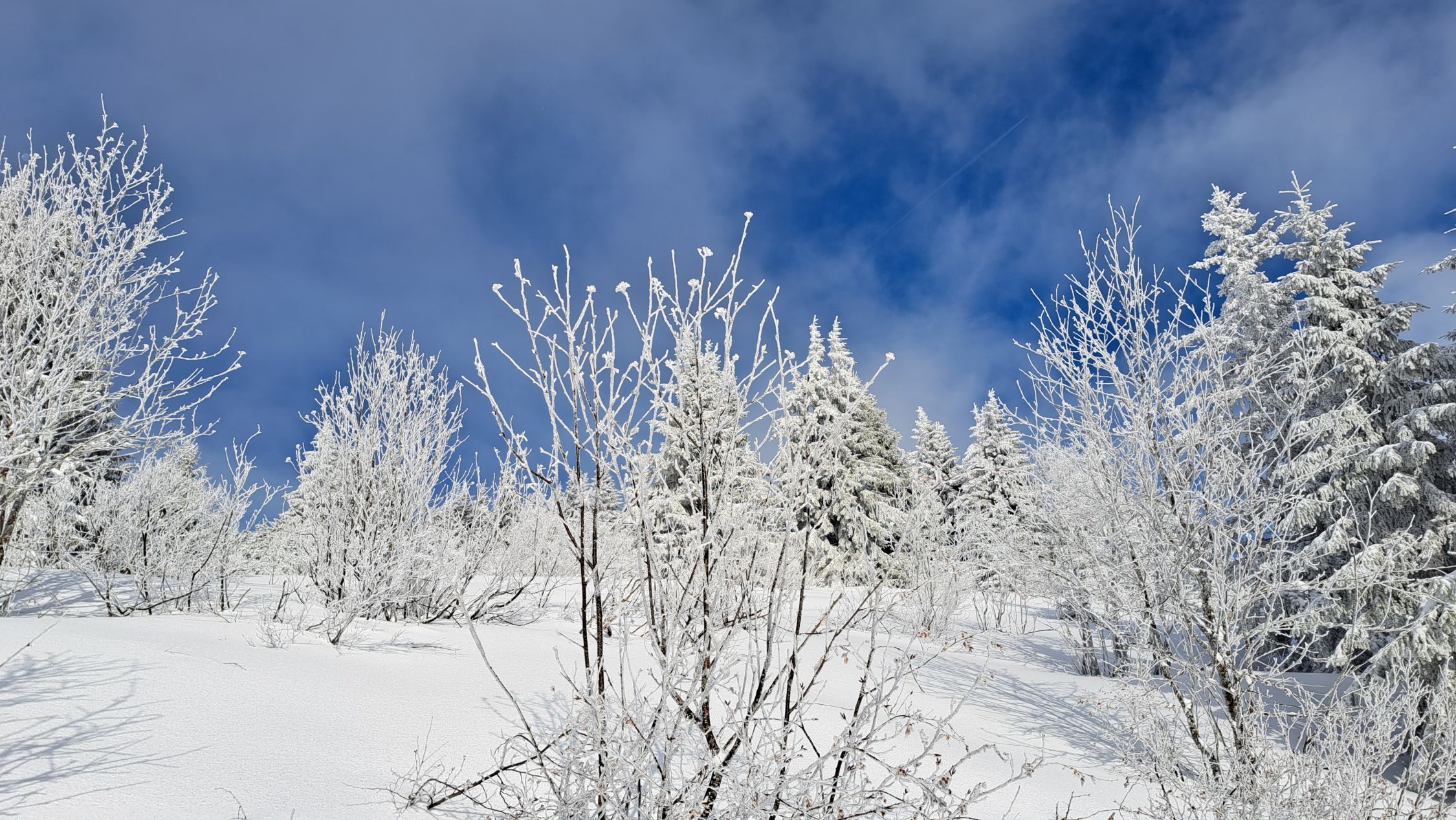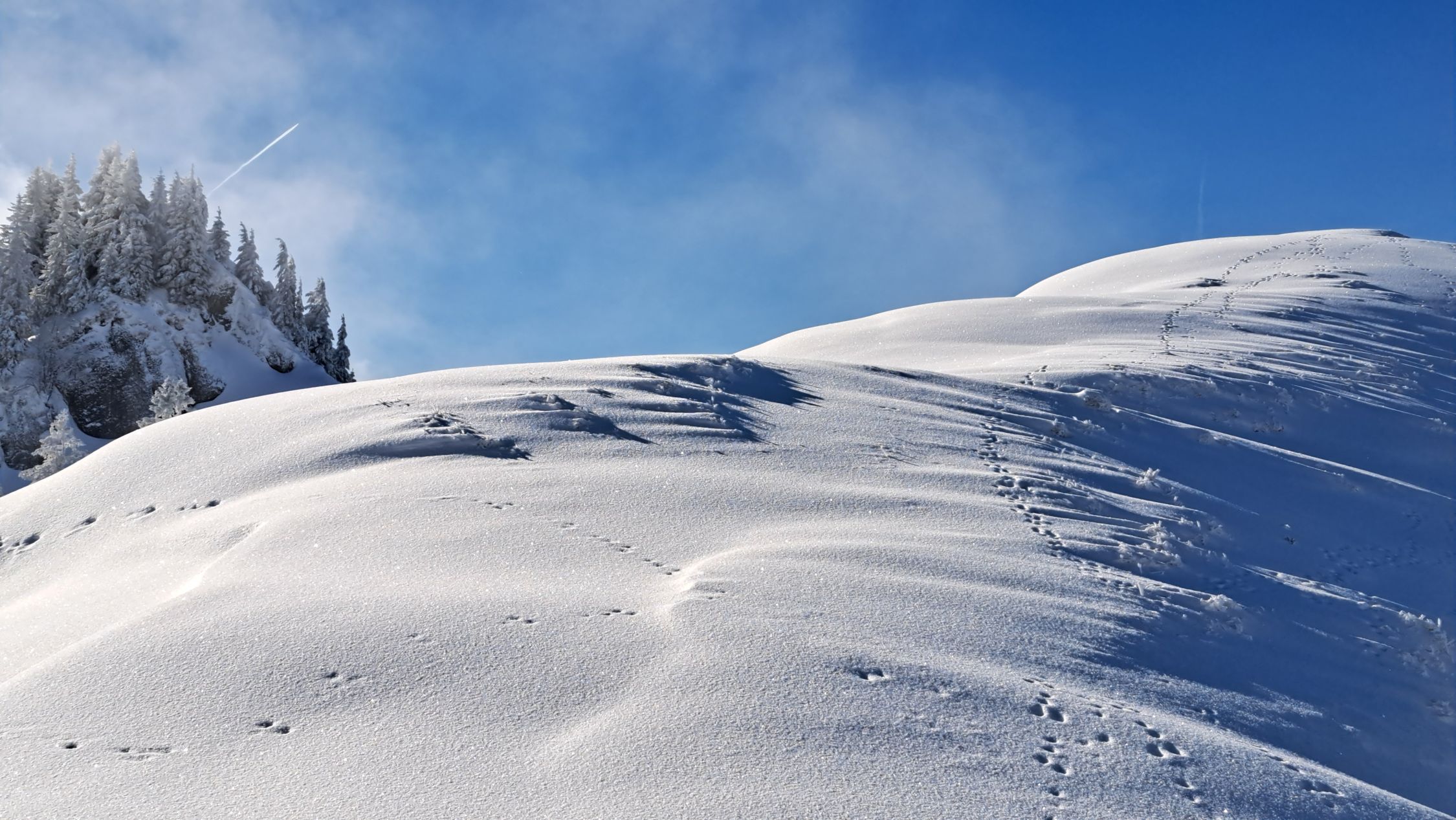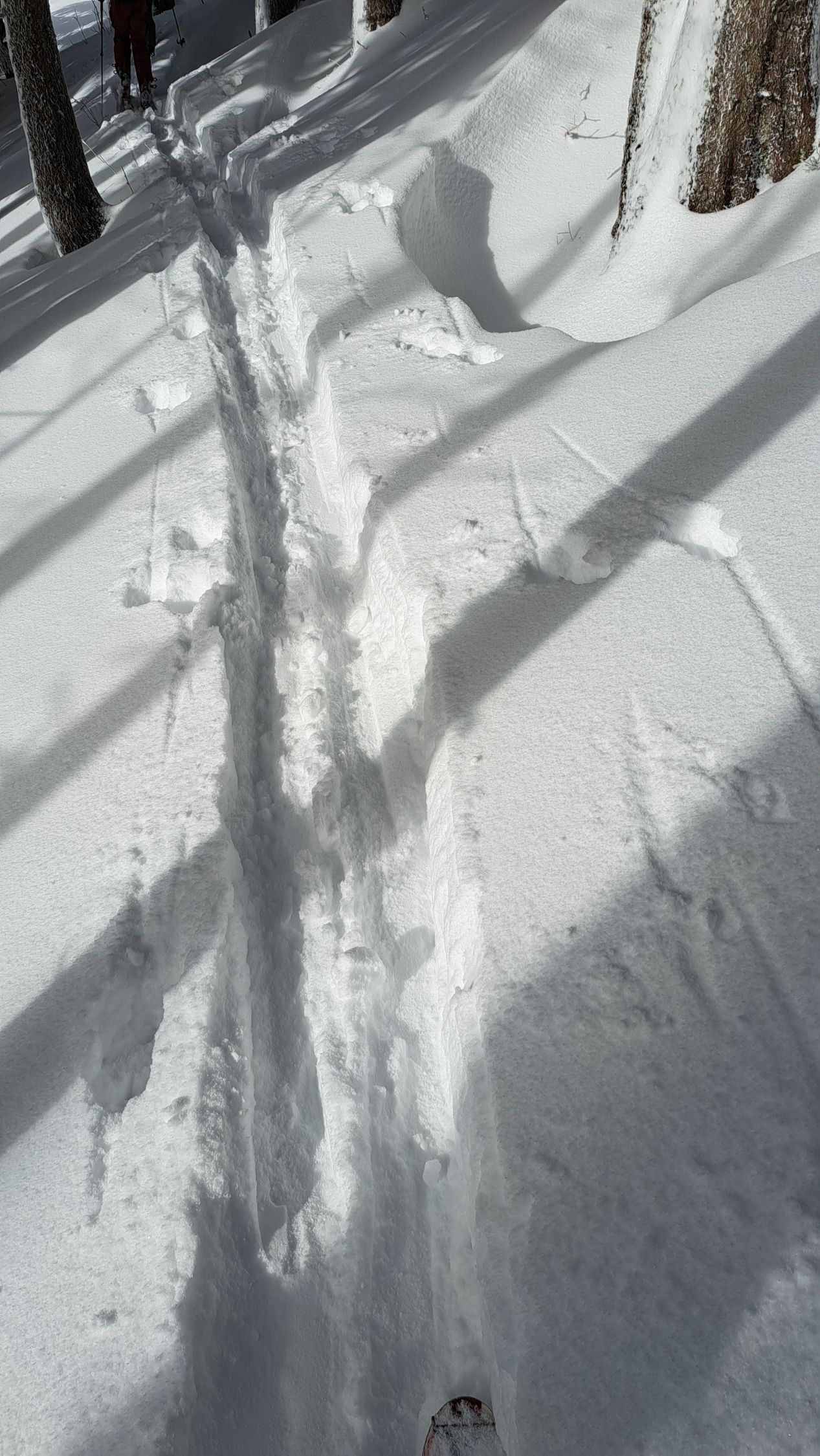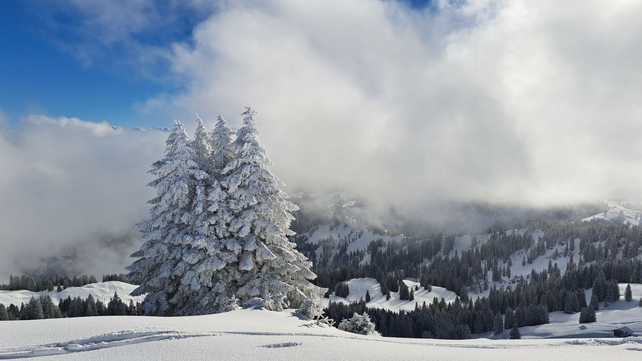 Anfänglich noch leichter Schneefall, dann noch leichter Nebel. Auf halbem Weg lichteten sich die Wolken und die Sonne kam teilweise zum Vorschein. Auf ganzer Strecke lag feinster Pulverschnee. Die Abfahrt war ein Traum! Sehr schön.