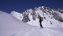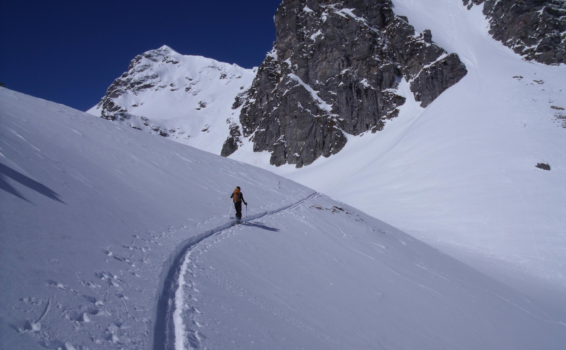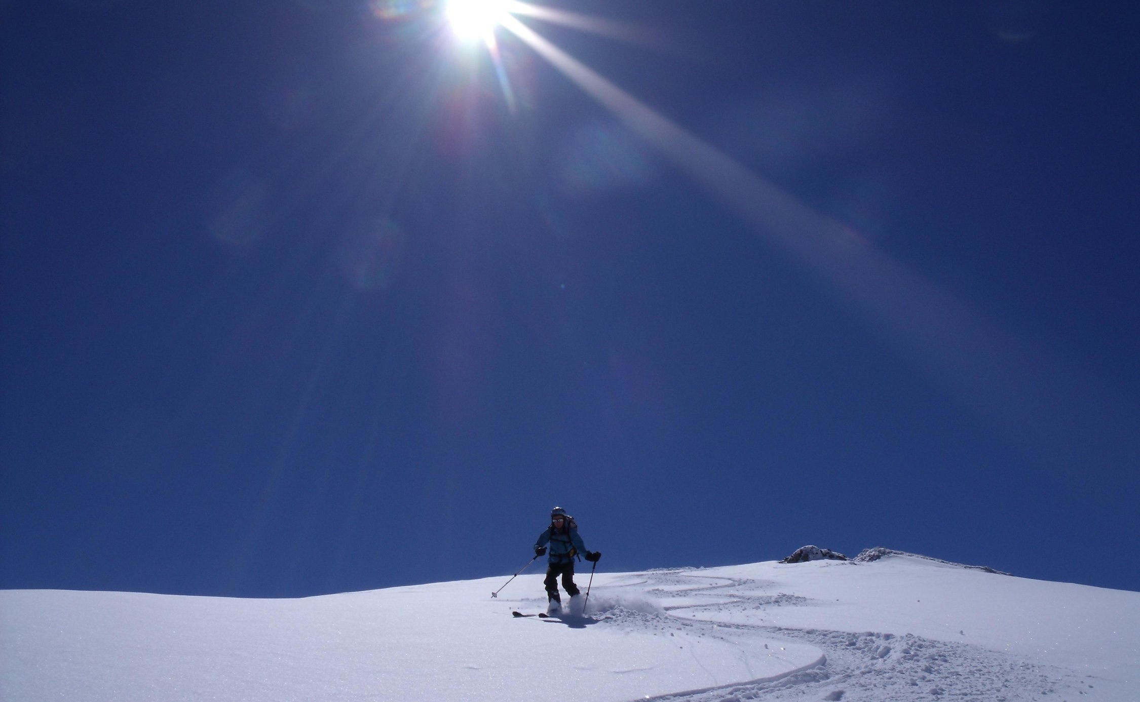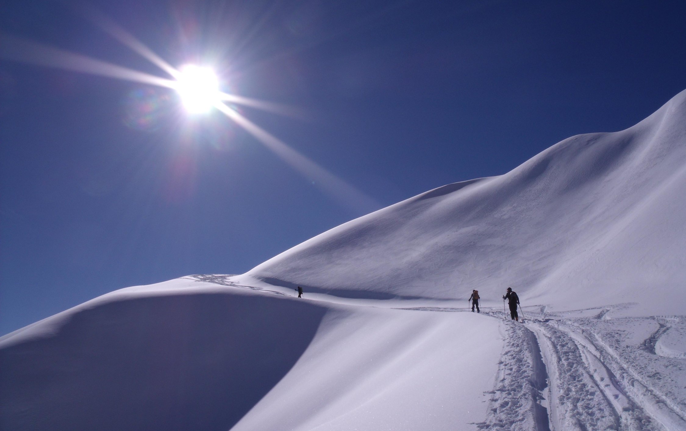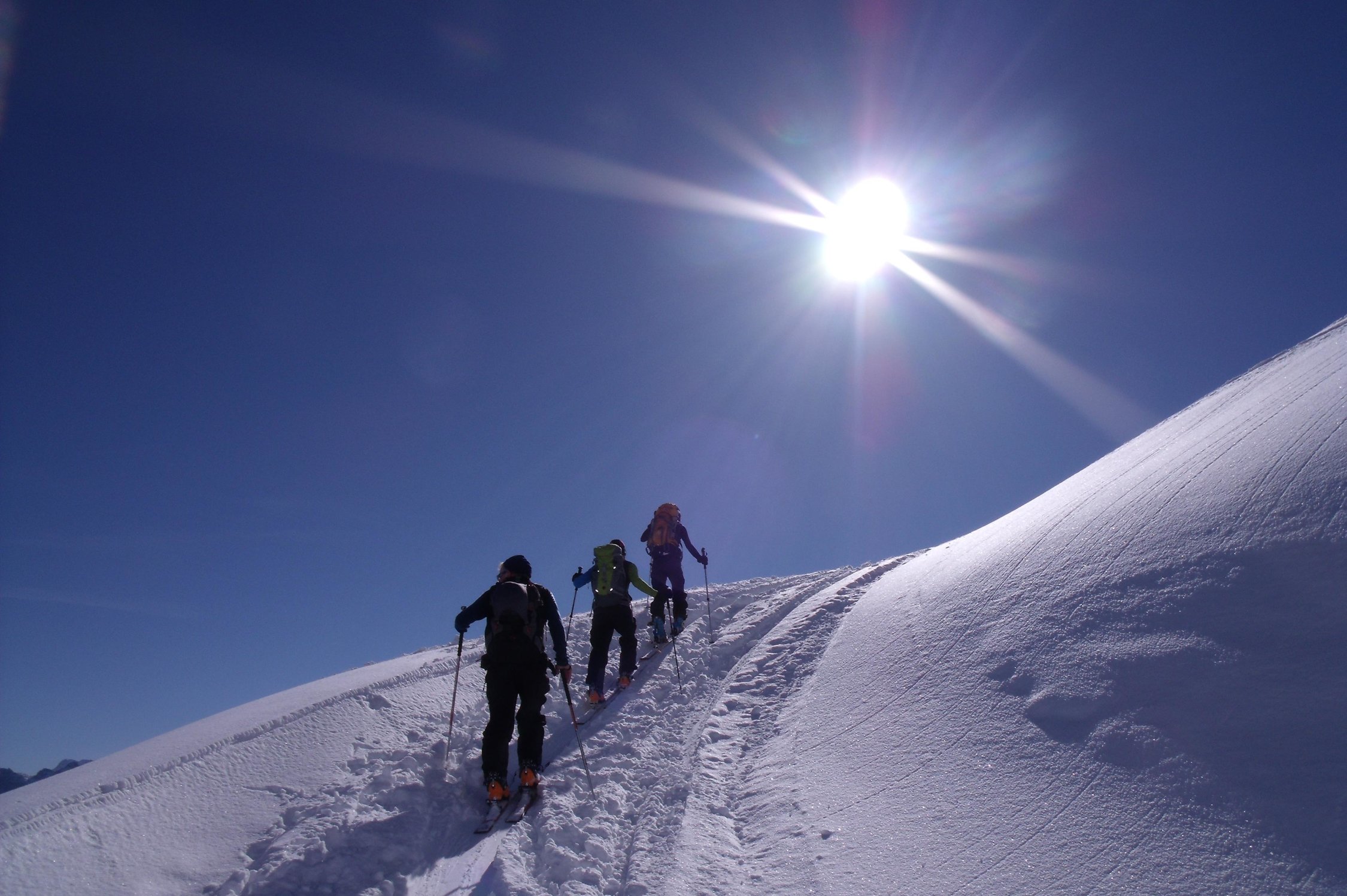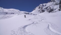 Die Hänge unter dem Dreieck werden wohl bald wieder aper sein. Oben hat es viel Neuschnee gegeben und die Tourenverhältnisse dürften noch eine Weile gut bleiben.