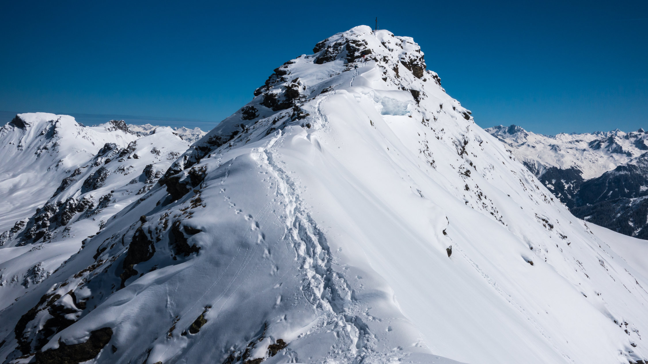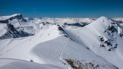 Traumtag, wolkenlos und windstill. In St. Antönien sehr wenig Neuschnee aber ab Startpunkt der verschiedenen Touren überall genügend Schnee. Oben traumhafte, winterliche Verhältnisse mit ca. 50 cm Neuschnee. Start um 8 Uhr bei -10° auf fast tragender Harschkruste. Dadurch relativ leicht zu spuren (wir waren heute die einzigen auf dieser Route) Oben kamen noch ein paar Leute herüber vom St. Antönier Joch (Aufstieg von Gargellen). Die letzten paar Meter zum Gipfel über die Felsen heute etwas heikel. Auf der Abfahrt auf den nach Norden gerichteten Hängen super Pulver, insbesondere die Nordhänge der Gämpiflue. Sonst überall nicht tragender Deckel. Im unteren Teil war der Deckel aufgeweicht und dort konnte man relativ gut durch den Nassschnee pflügen....