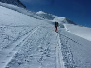 Insgesamt ganz gute Verhältnisse. Ab Allalinpass sehr kalt und windig. Oben am Gipfel allerdings windstill. Schnee ganz akzeptabel.