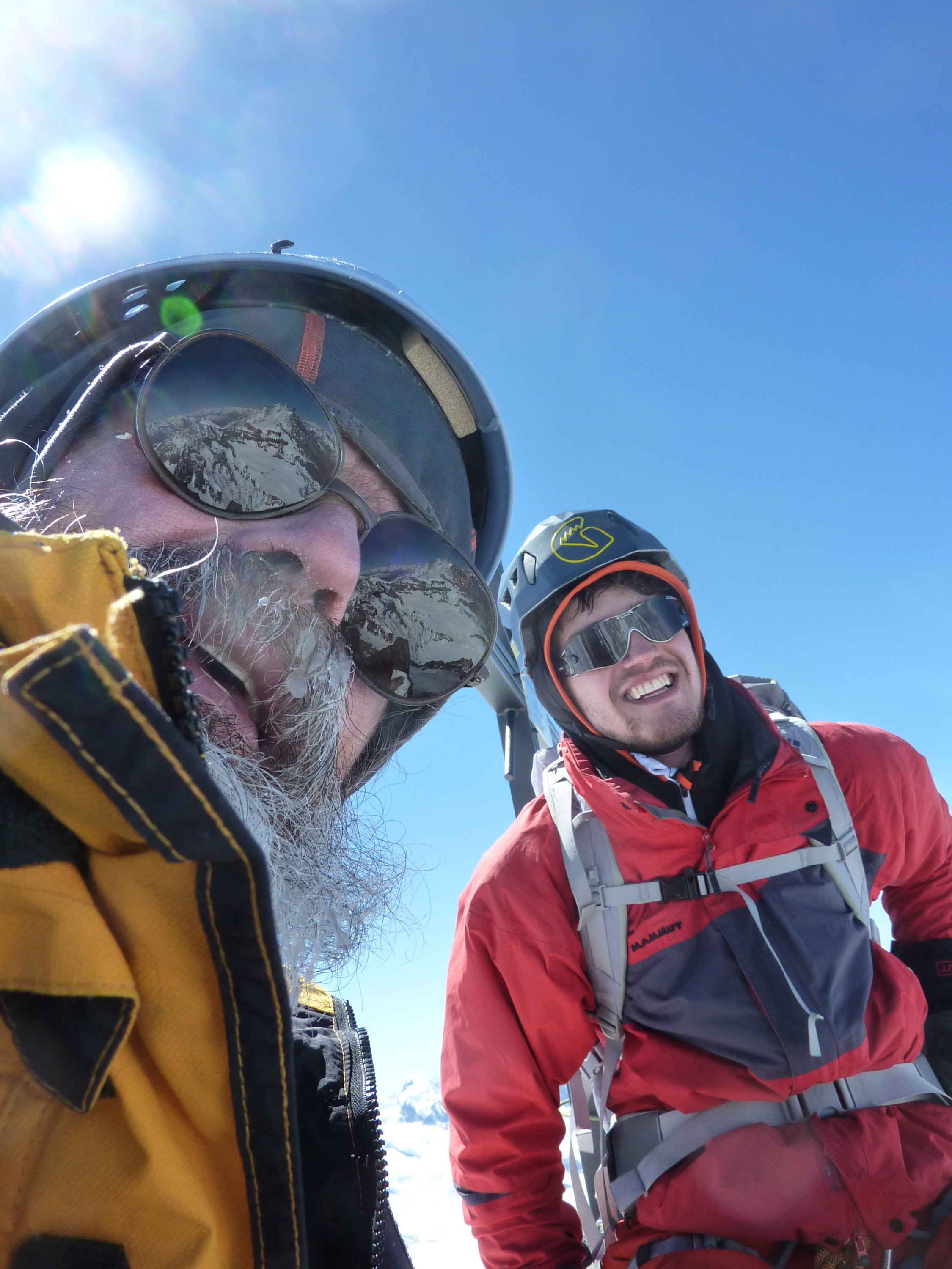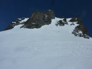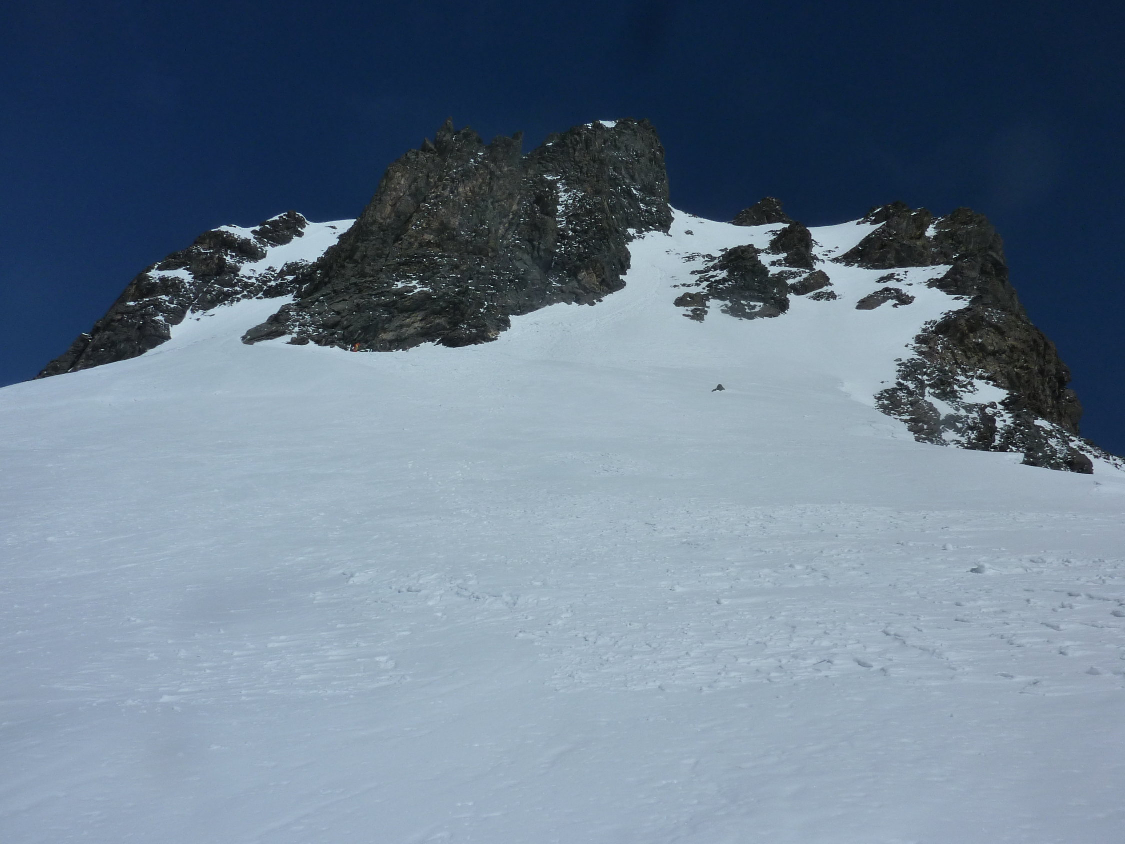 Wir wollten eigentlich die NW-Wand klettern, haben uns aber aufgrund des Windes dagegen entschieden. Sah teilweise blank aus, aber auf der linken Seite fast durchgehend Schnee/Firn.