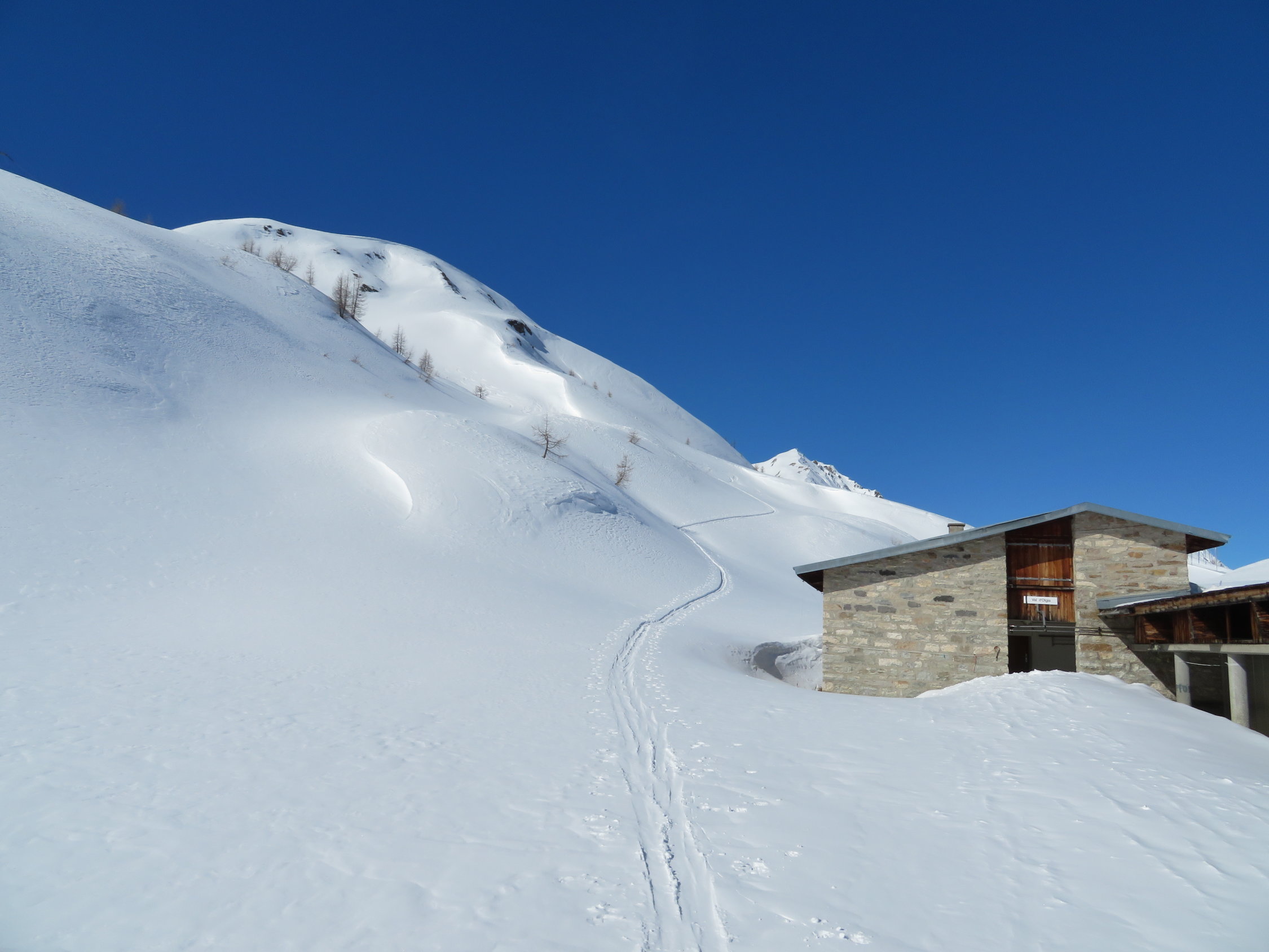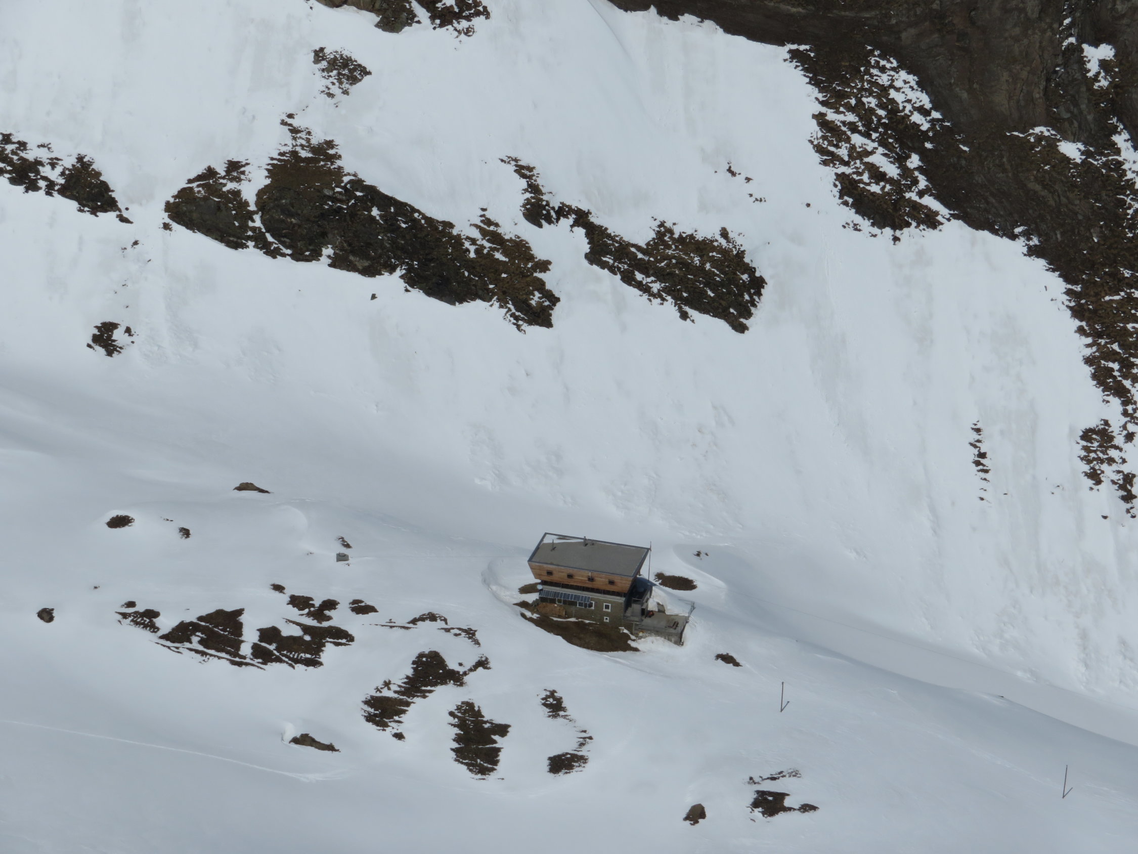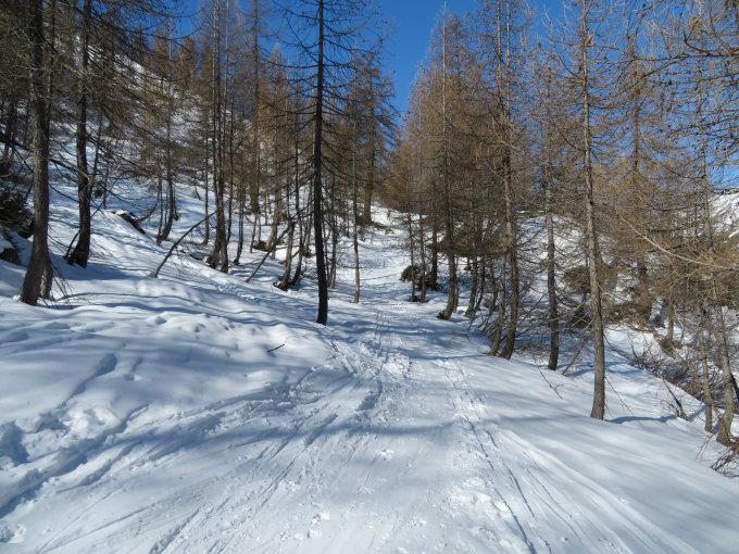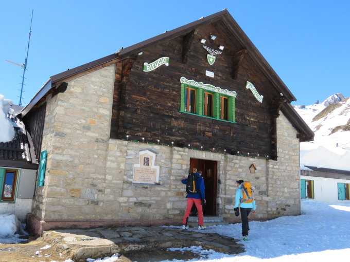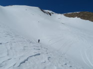 Ab All'Acqua durch den Wald nur 2 Tragpassagen, nachher durchgehend geschlossene Schneedecke. Noch viel Schnee im Gebiet. Nur im Waldstück werden die Tragpassagen ziemlich viel länger. Das haben wir bei der Abfahrt am Samstag gesehen, das geht nun schnell. Aber ab Olgia noch viel Schnee. Gute Spur zum Gipfel. Abfahrt in schwerem Schnee. Wir sind ins Rif. Maria Luisa und am nächsten Tag auf den Basodino.